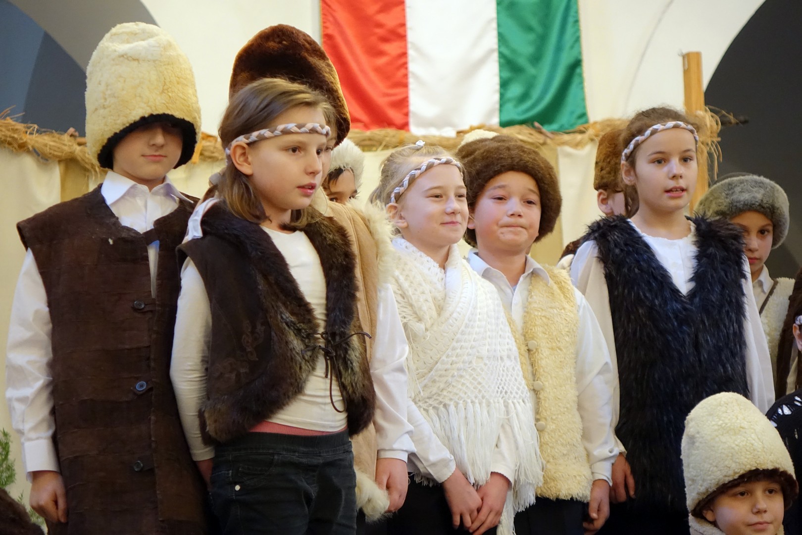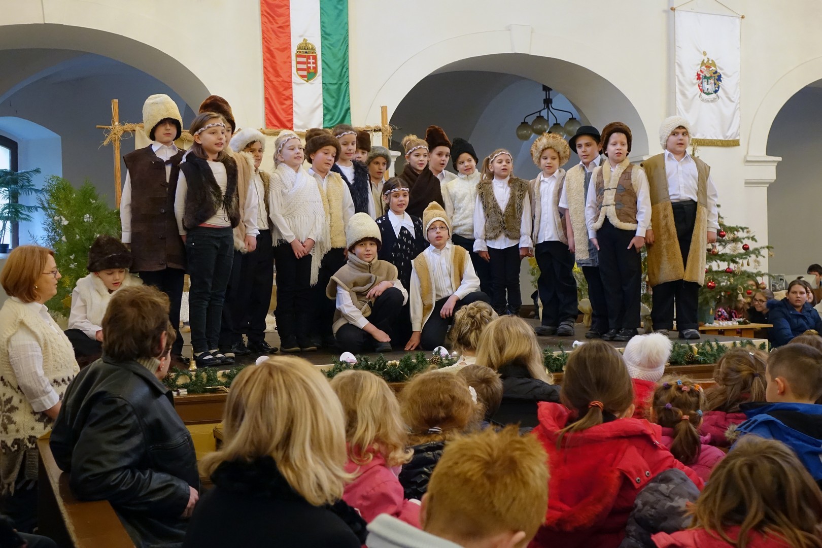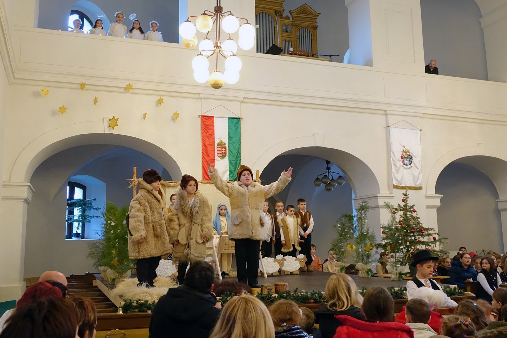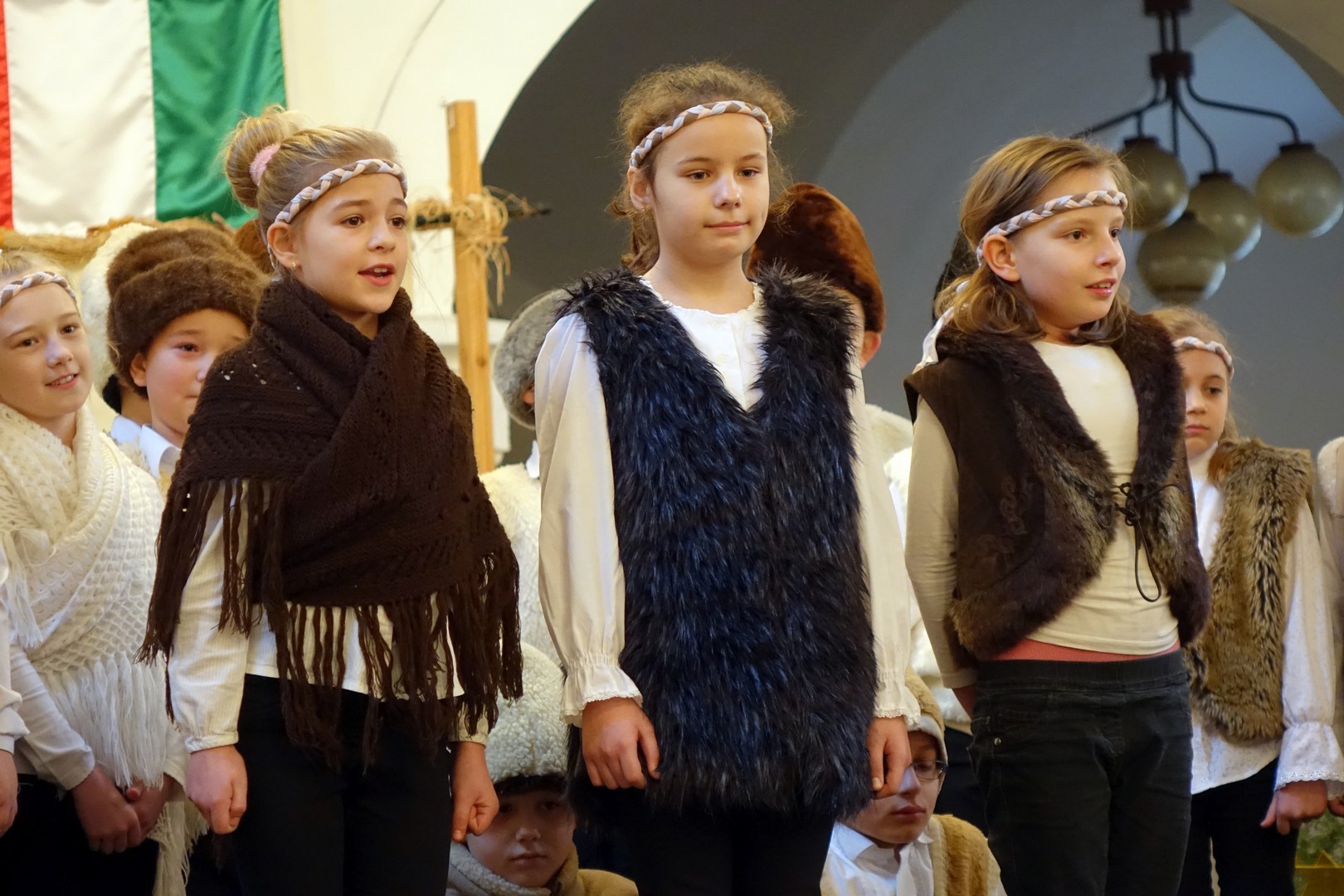 A trombitaszó után vándorló „pásztorokra” lehettünk figyelmesek, akik útjuk során meg-megállva egészen „Betlehemig” ballagtak. A bundákat és süvegeket viselő nebulók ünnepi énekekkel és versekkel kedveskedtek nekünk, melyeket – vékony hangjaikon – oly erőteljesen szavaltak, hogy valósággal zengett tőlük a templom.