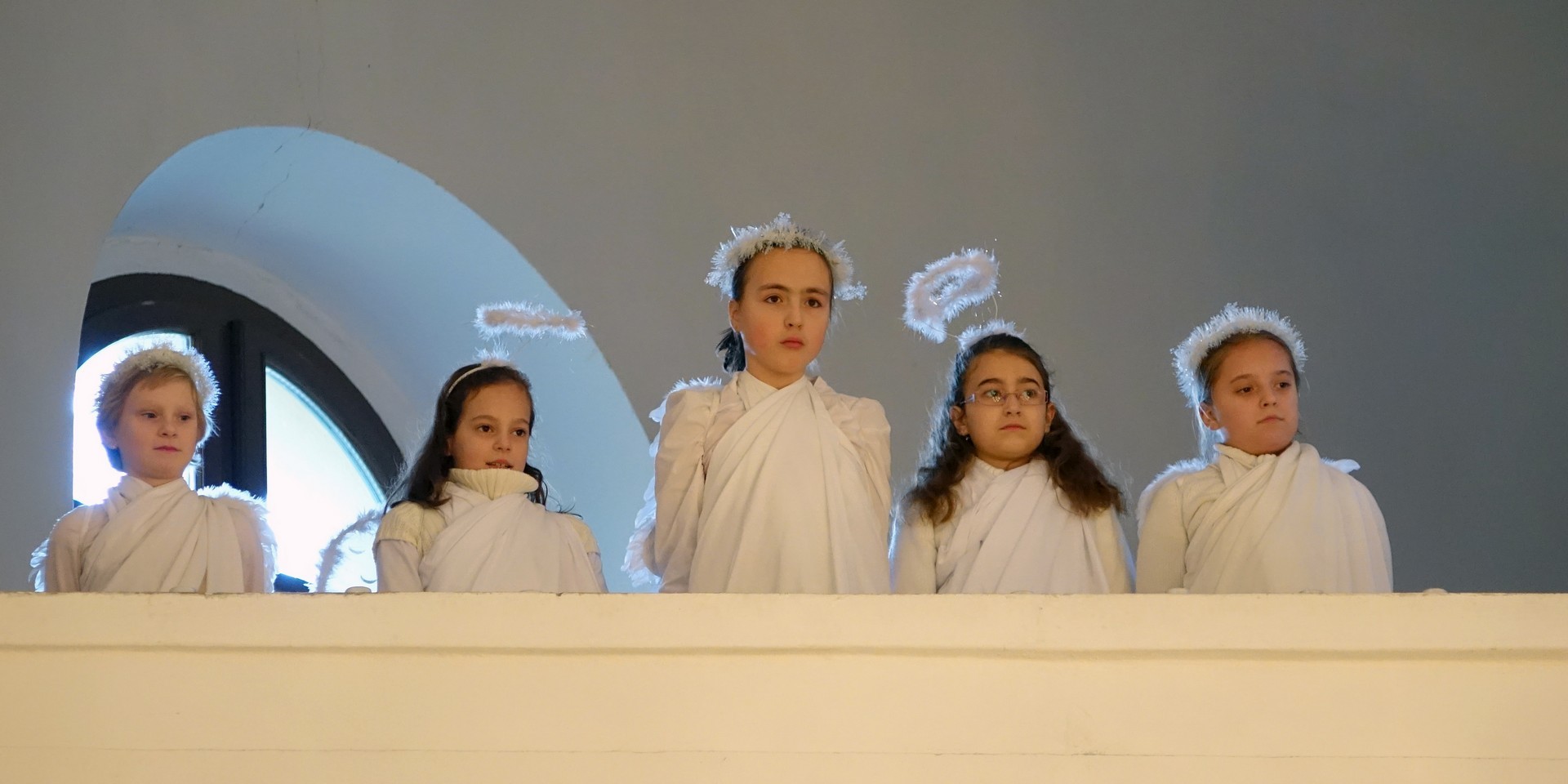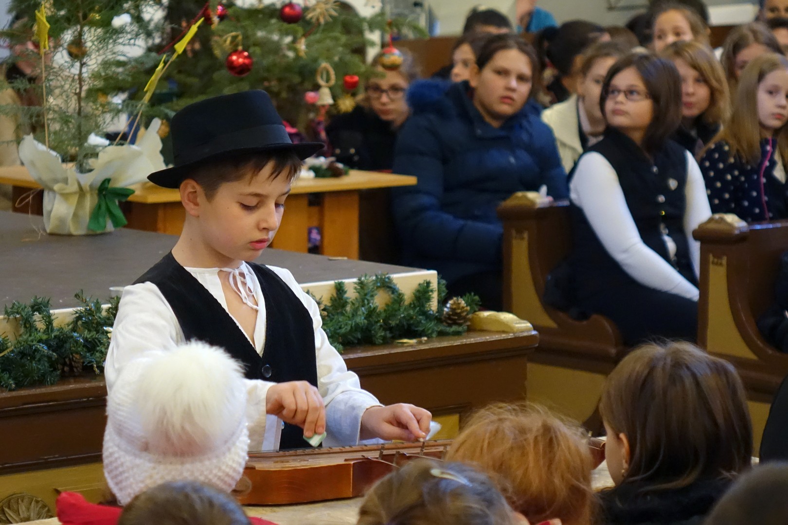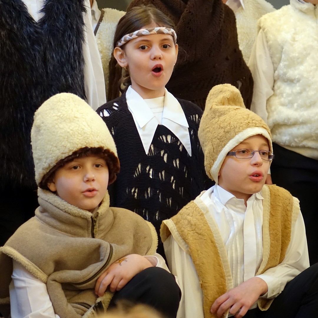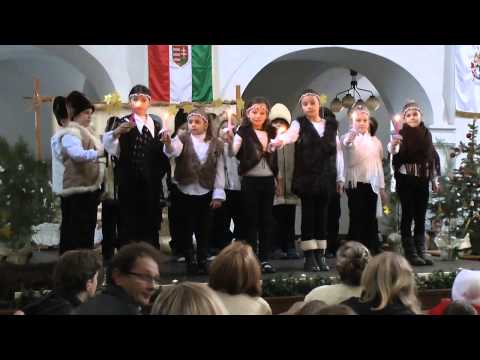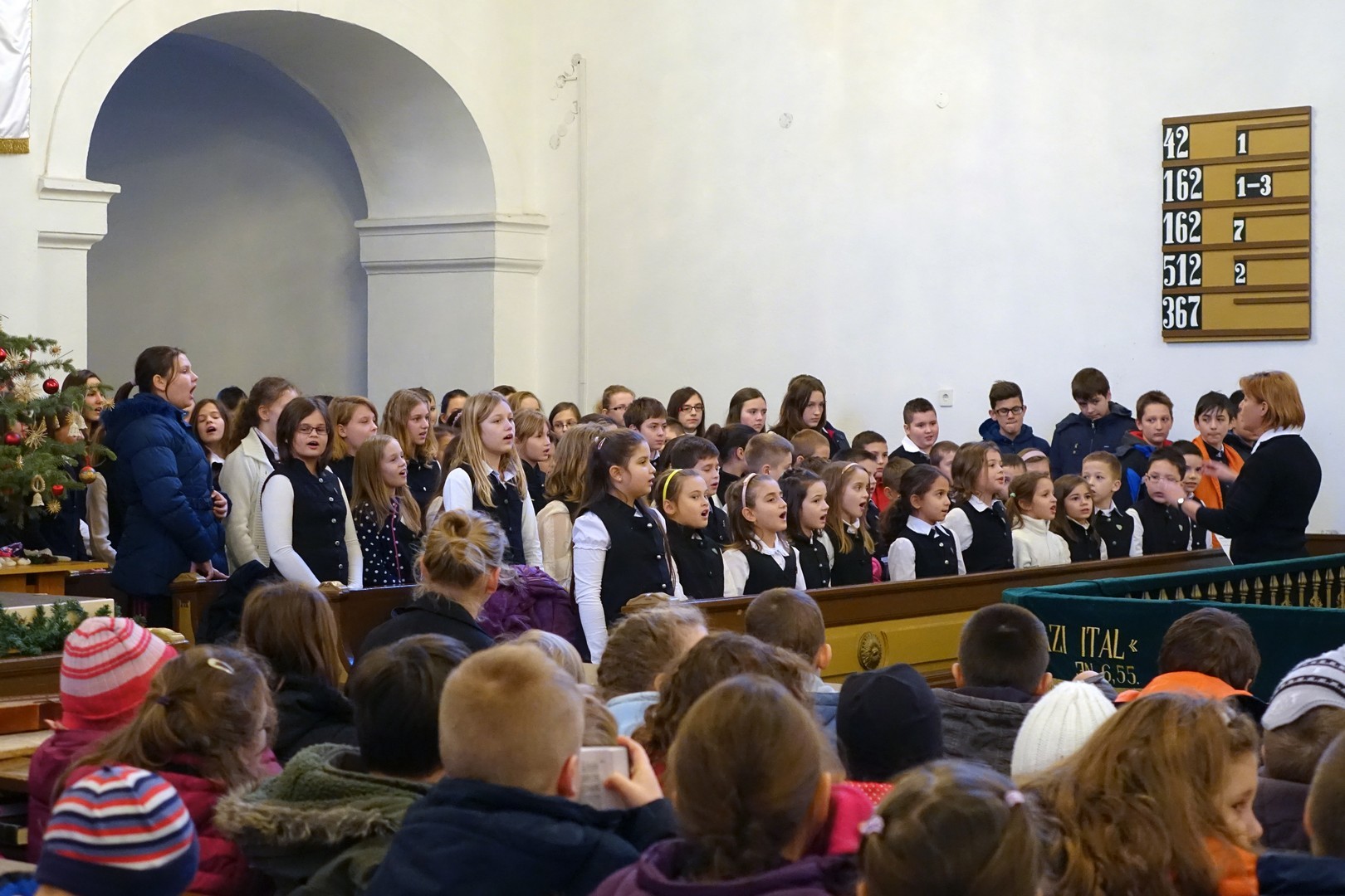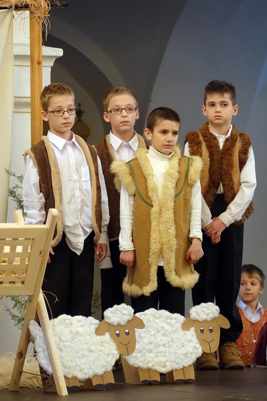 A trombitaszó után vándorló „pásztorokra” lehettünk figyelmesek, akik útjuk során meg-megállva egészen „Betlehemig” ballagtak. A bundákat és süvegeket viselő nebulók ünnepi énekekkel és versekkel kedveskedtek nekünk, melyeket – vékony hangjaikon – oly erőteljesen szavaltak, hogy valósággal zengett tőlük a templom.