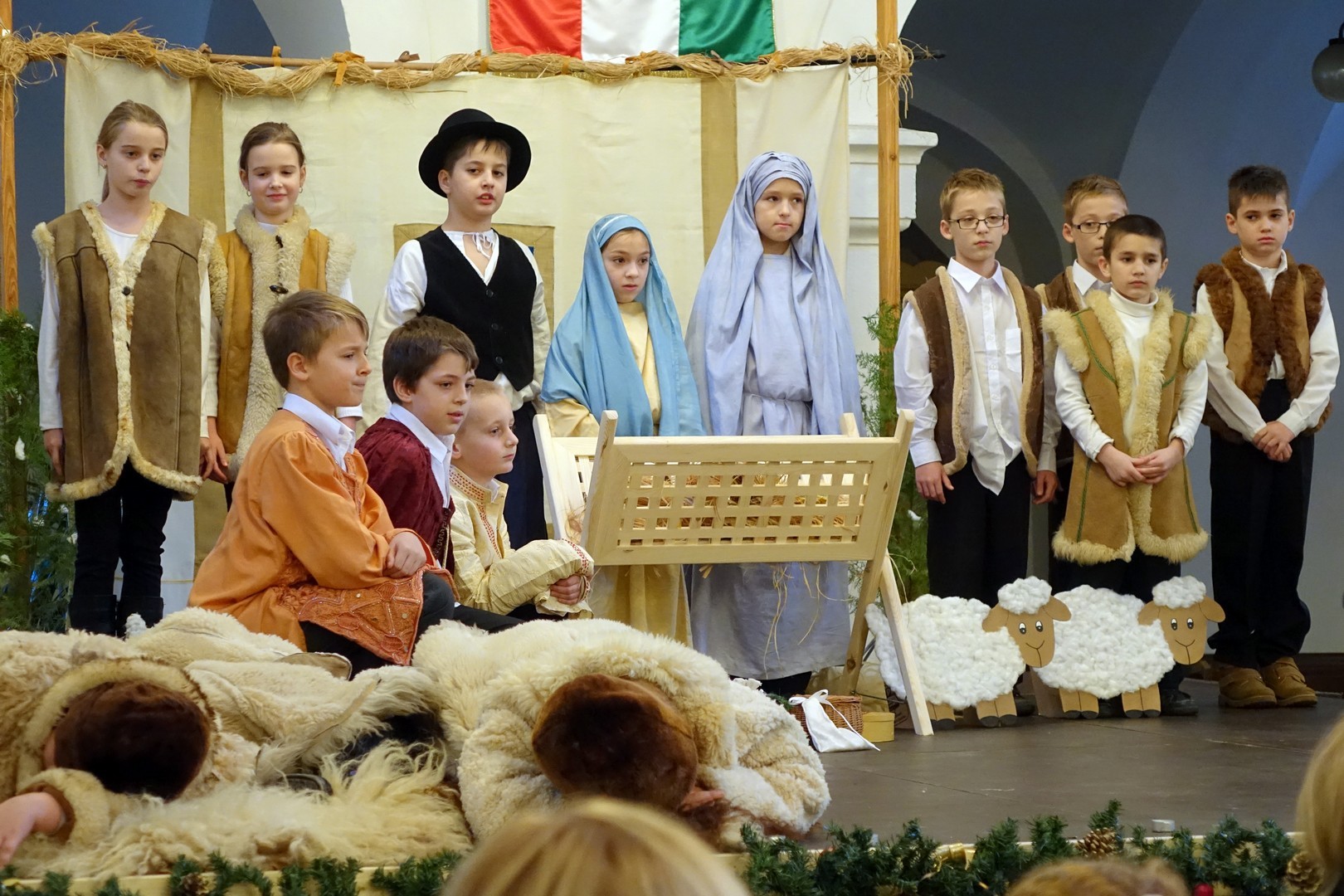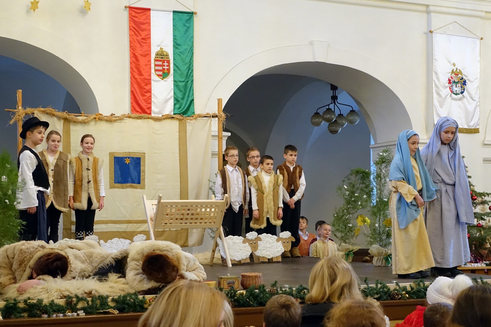 Ezután újabb diákcsapat lépett a színpadra, melynek tagjai az első Szentkarácsony estét, József és Mária betlehemi történetét idézték fel. Jelenetükben pásztorok és bölcsek vonultak a bárányokkal őrzött jászolhoz, miközben odafönt, a karzaton angyalok glóriái csillantak meg.