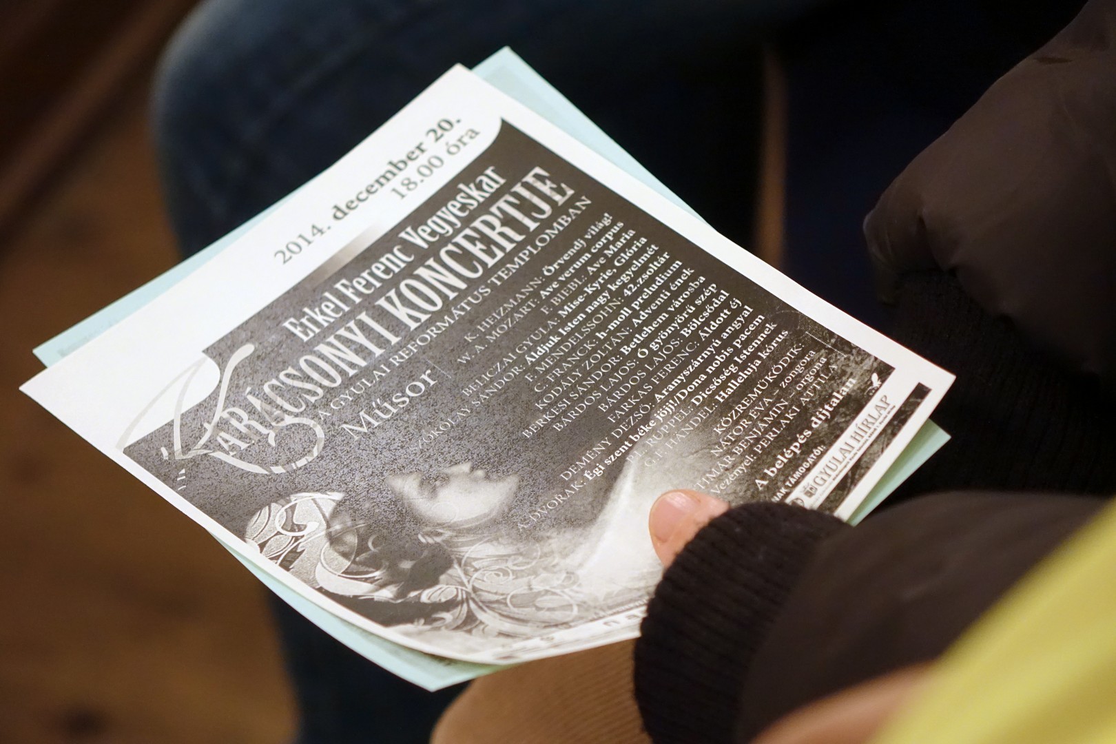 Egy tűt sem lehetett leejteni, annyira megtelt a református templom az Erkel Ferenc Vegyes Kar december 20-i karácsonyi koncertjén. Beköszöntőként Klaus Heizmannak, a modern egyházi zene kiemelkedő alakjának, Örvendj világ kezdetű, karácsonyi témájú dala hangzott el. Ezt követően Szatmáriné Nagy Éva, a kórus titkára megköszönte Gyula város közönségének egész évi lelkes támogatását, majd elmondta, hogy szeretnének az eddigi színvonal emelésével megfelelni az elvárásoknak. A műsor előtt Hegedűs István gyulavári református lelkipásztor, kórustag karácsonyi gondolatait hallhatta a közönség.