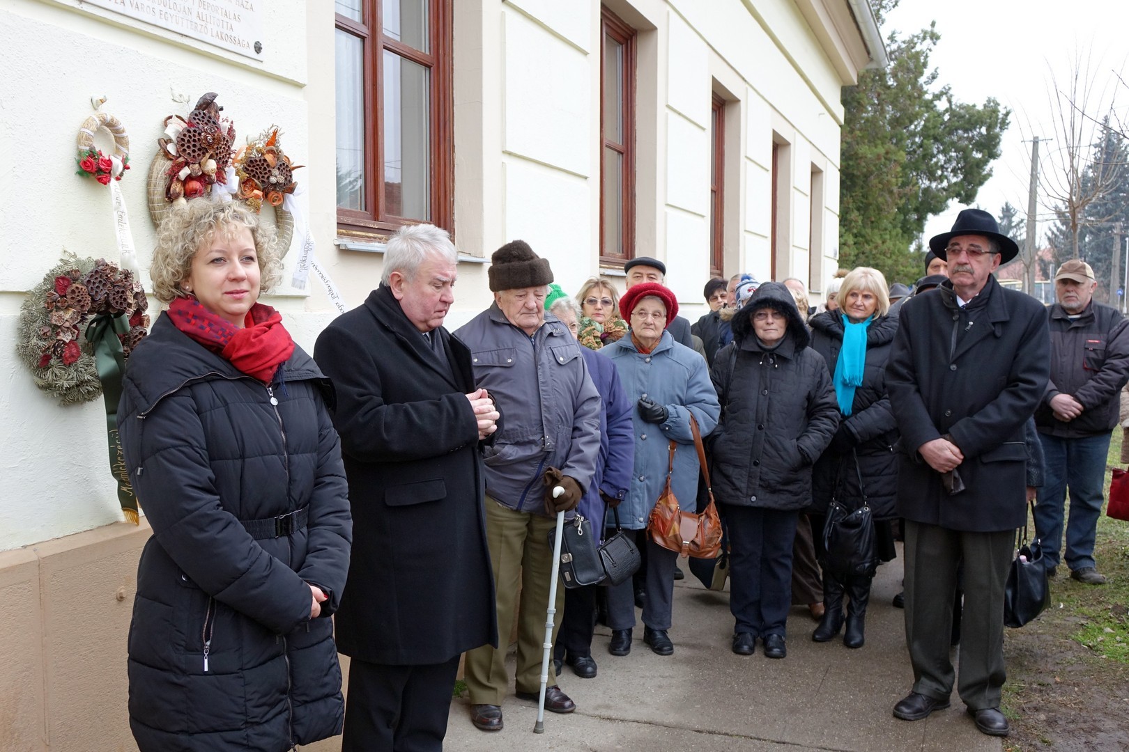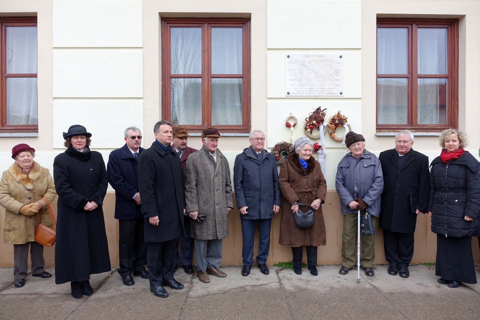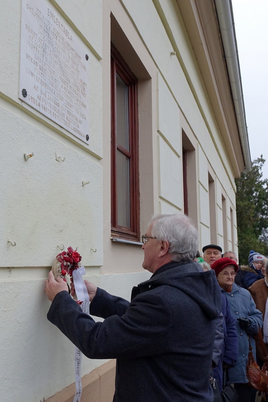 A beszéd után a jelenlévők elhelyezték koszorúikat a volt kaszárnya falára, hiszen egykoron ebben az épületben gyűjtötték össze az 1600 Békés megyei embert.