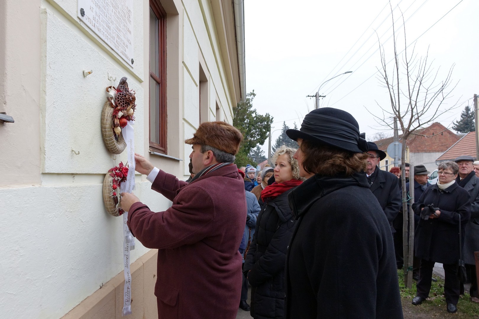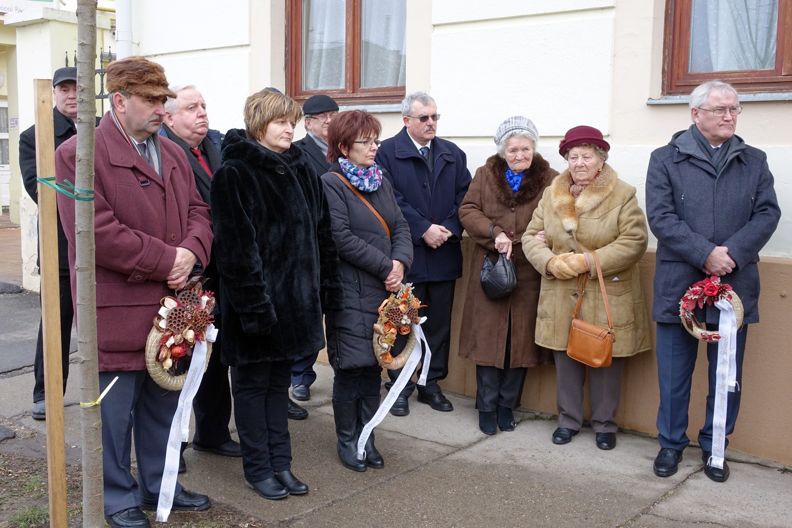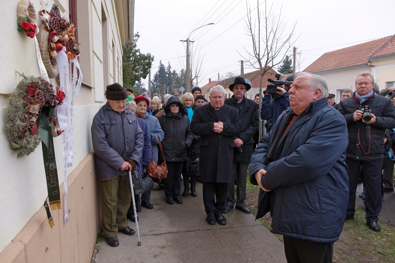 A beszéd után a jelenlévők elhelyezték koszorúikat a volt kaszárnya falára, hiszen egykoron ebben az épületben gyűjtötték össze az 1600 Békés megyei embert.