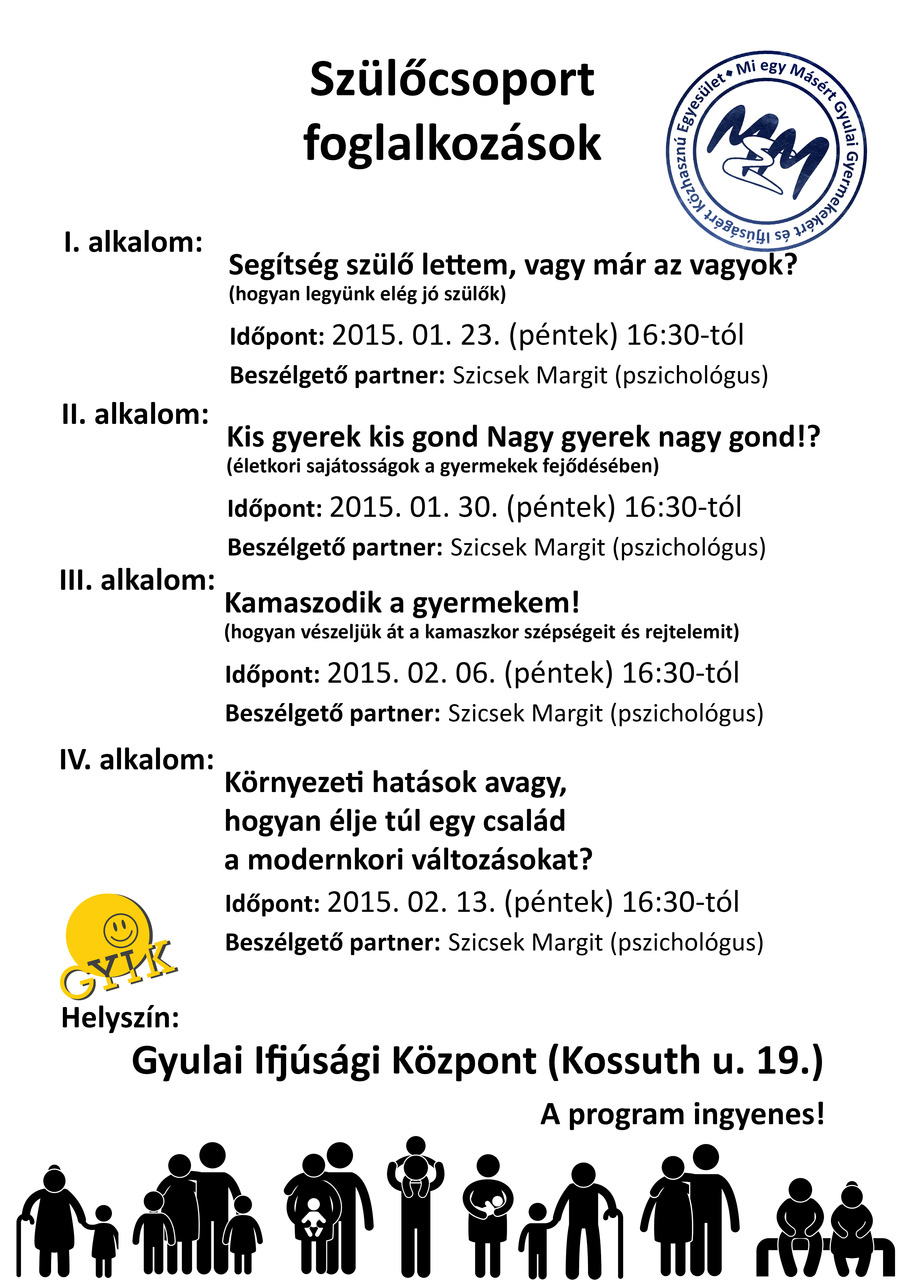 A Mi Egy Másért Közhasznú Egyesület és a Gyulai Ifjúsági Központ munkatársai minden érdeklődőt szívesen látnak a szülőcsoport-foglalkozásokon, melynek első találkozója január 23-án 16 óra 30 perckor kezdődik a Gyulai Ifjúsági Központban (Kossuth utca 19.). A foglalkozás a Segítség szülő lettem, vagy már az vagyok? címet viseli, melynek keretében Szicsek Margit pszichológus lesz a beszélgető partner.