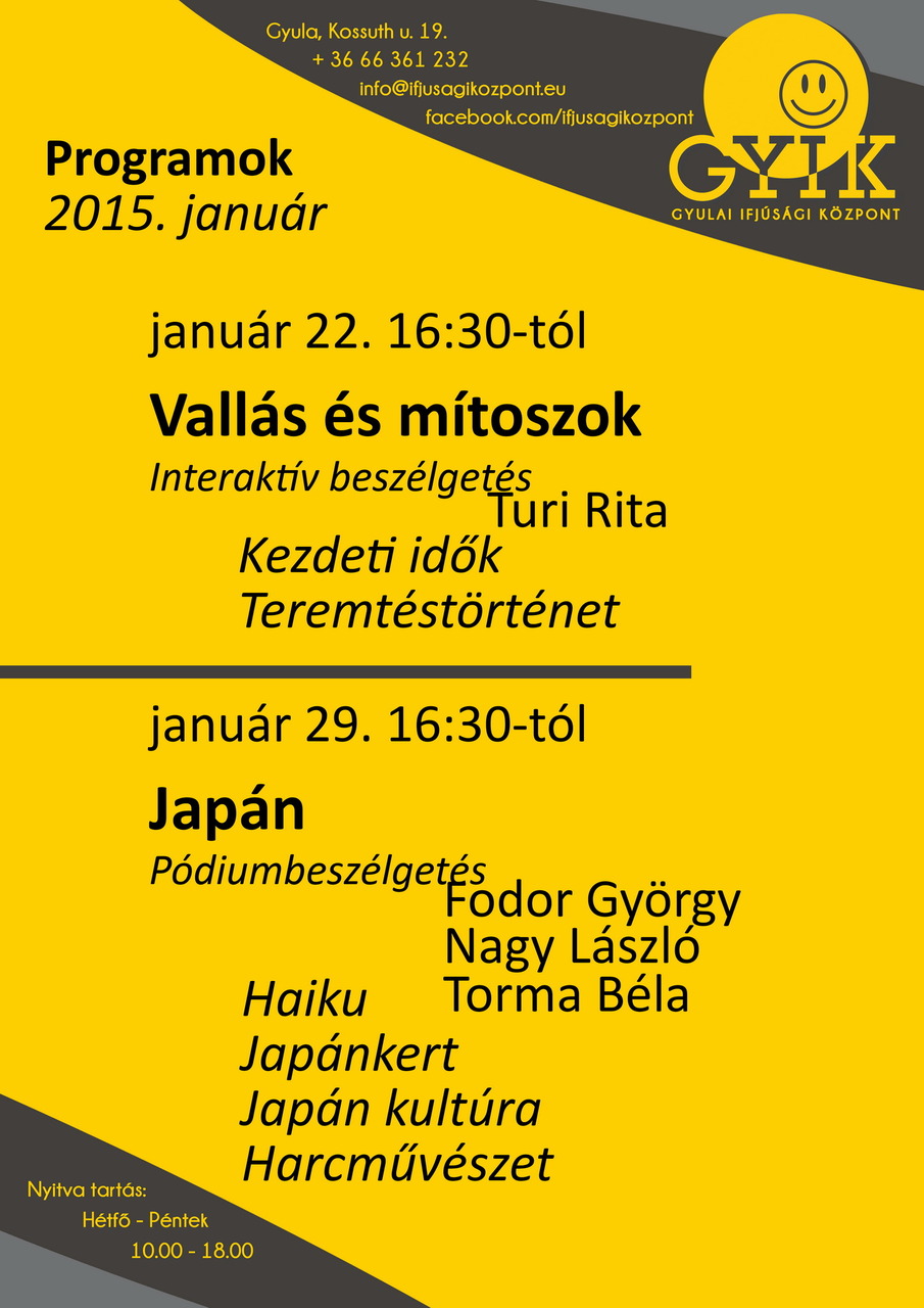 Az egyesület elnöke kifejtette, a programok megvalósítása során igyekeznek különböző témákat felsorakoztatni, és ezáltal feltérképezni azt, hogy egyáltalán melyek azok a kérdések, amelyek érdeklik és vonzzák a fiatalokat. Ezen belül terveznek január 22-én 16.30-tól egy kerekasztal jellegű önálló, mitikus témájú beszélgetéssorozatot Vallás és mítoszok címmel, ami bizonyos értelemben kissé fantasy jellegű lesz, ám mégis az egyébként leírt vallási szövegek és mítoszok feldolgozására épül majd. Minden második héten pódiumbeszélgetéseket rendeznek majd, mely során változatos témákban 2-3 meghívott vendég eszmecseréjét követhetik nyomon a jelenlévők.