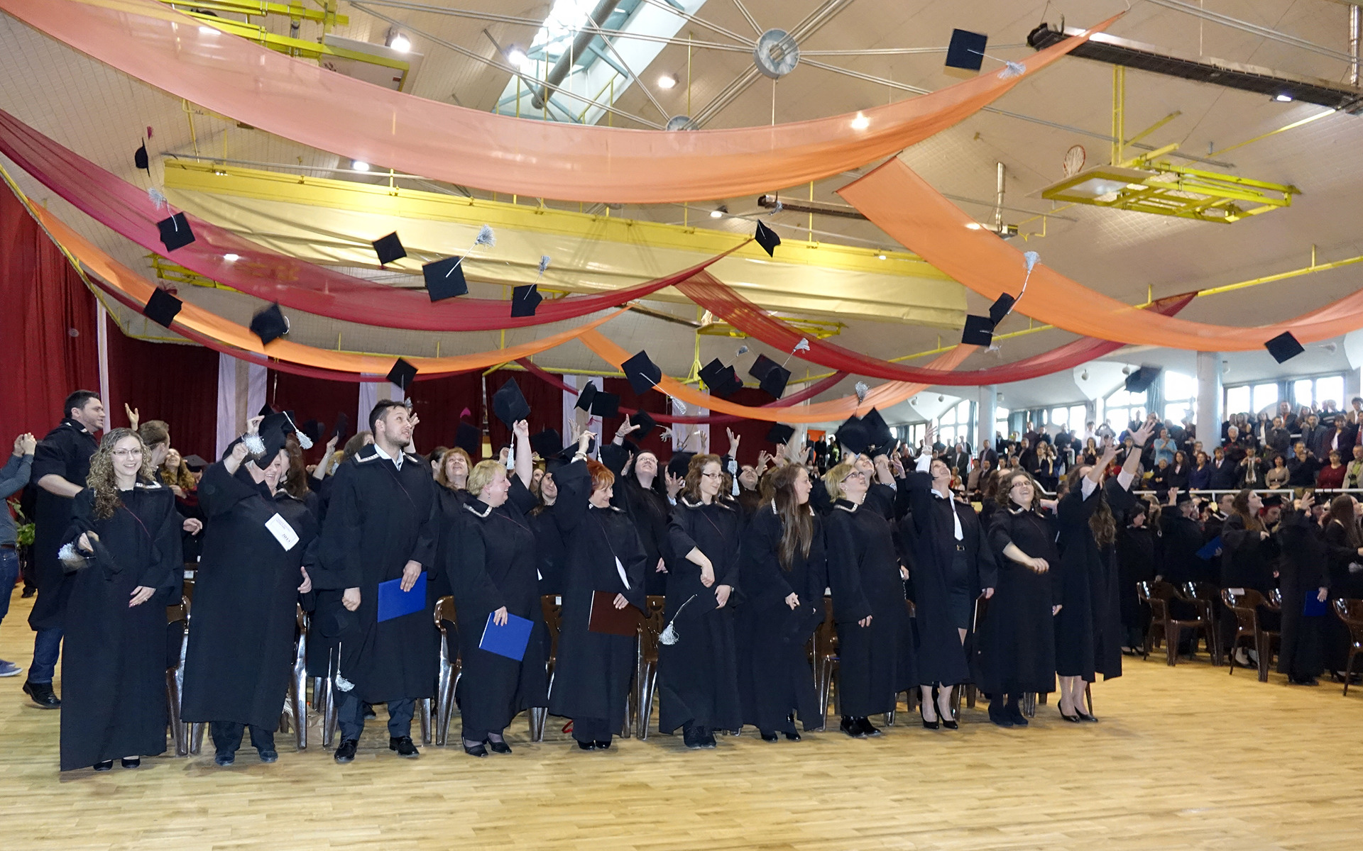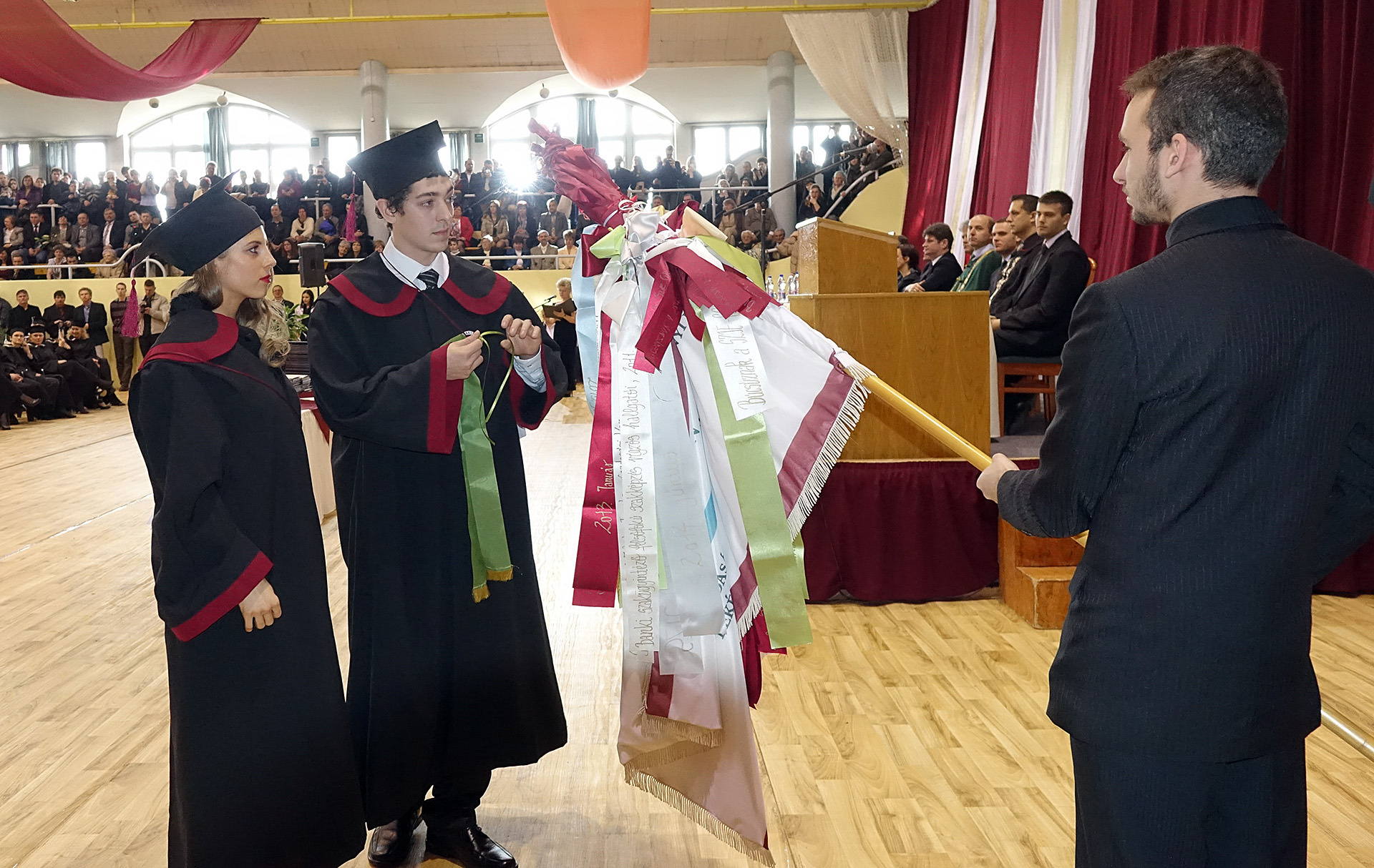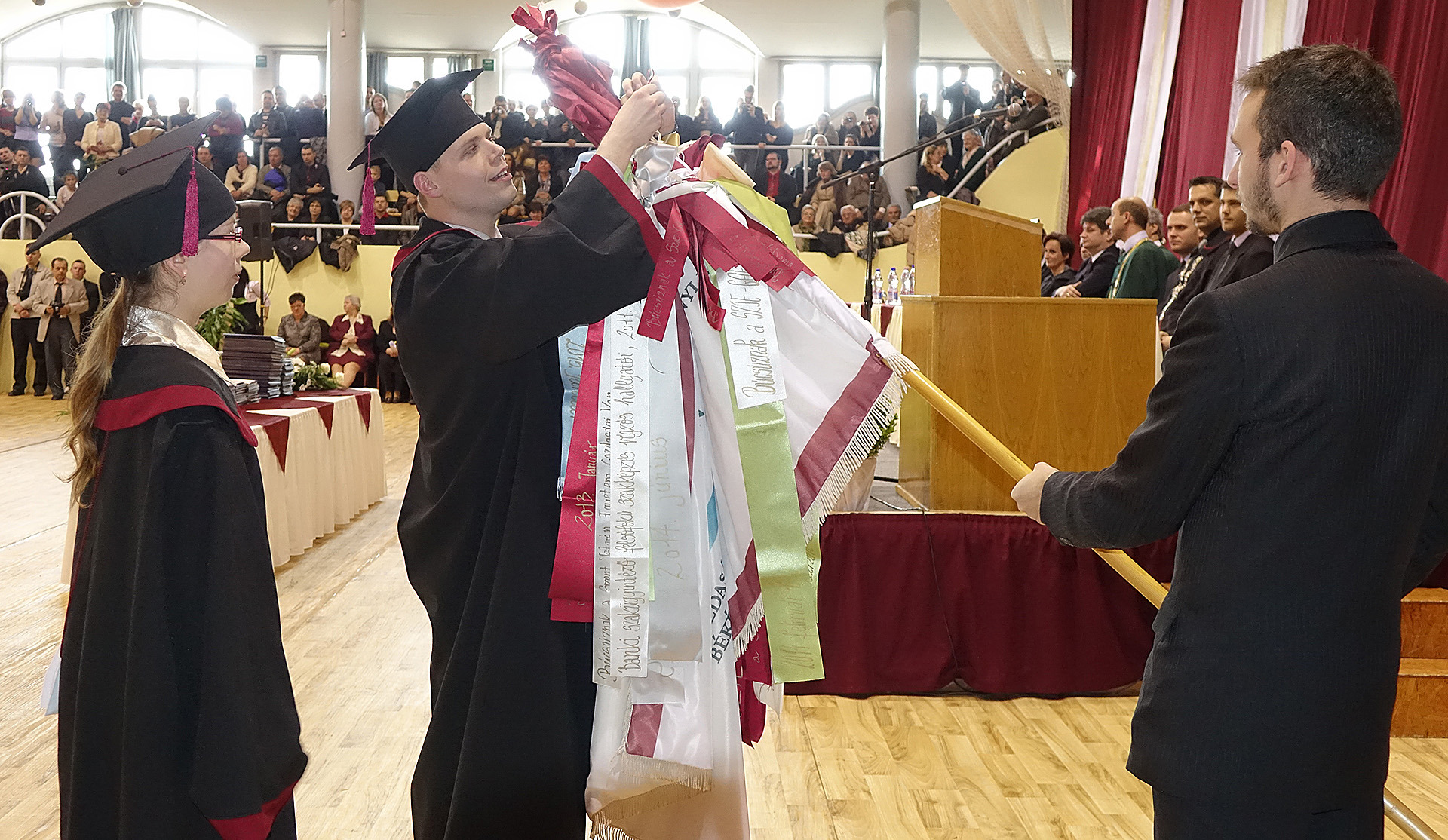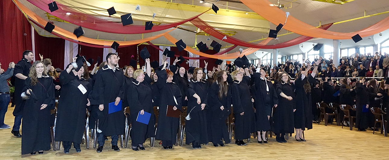 A dékáni záróbeszéd után felcsendült az Európai Unió himnusza, és az elnökség kivonulása után az immáron diplomás hallgatók levegőbe röpíthették sapkájukat, mintegy jelképezve a hallgatói évek lezárását, egyben egy új életút kezdetét is.