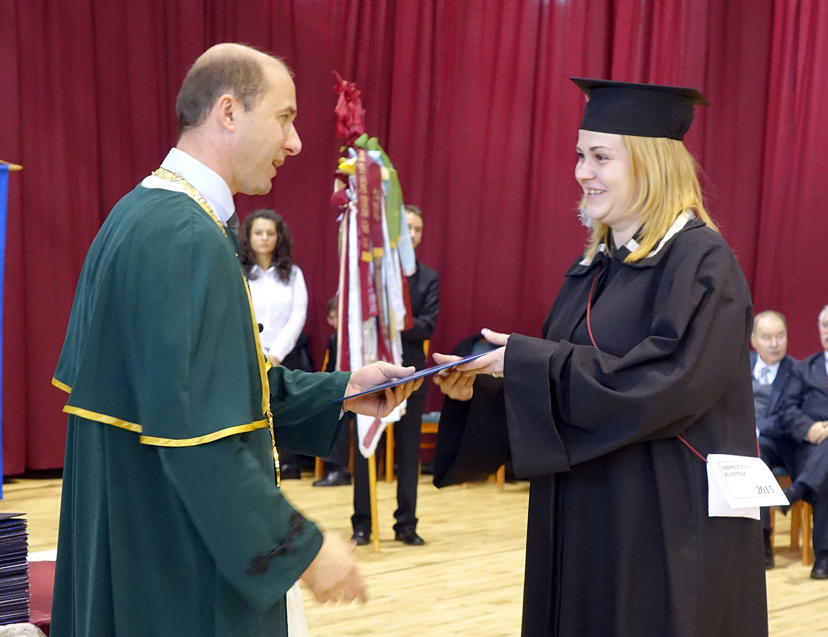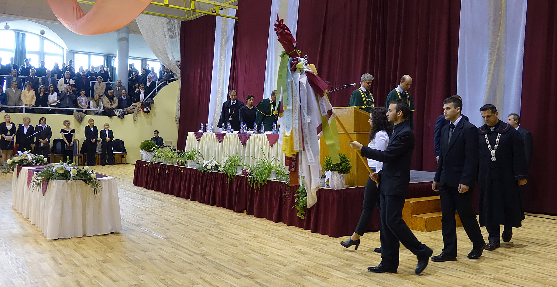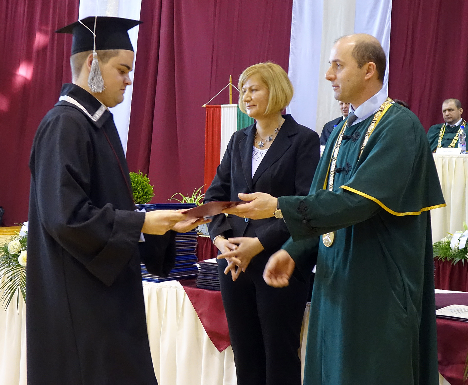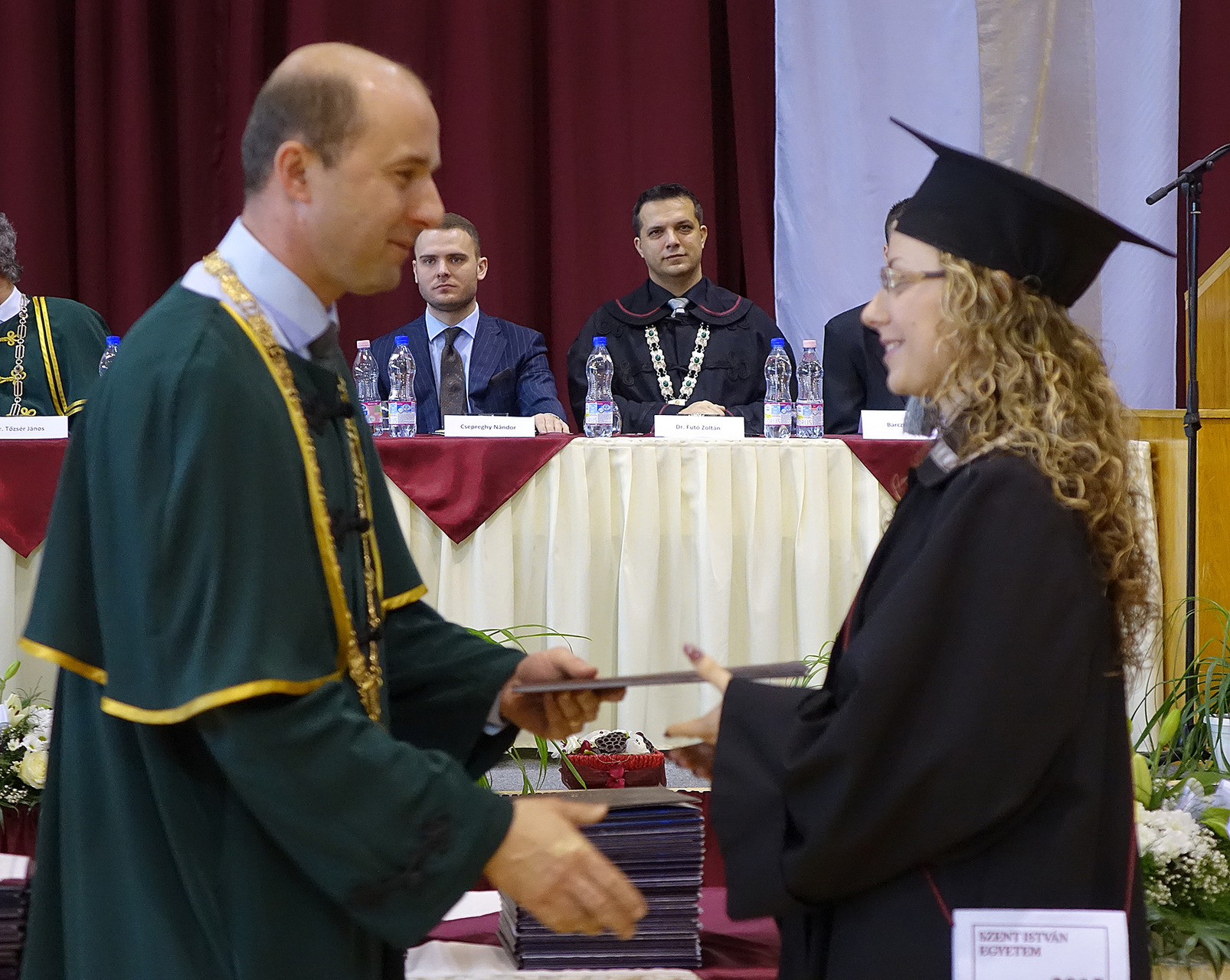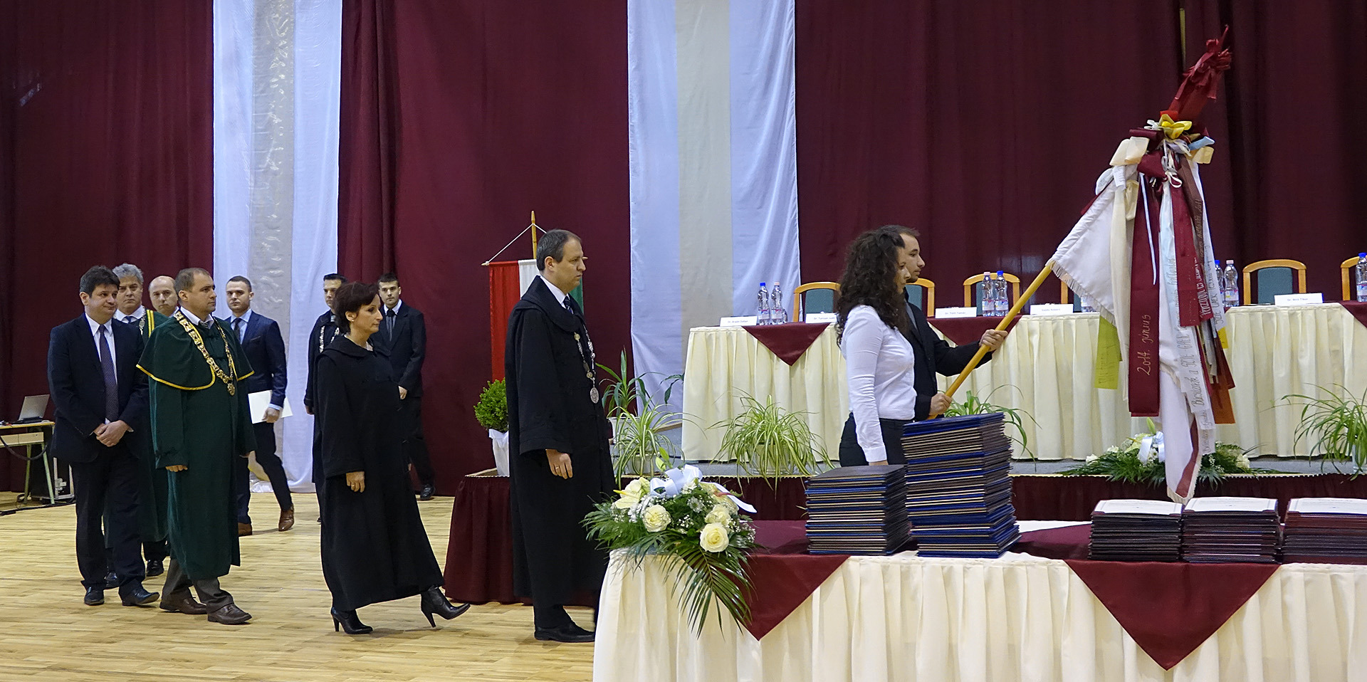 A diplomaátadó ünnepségen helyet foglalt az elnökség, majd nemzeti fohászunk eléneklése után a nap főszereplőit, a végzős hallgatókat köszöntötték, és látták el jó tanácsokkal.