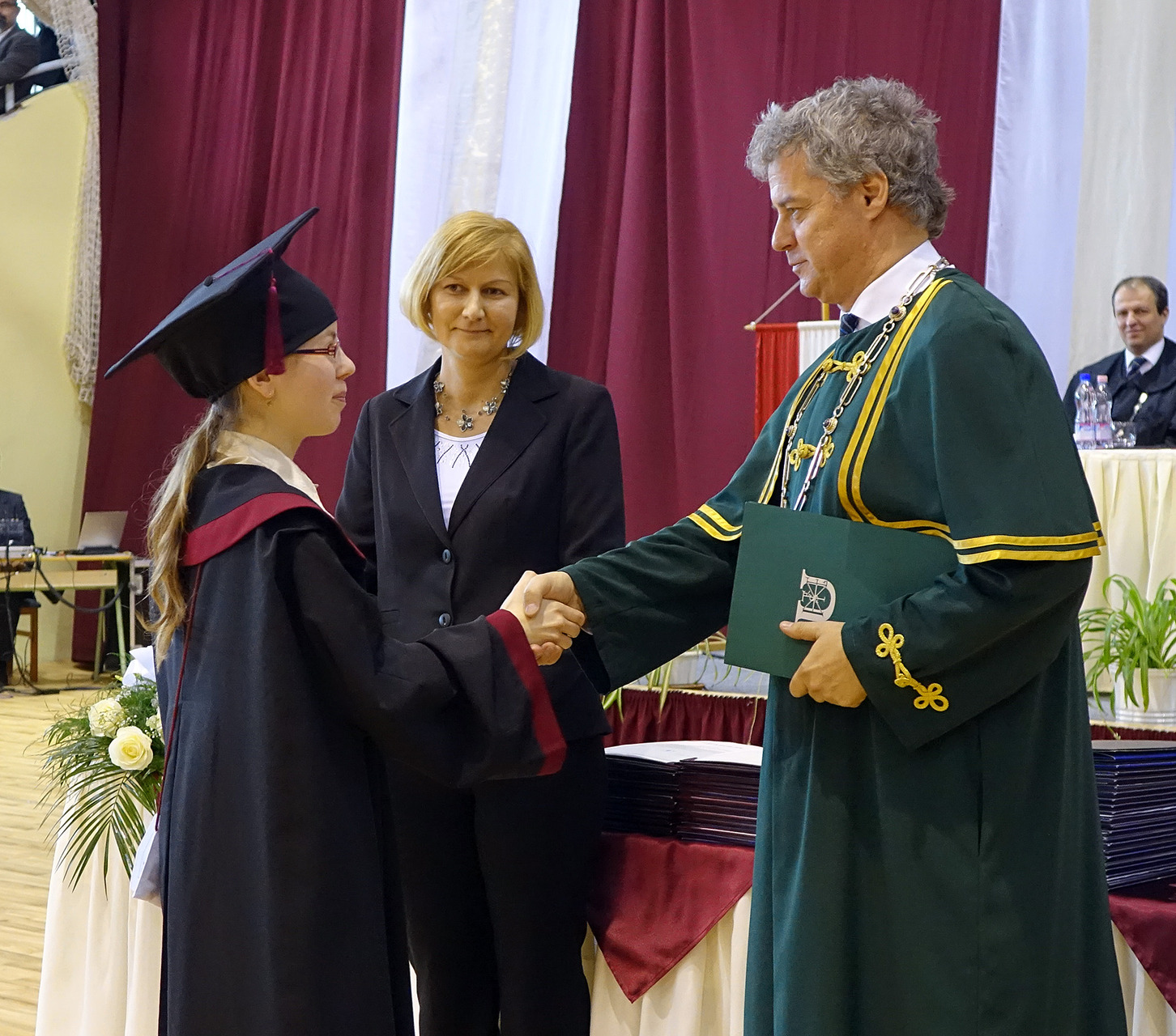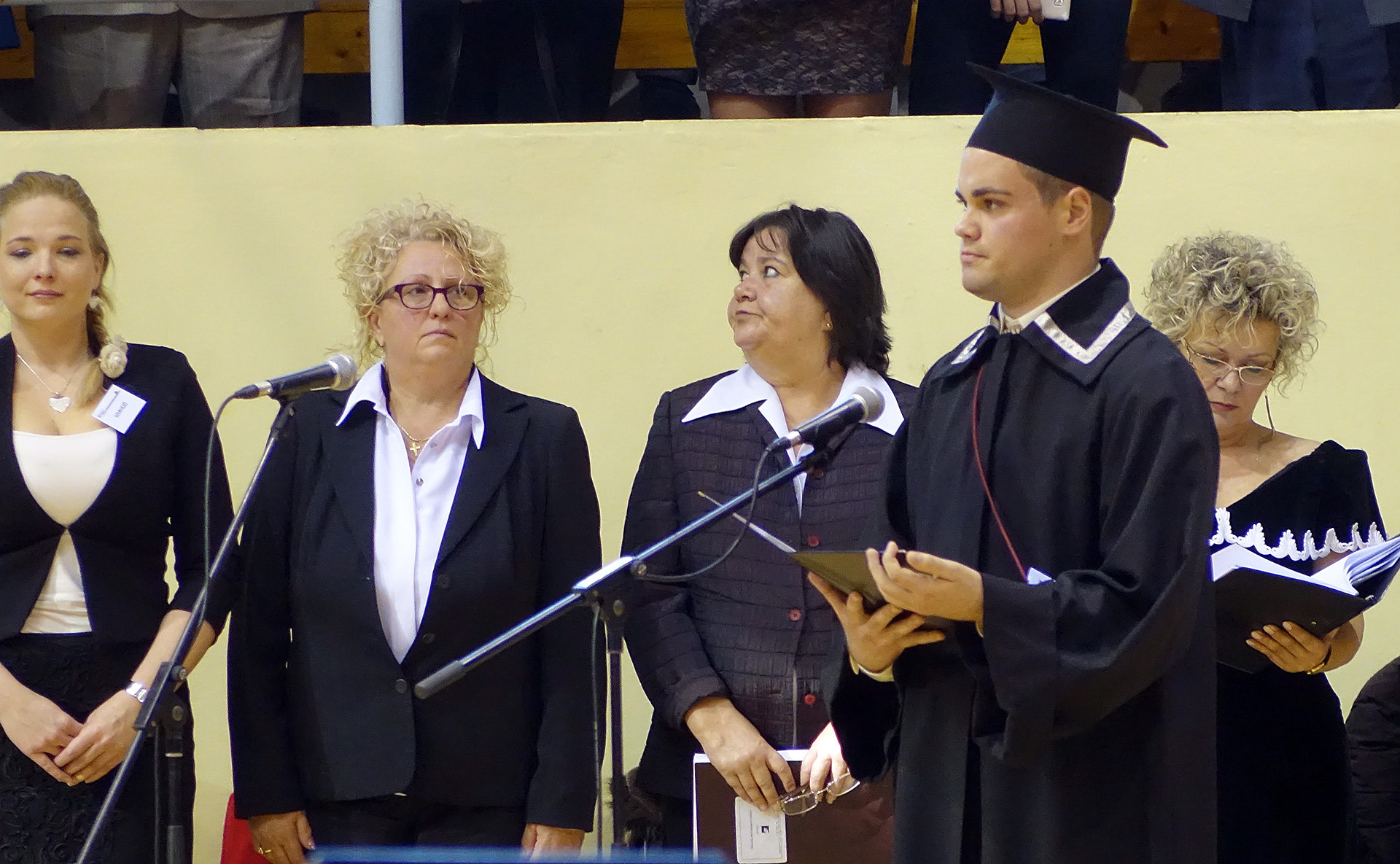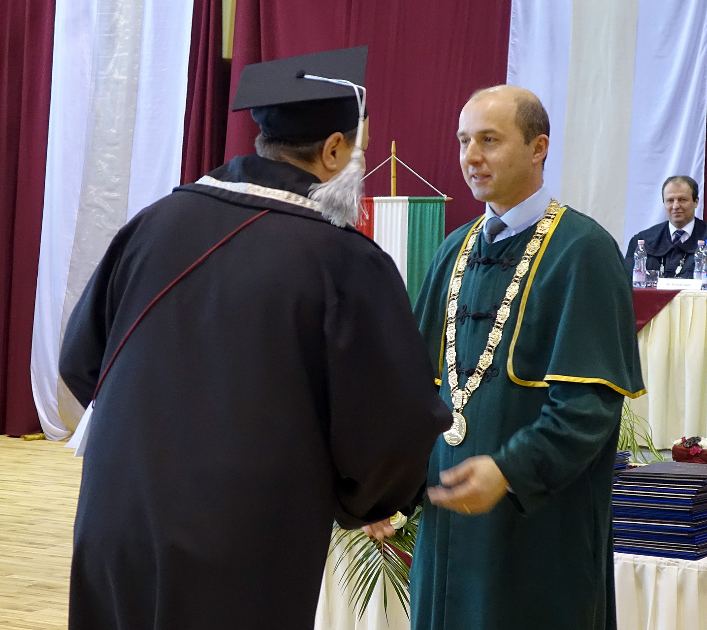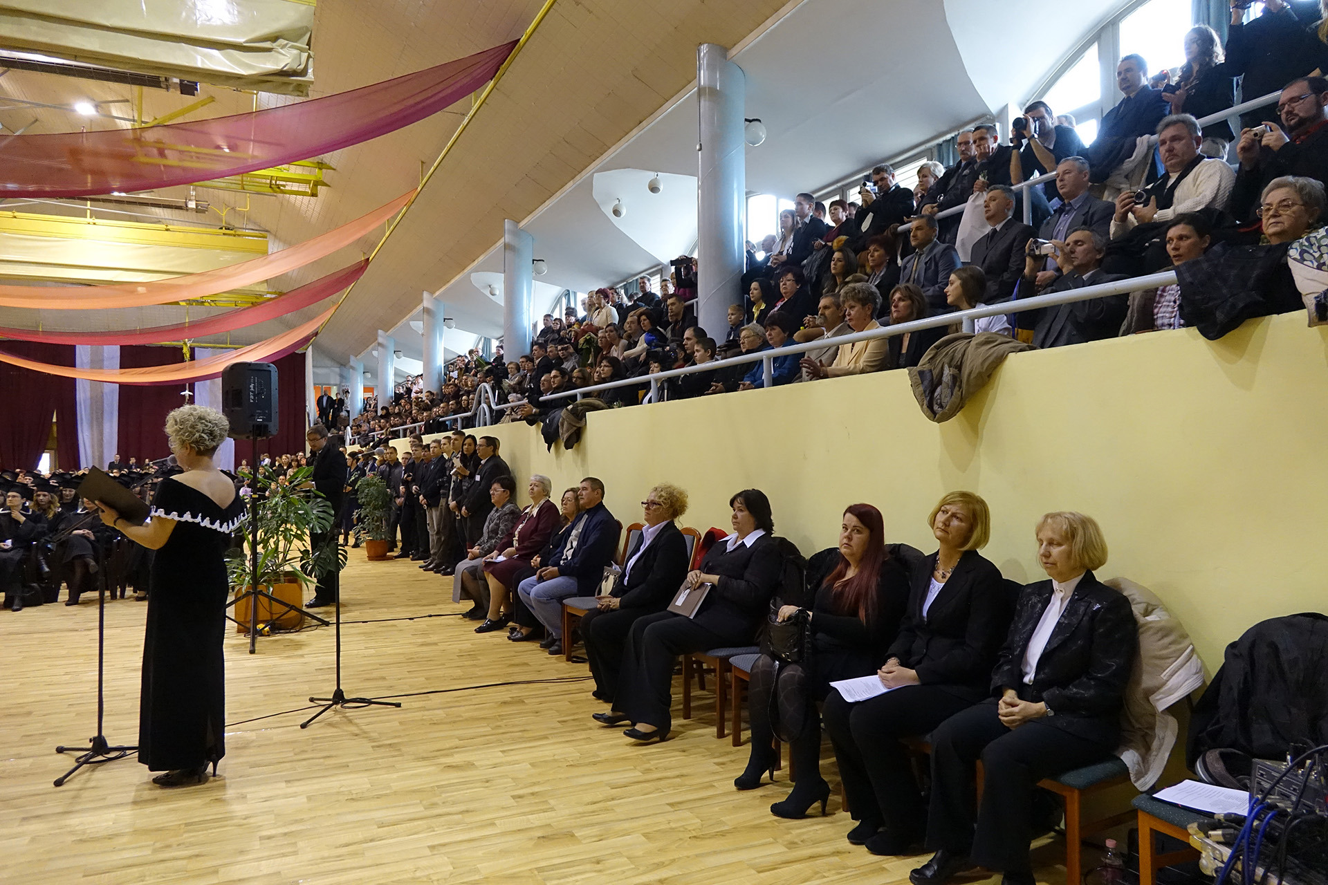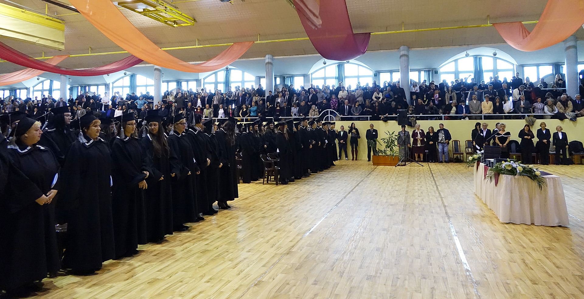 A diplomaátadó ünnepségen helyet foglalt az elnökség, majd nemzeti fohászunk eléneklése után a nap főszereplőit, a végzős hallgatókat köszöntötték, és látták el jó tanácsokkal.
