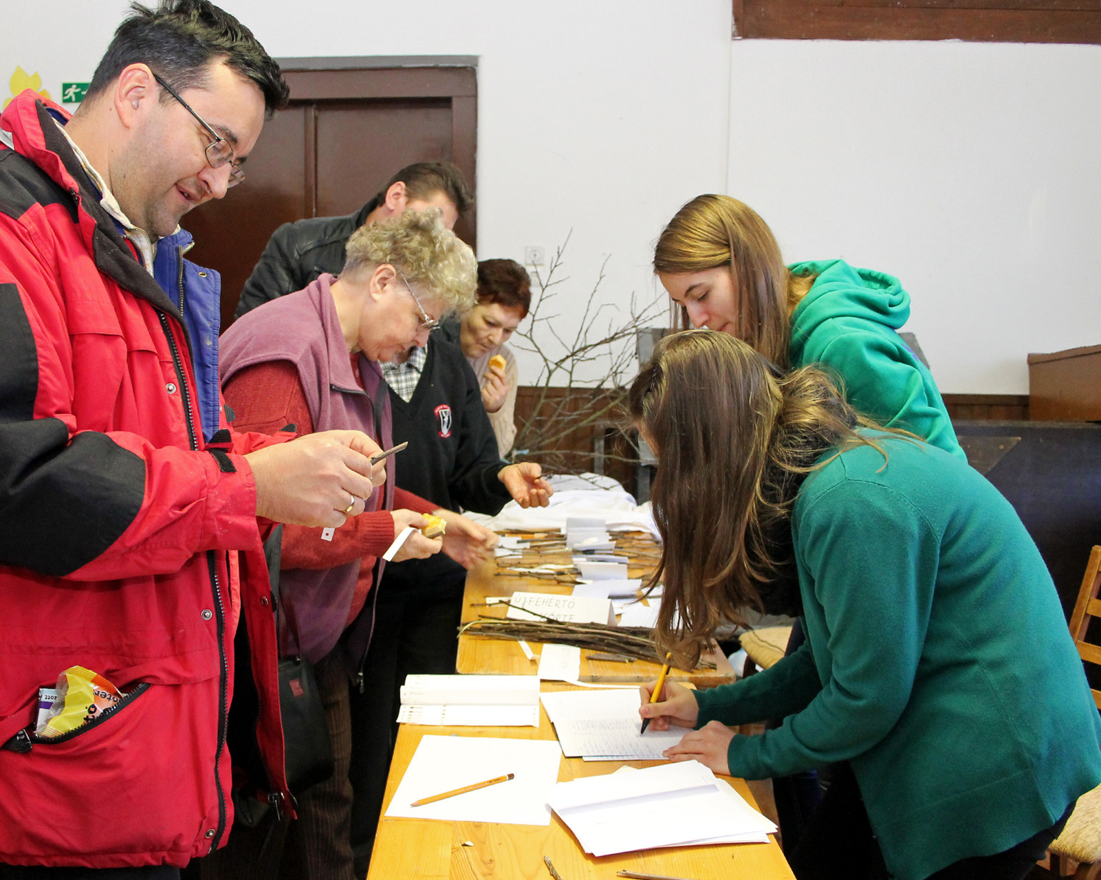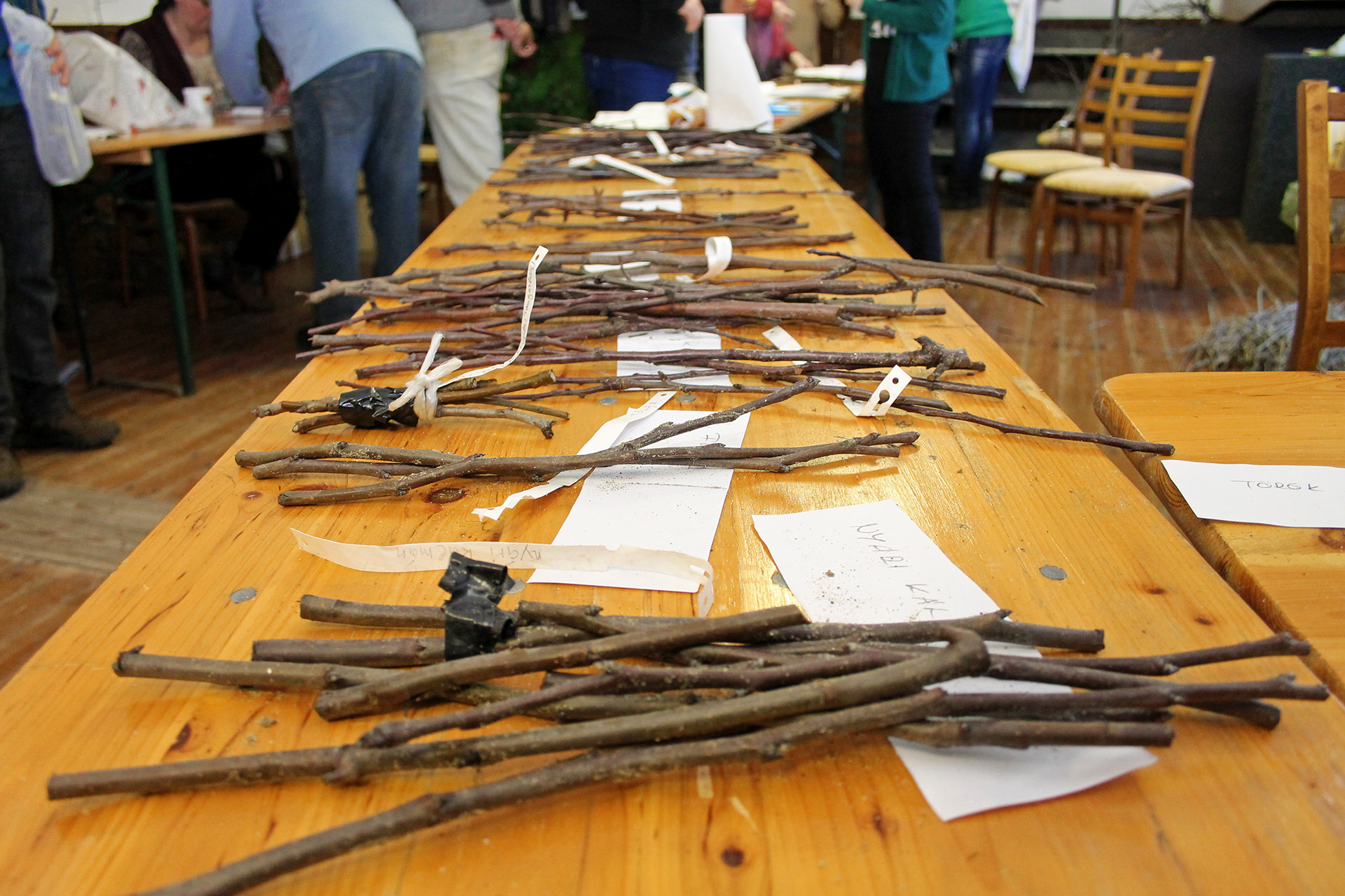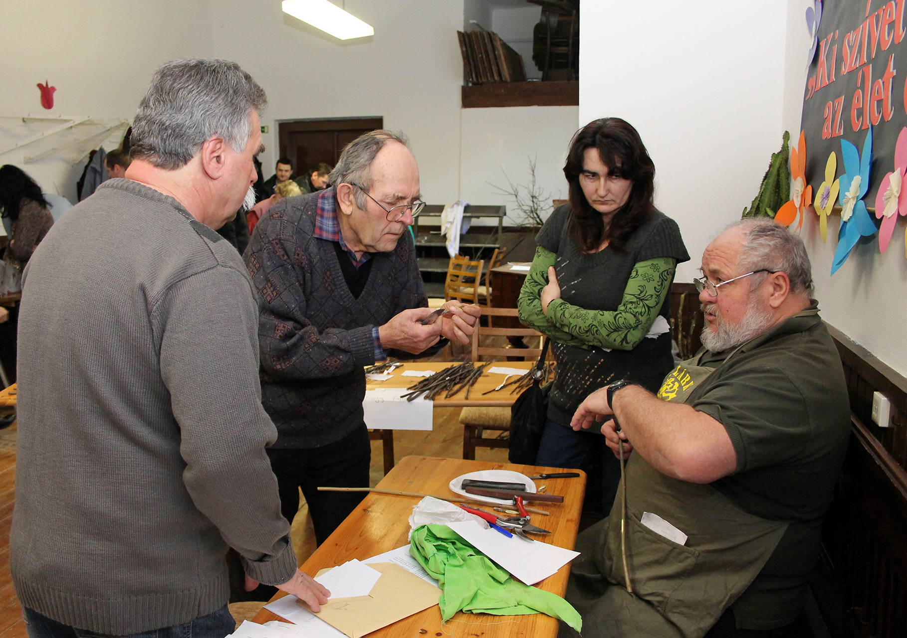Ottjártunkkor számos laikus érdeklődő forgolódott a teremben, akik nem igen tanulták a kertészkedést, orvosként, népzenészként vagy épp lakatosként élik hétköznapijaikat. A résztvevők között helyi és környékbeli „kertésznövendékekkel” is találkozhattunk, akik saját régi fajtájú gyümölcsfájukról is vihettek vesszőt a bemutatóra.