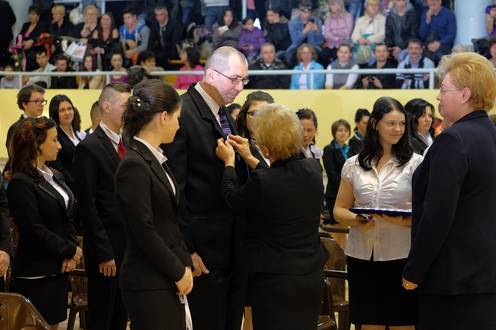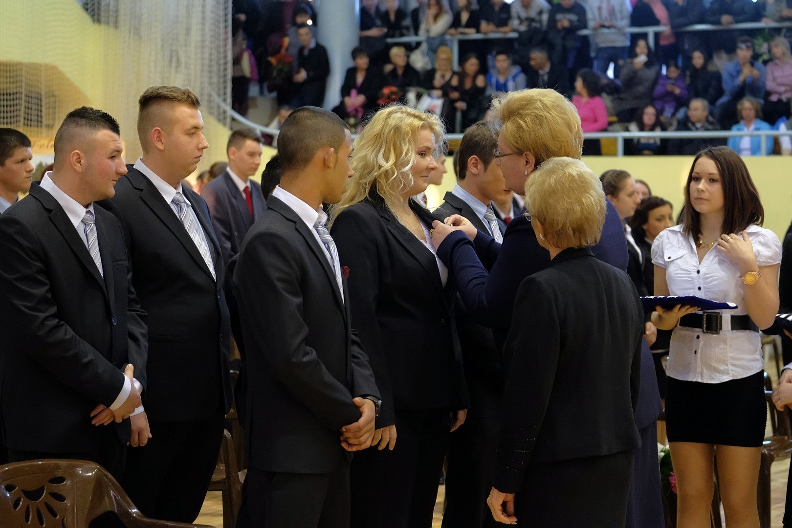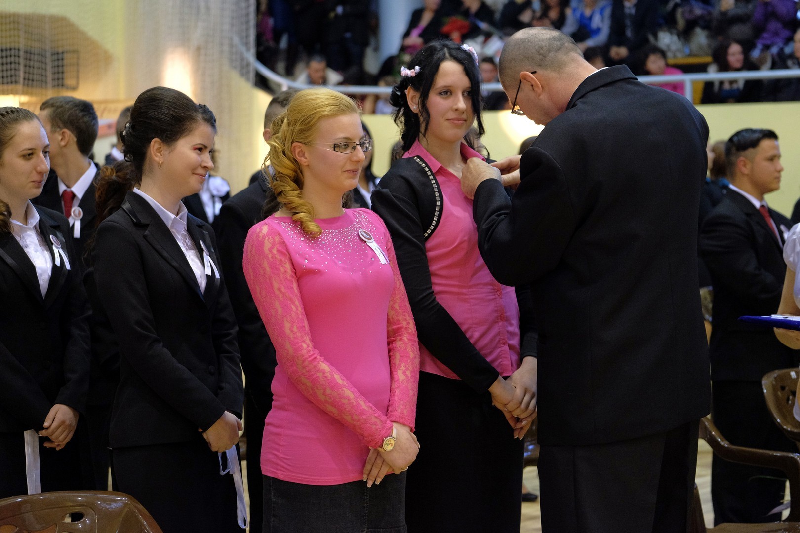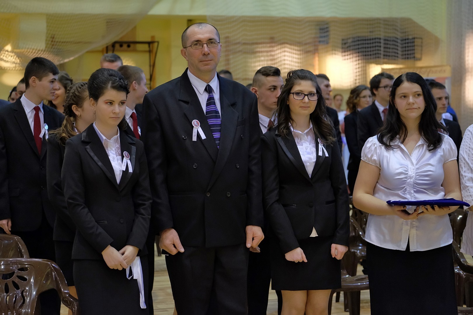 A köszöntőt követően elérkezett a várva várt pillanat: a szalagtűzés. A ceremónián 10 osztály 156 végzős diákjának mellkasára került fel a középiskolai évek végét szimbolizáló szalag.