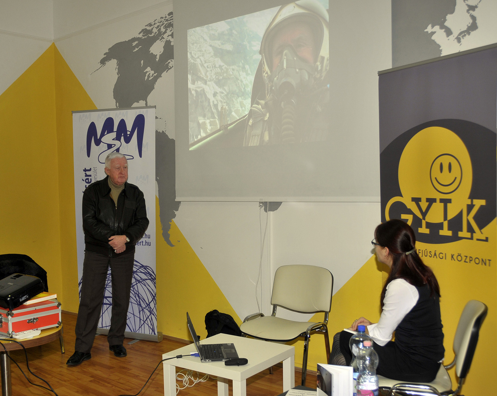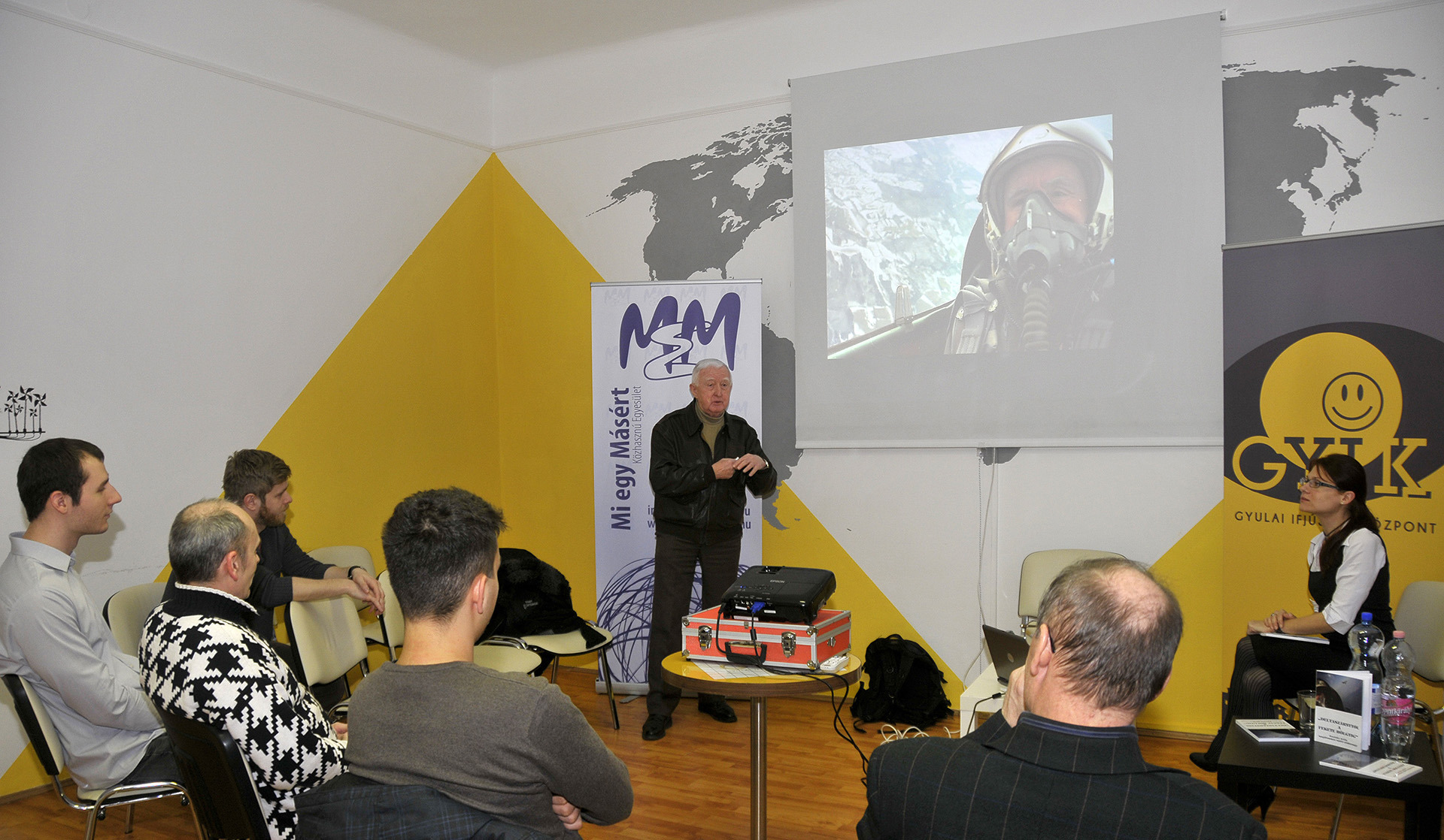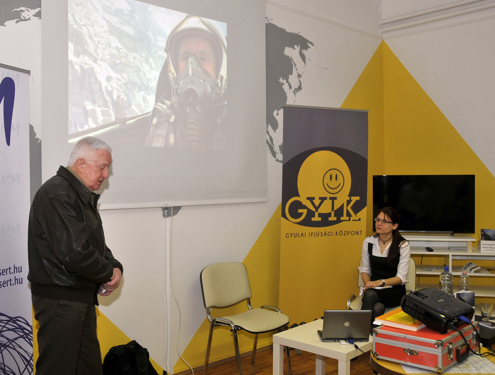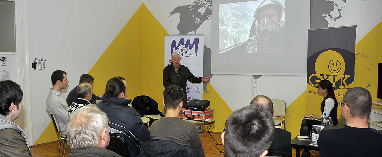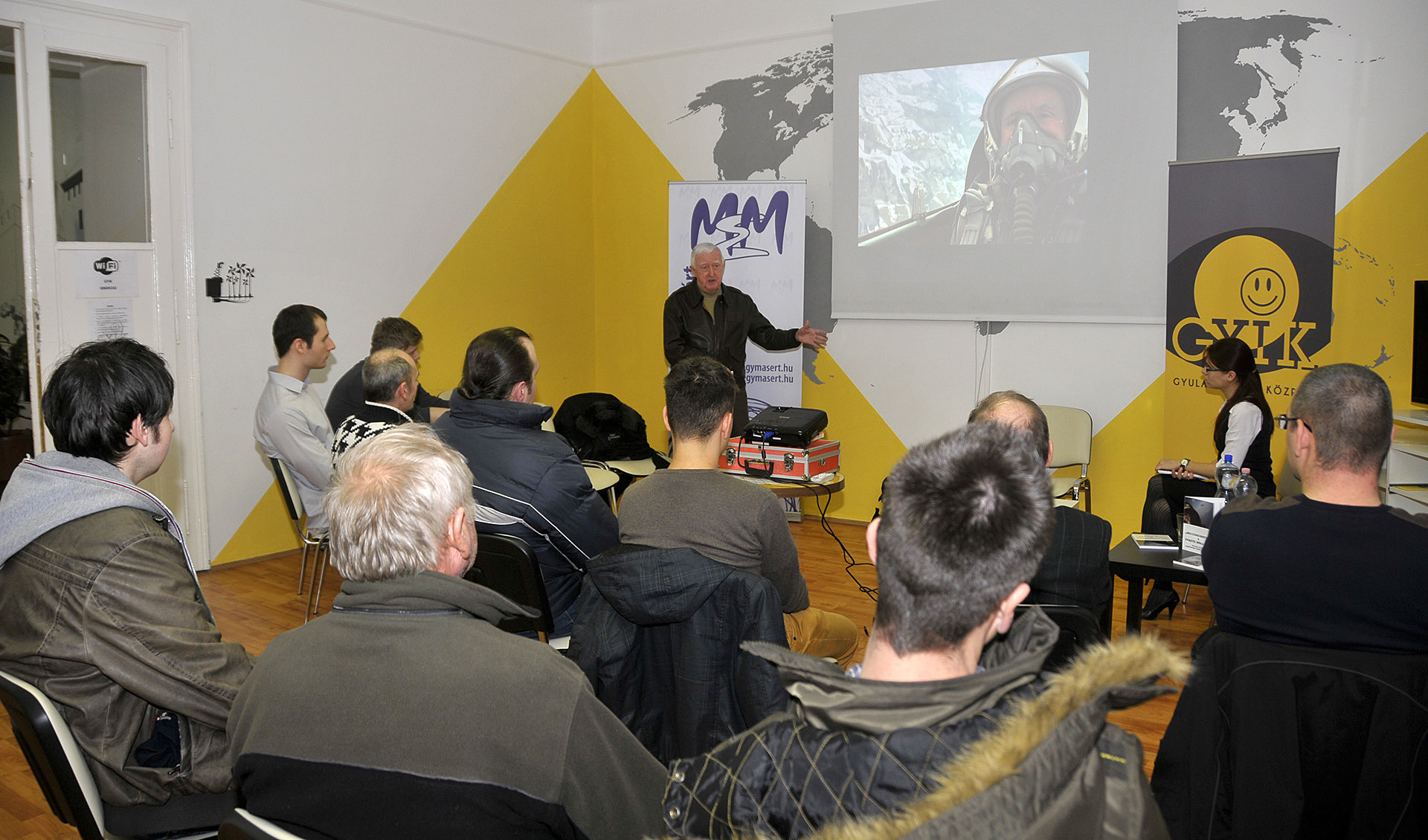 Kositzky Attila, A vadászpilóta magánya című előadásában exkluzív fotókat mutatott, és az égi egyedüllét szépségét és keménységét tárta hallgatósága elé. Az esten Turi Rita, a GYIK munkatársa faggatta tapasztalatairól, élményeiről a hetven év feletti, jelenleg Balatonfüreden élő ex-vadászpilótát.