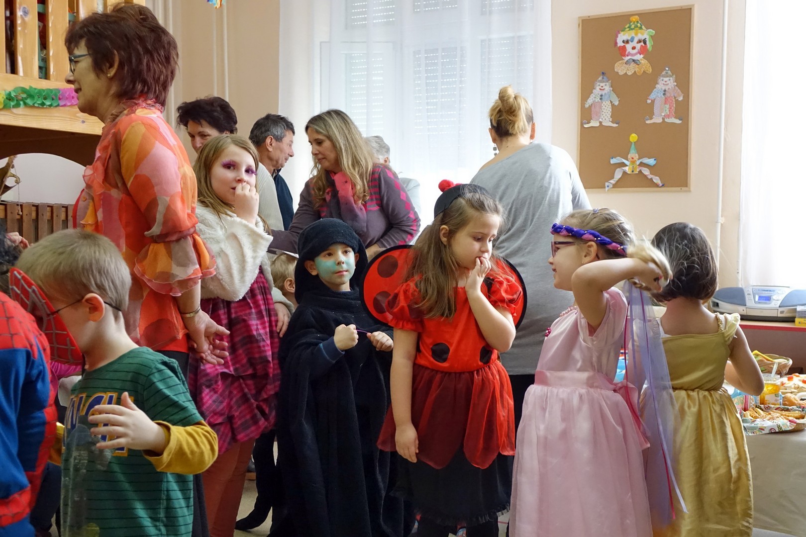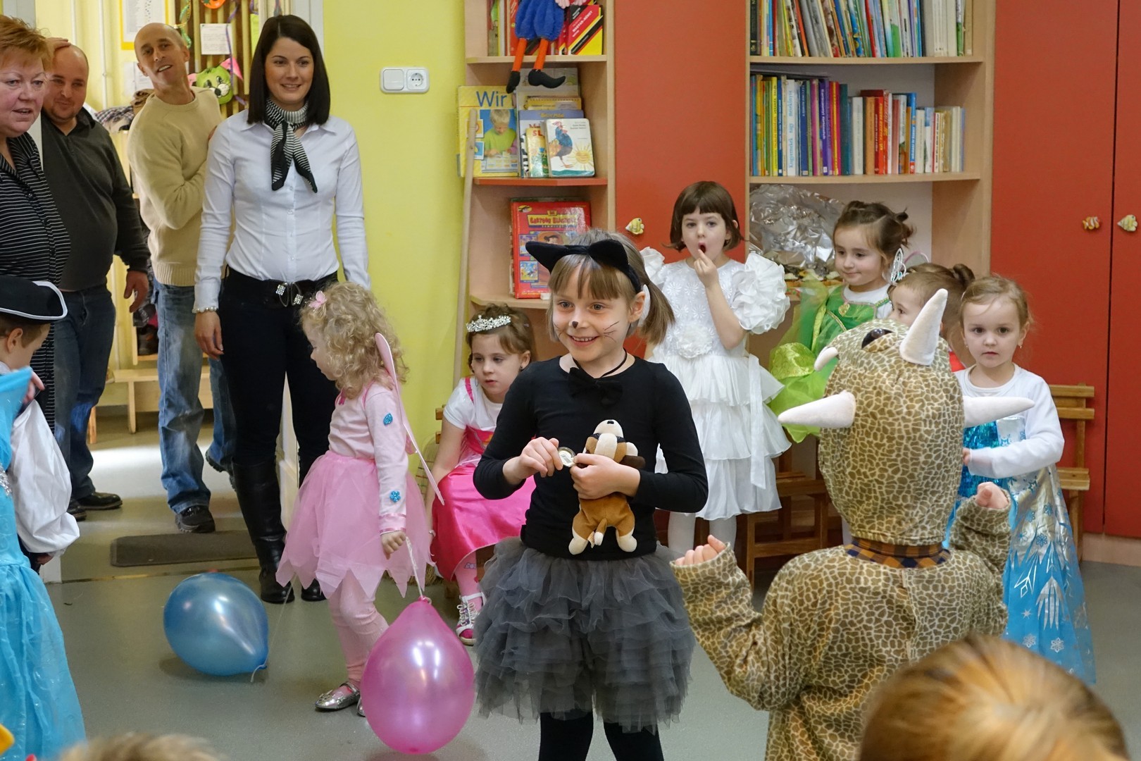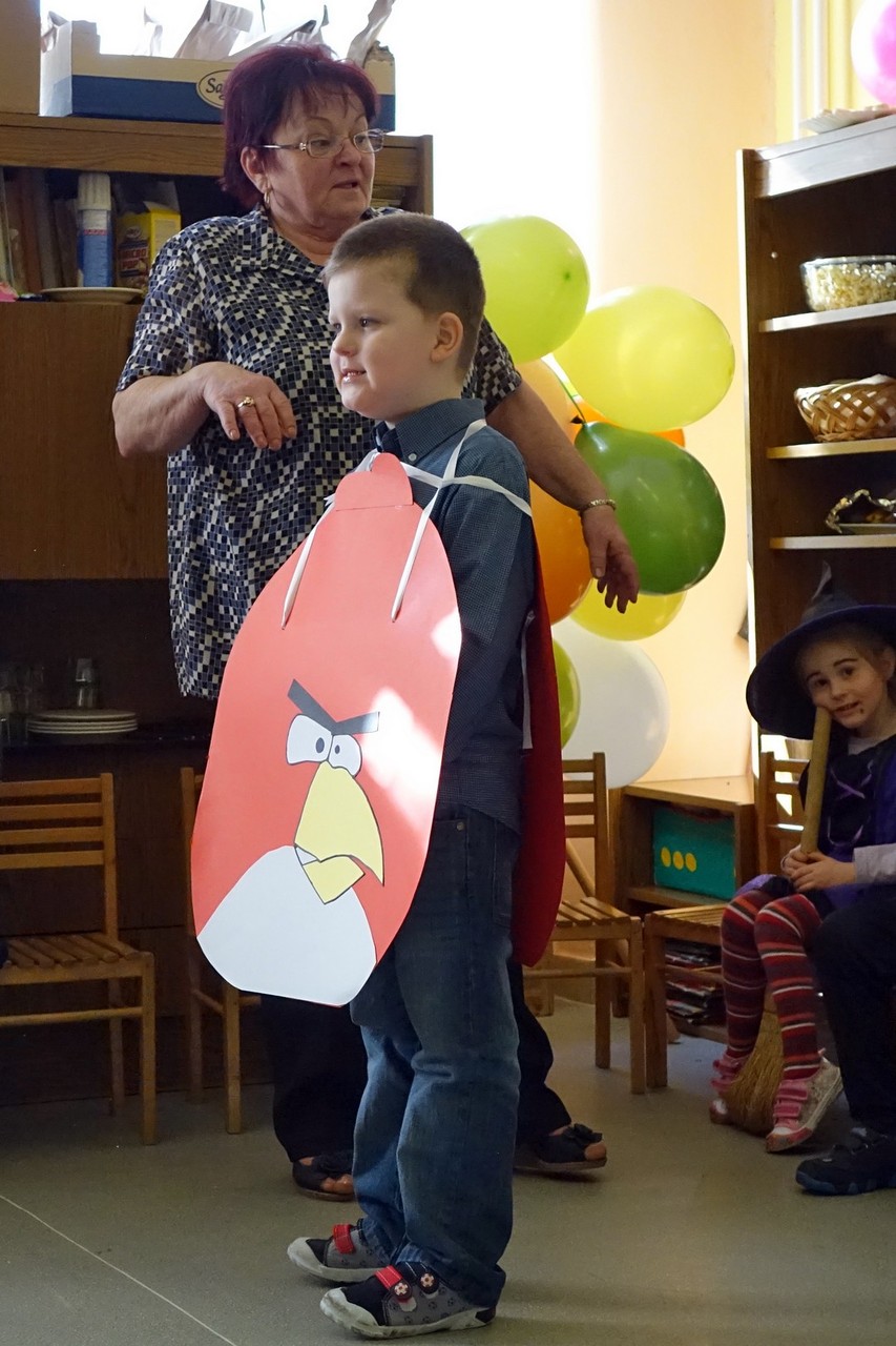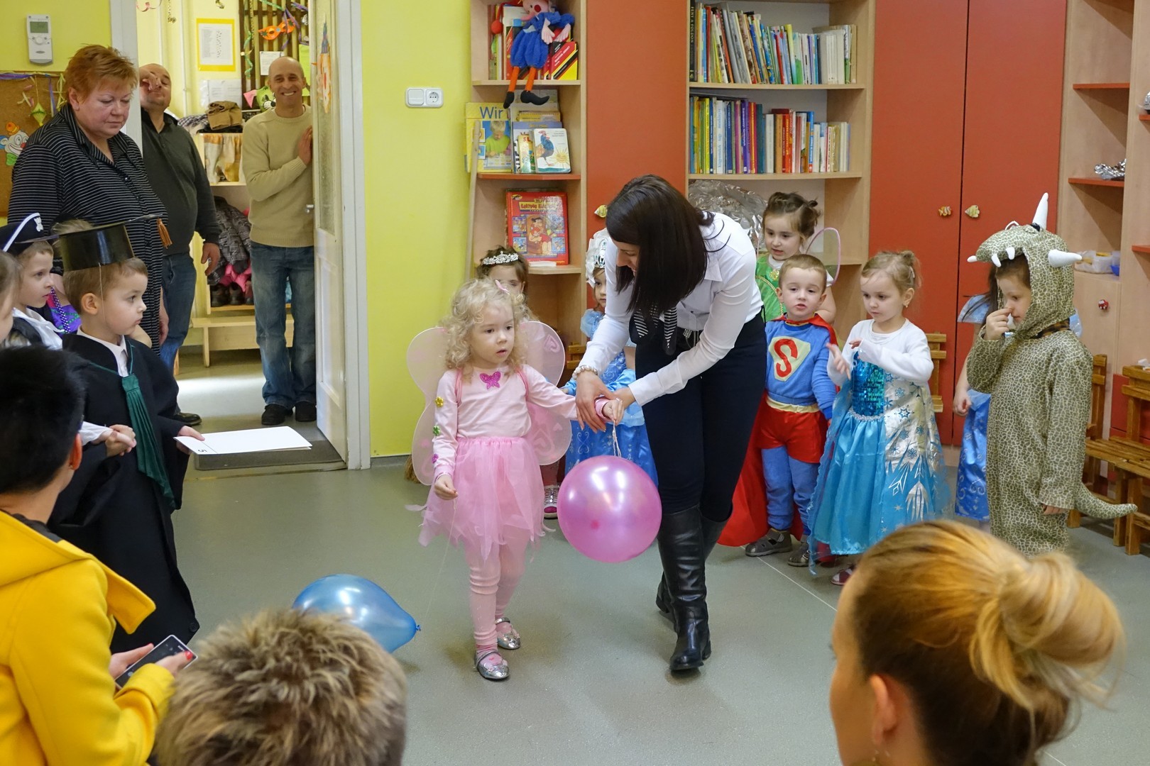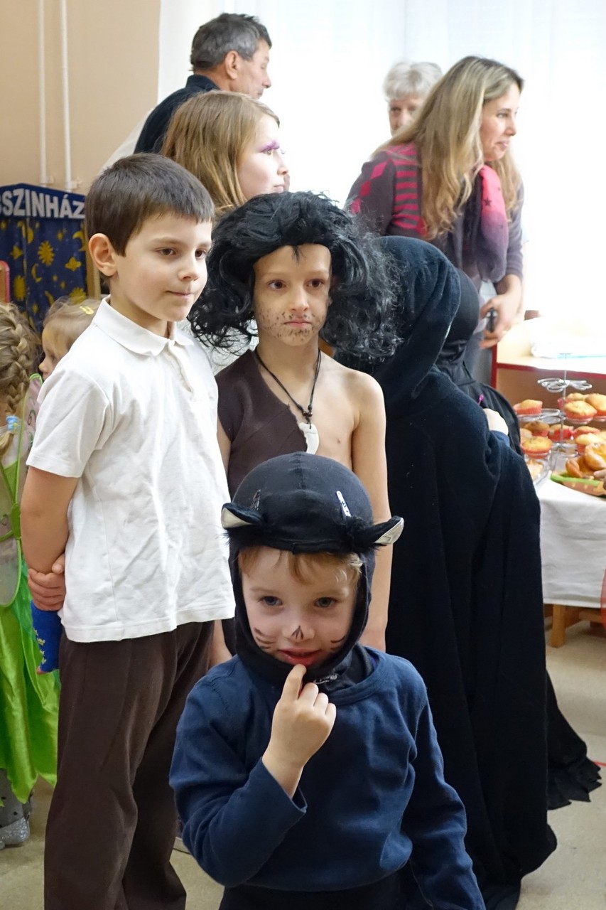 A játék okozta derült pillanatokat hamarosan újabbak követték, amikor is a csemeték különféle bájos és ötletes maskarákat öltöttek magukra. A szebbnél szebb jelmezeket, illetve pöttöm viselőik bátorságát tapssal jutalmazta a közönség. Láthattunk tündért, autószerelőt, spanyol táncost, mesehősöket és kalózokat is, de még egy „angry bird” is sétált a folyosókon. A maszkos felvonulás után vidám hangulatú zenés mulatozás vette kezdetét.