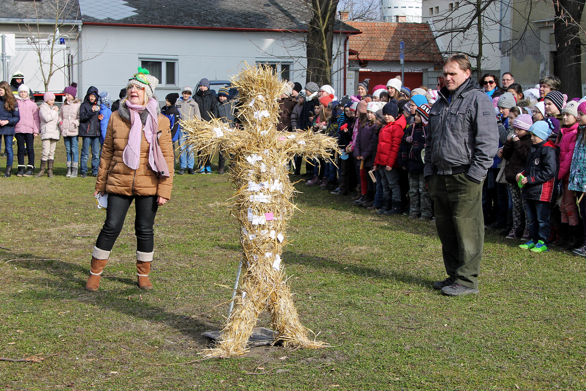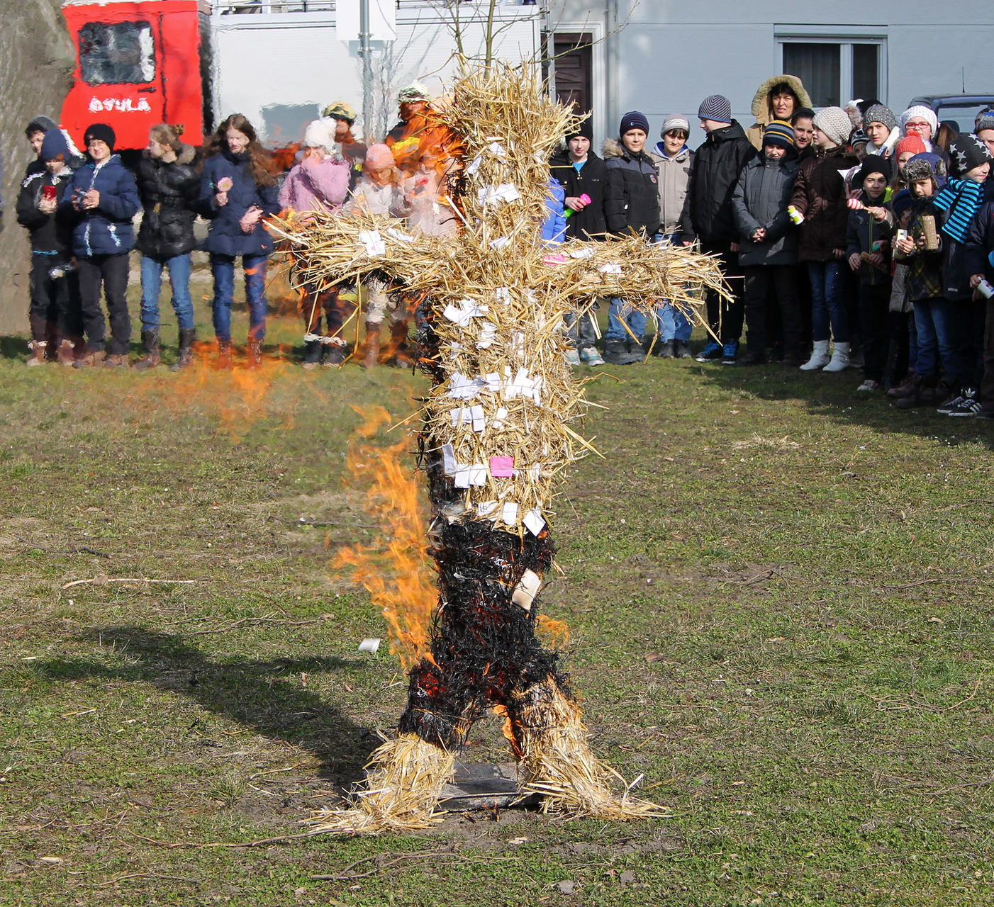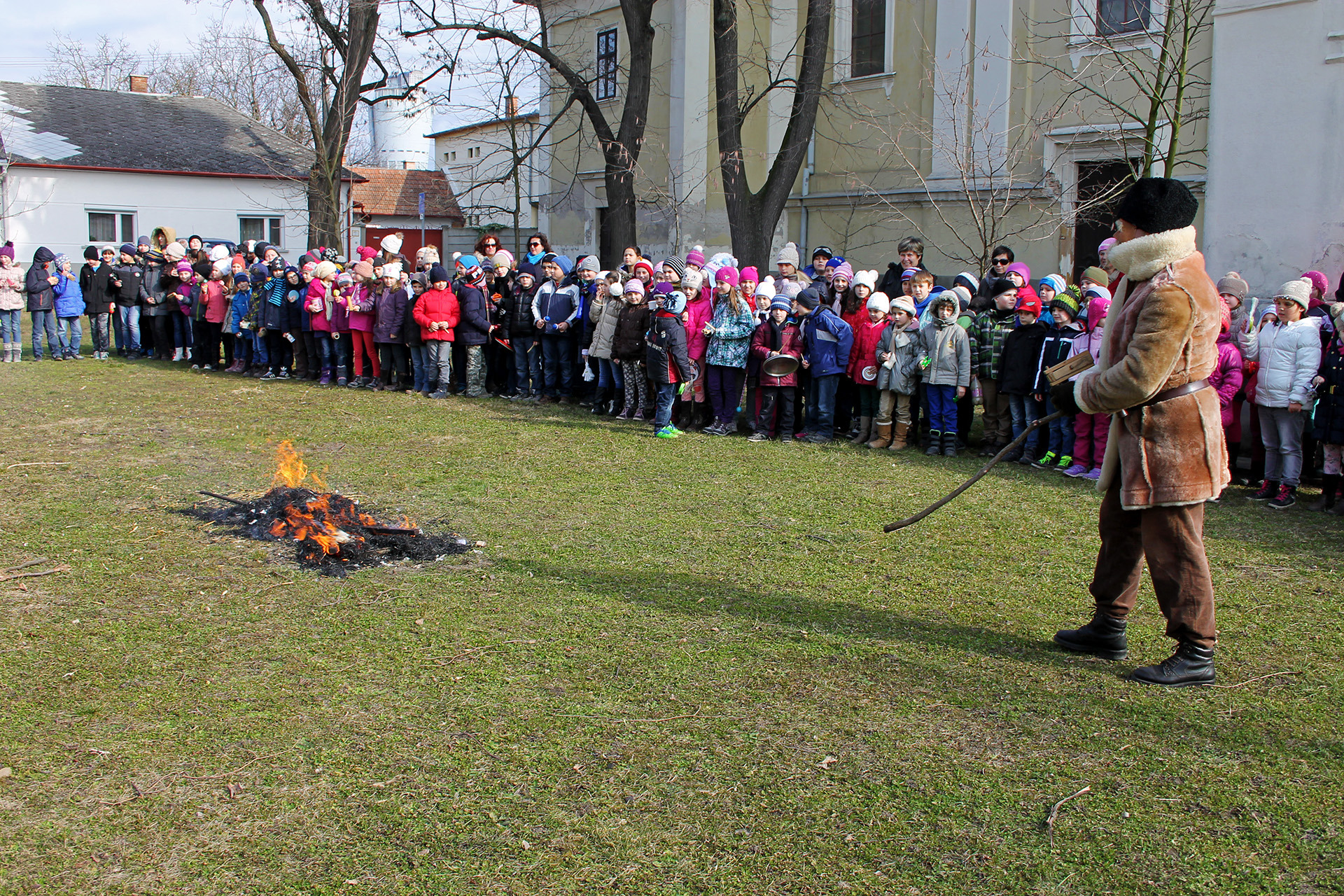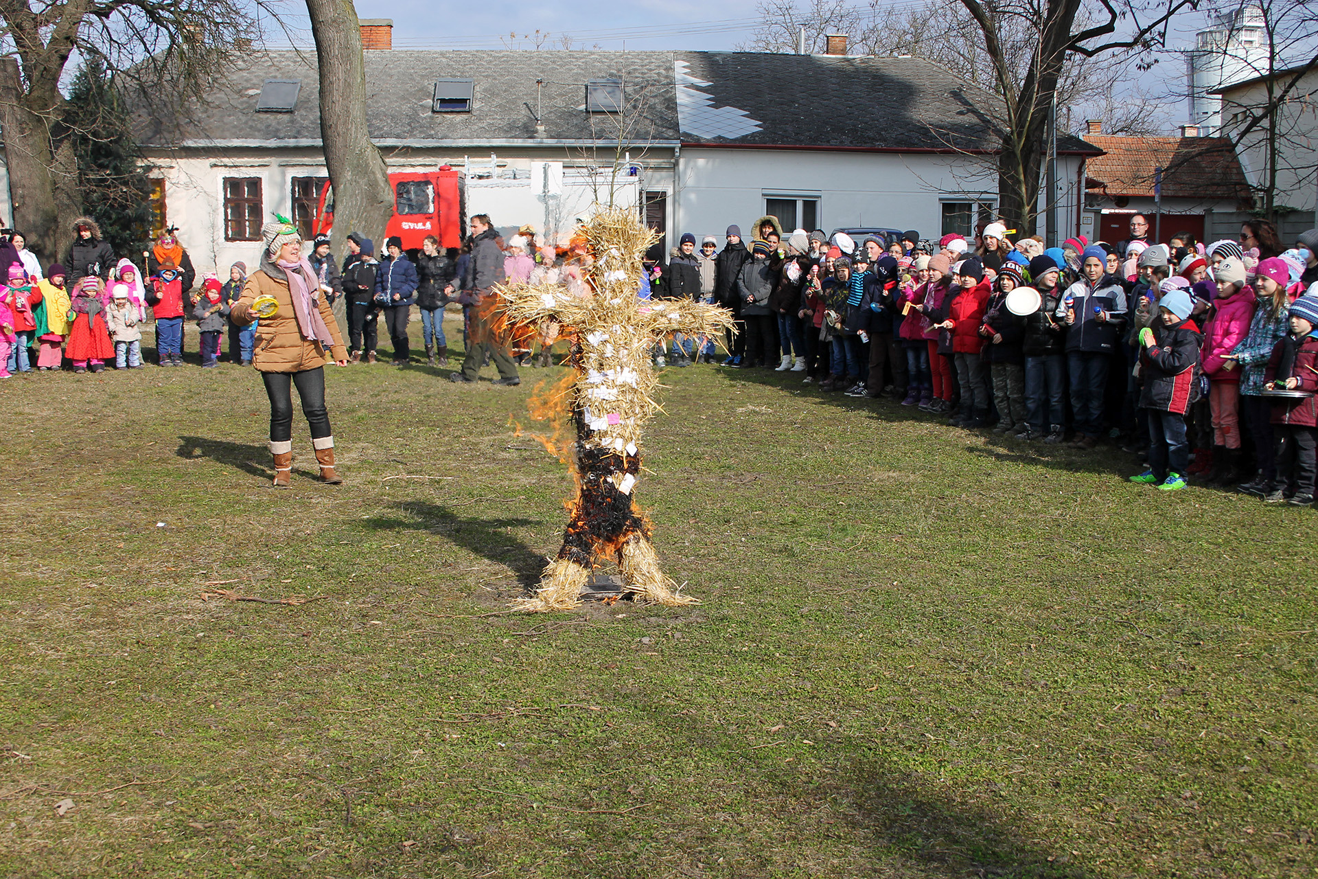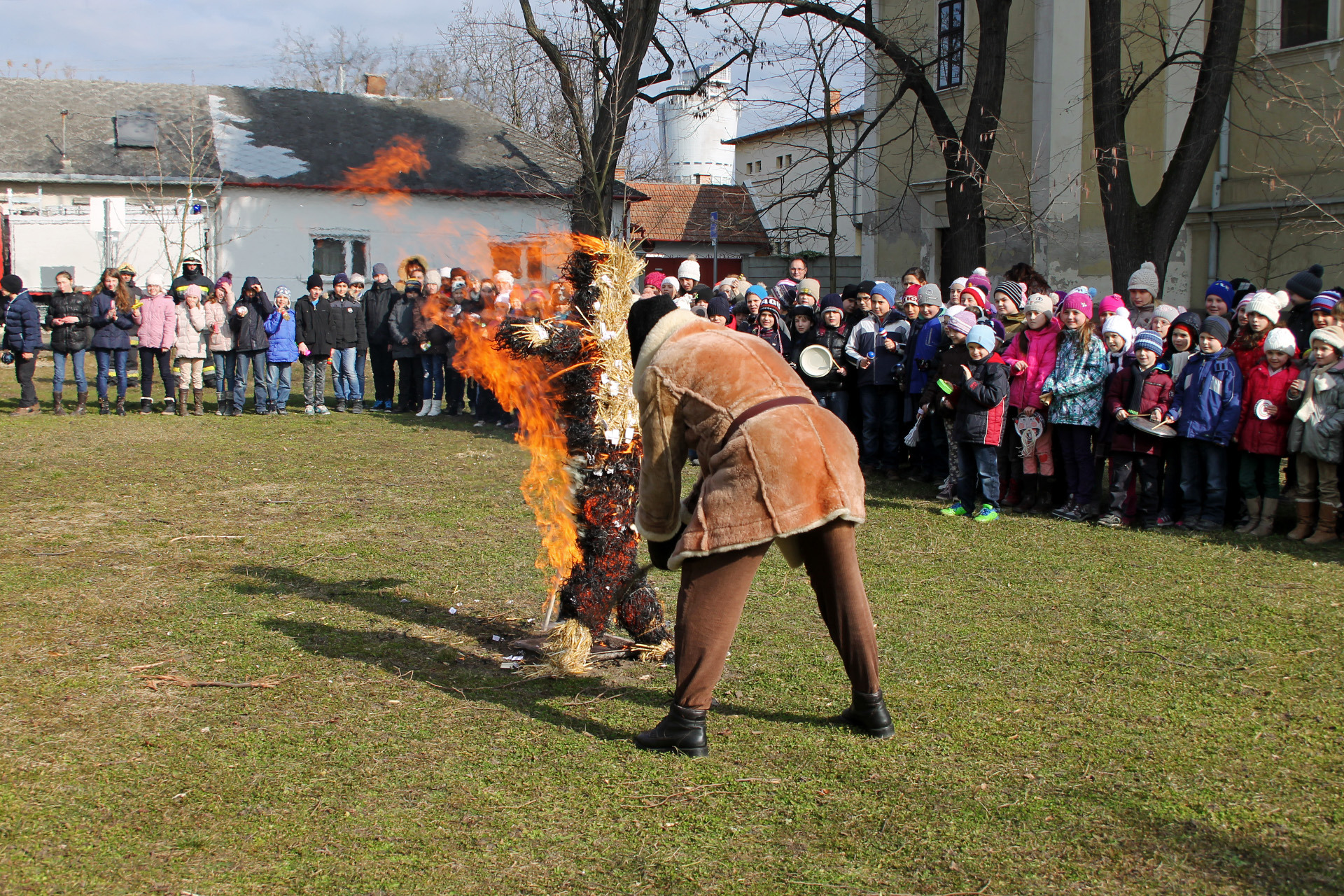 Németváros főterére érve Szerb Irén Magdolna óvodapedagógus szólt néhány szót a tömeghez, majd meggyújtották a szalmabábot. A bábu épp hogy lángra kapott, egy titokzatos, maszkos alak ugrott elő a tömegből, aki egy bottal hadonászva igyekezett visszavonulásra késztetni a rossz időt, miközben körbe-körbe táncolta az égő szalmakupacot.