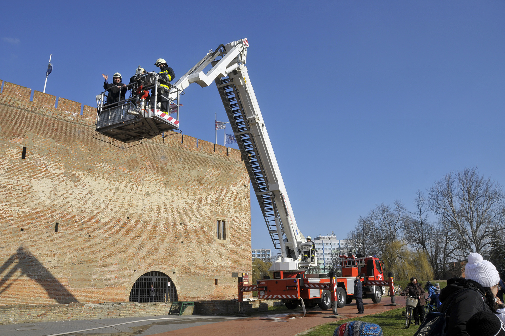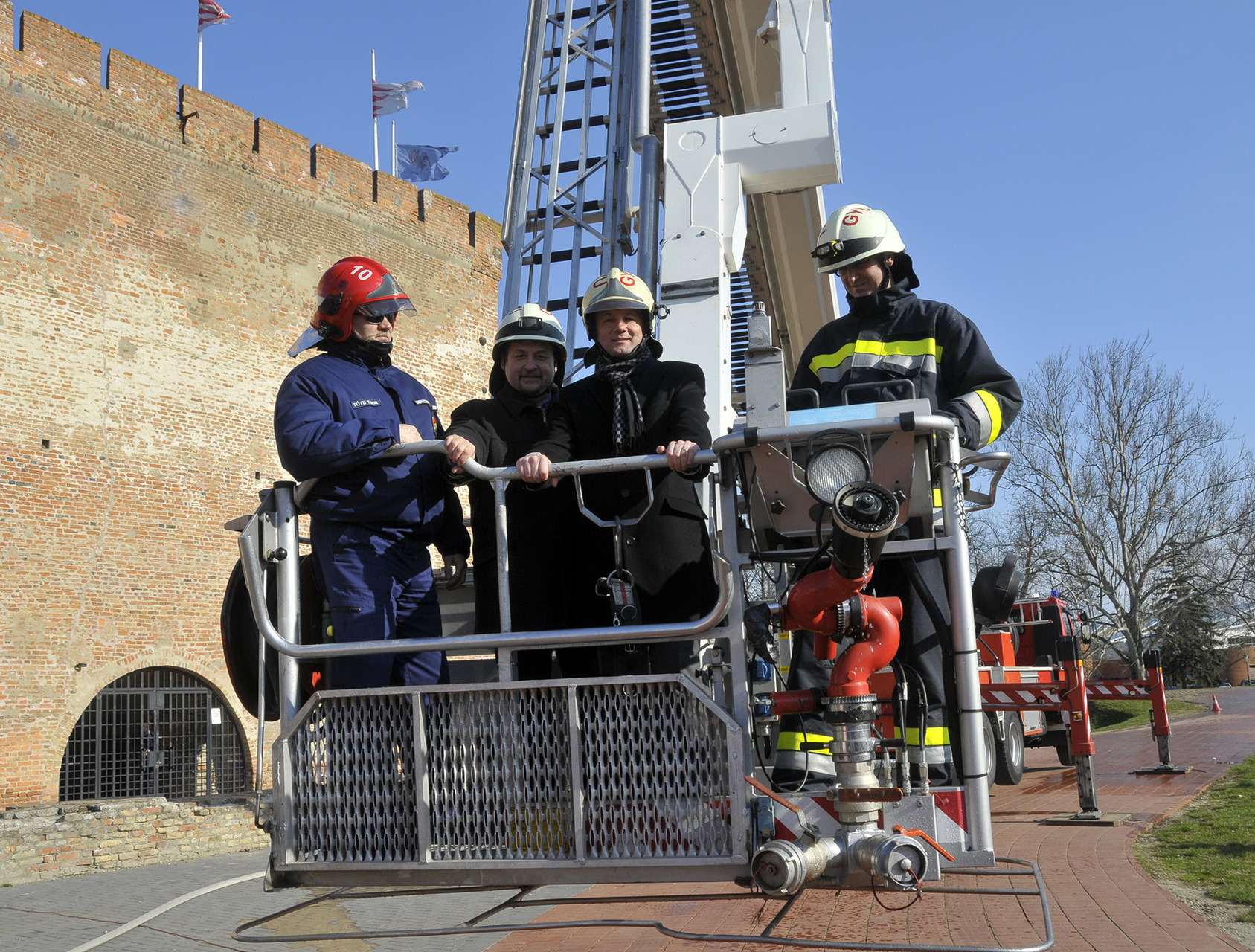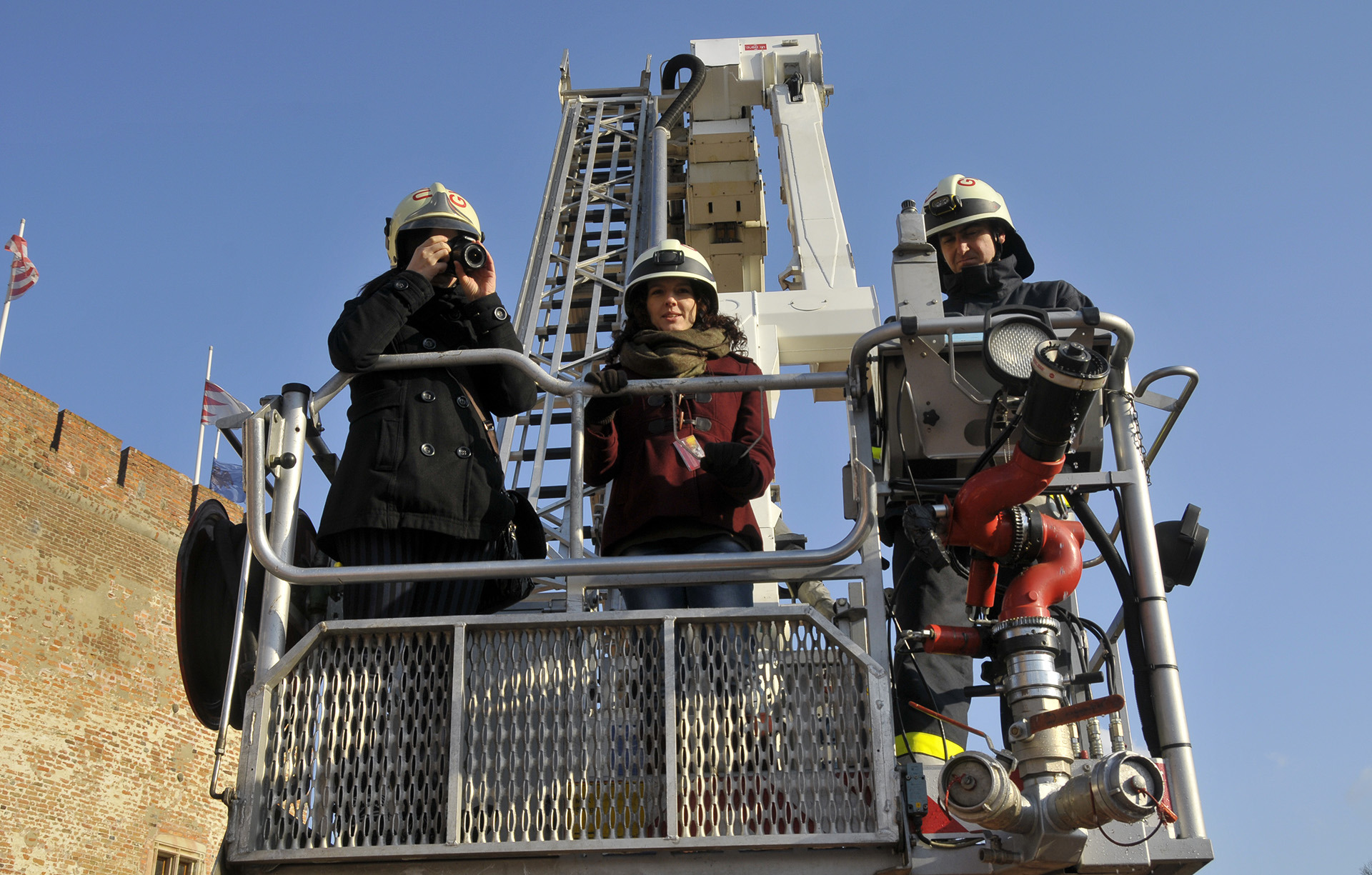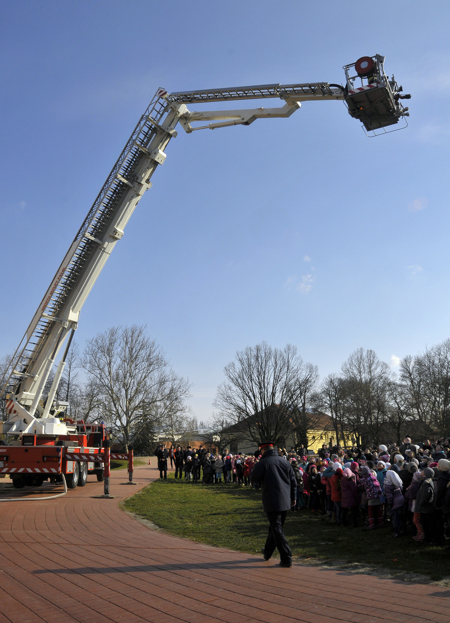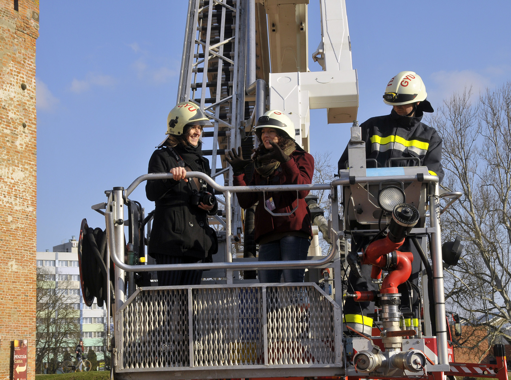 A bemutató után a tűzoltók szigorú felügyelete mellett a közelgő nőnap alkalmából a legbátrabb hölgyek ki is próbálhatták, milyen érzés a "kosárban utazni".