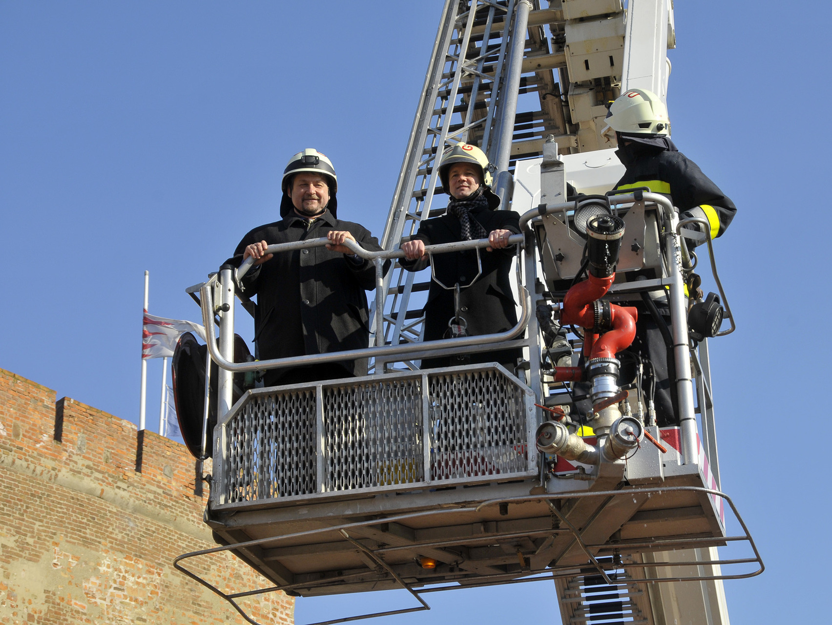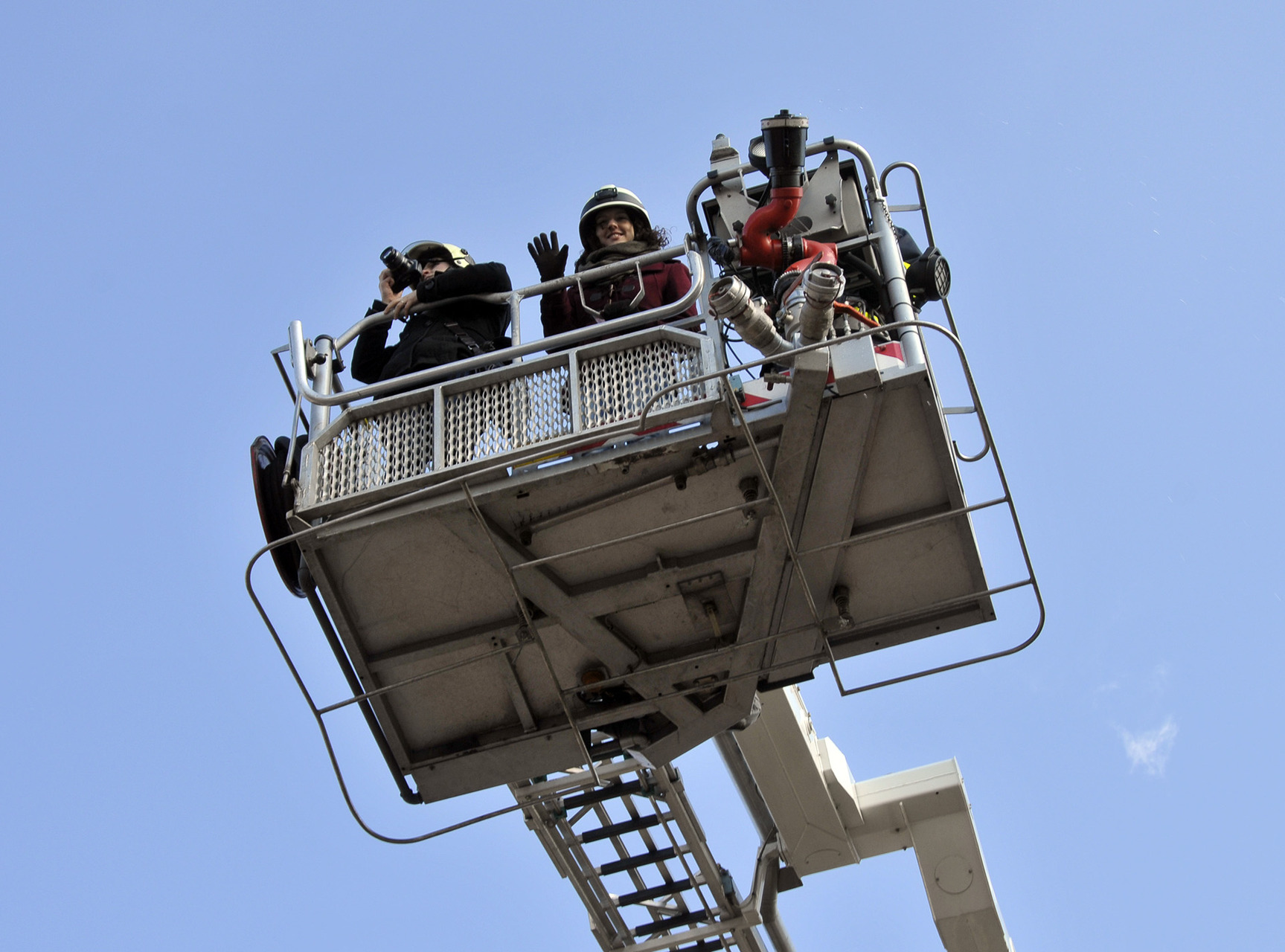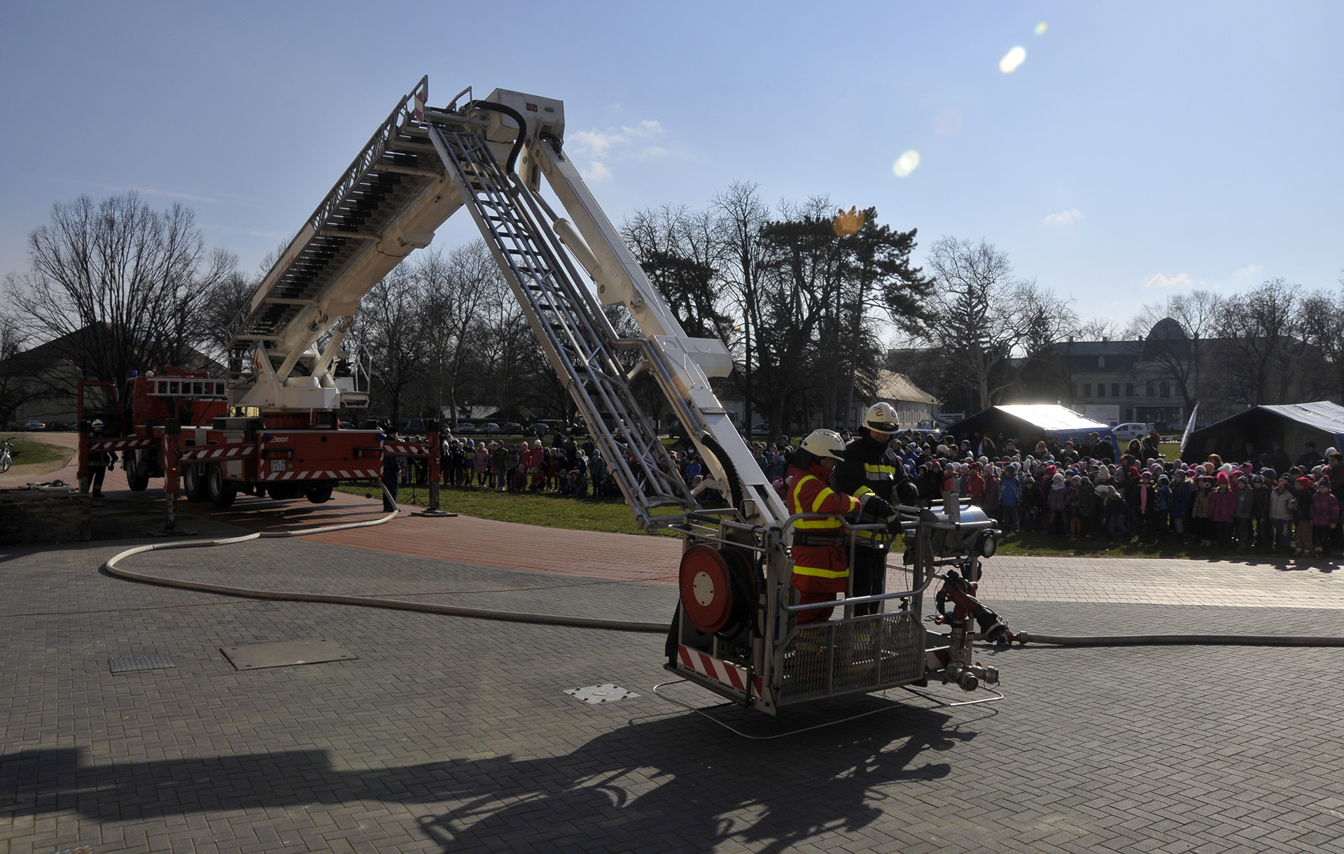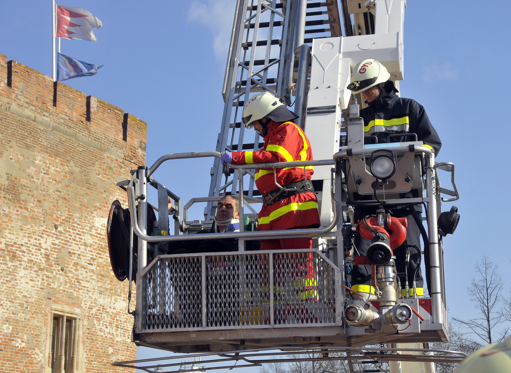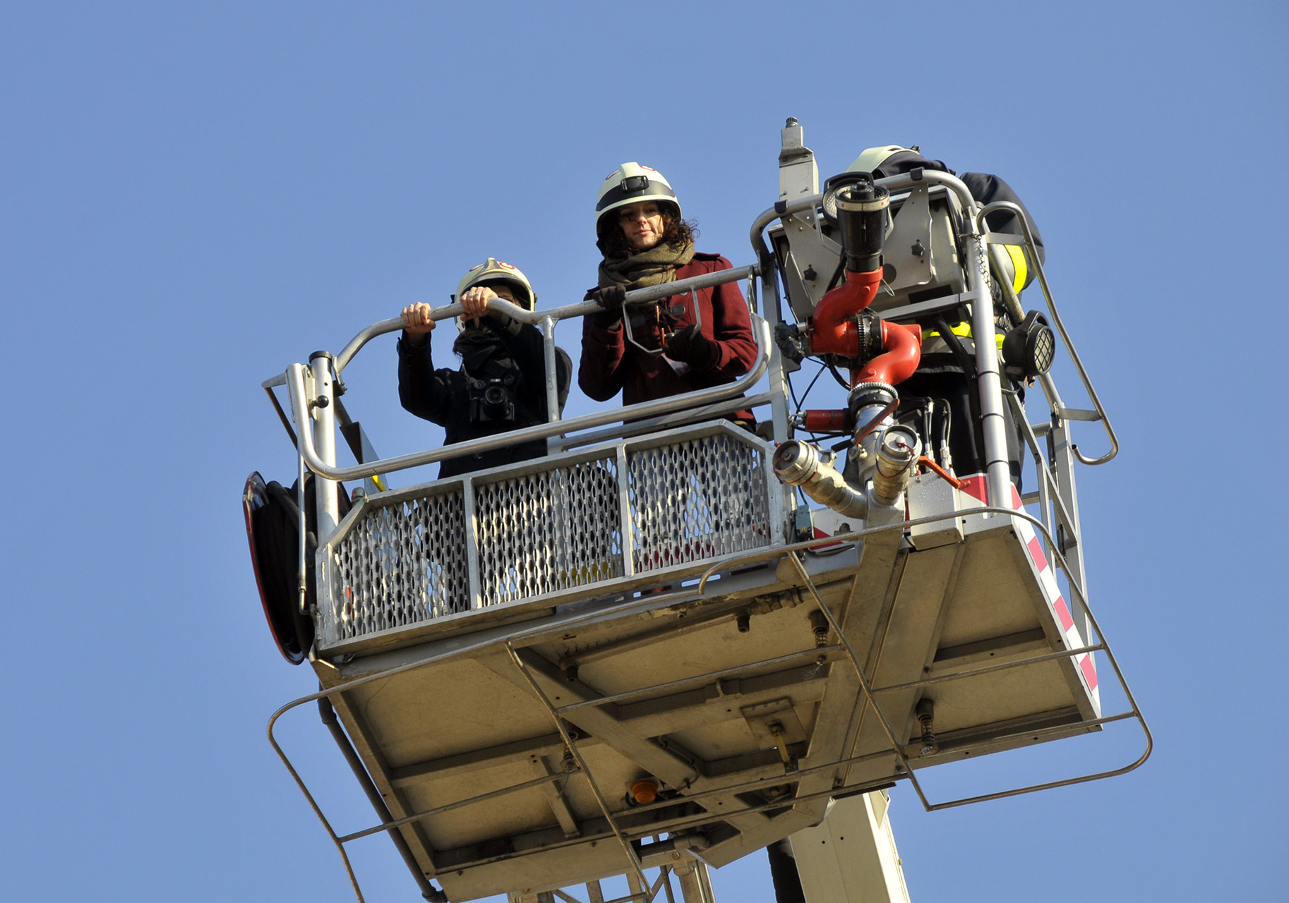 A bemutató után a tűzoltók szigorú felügyelete mellett a közelgő nőnap alkalmából a legbátrabb hölgyek ki is próbálhatták, milyen érzés a "kosárban utazni".