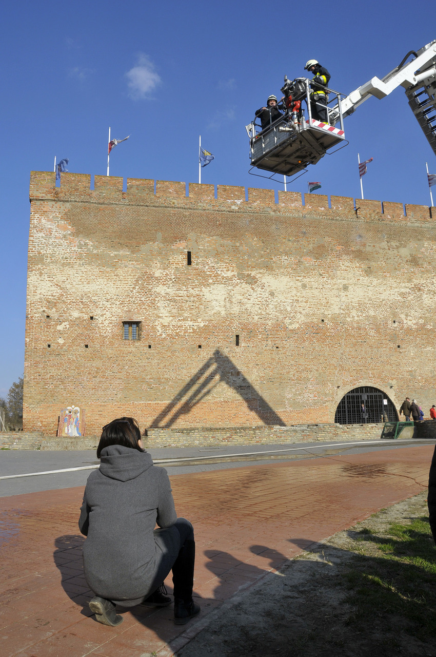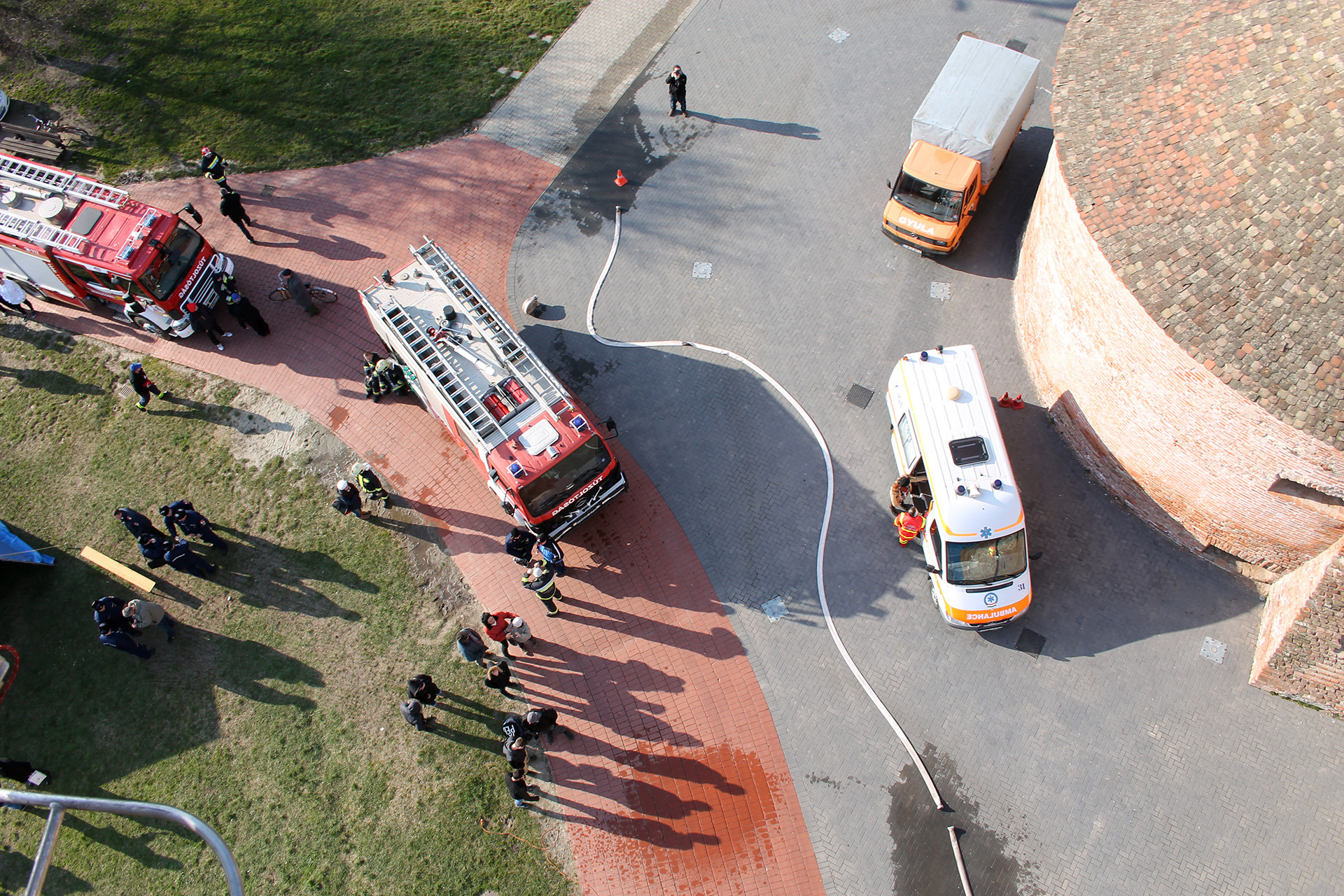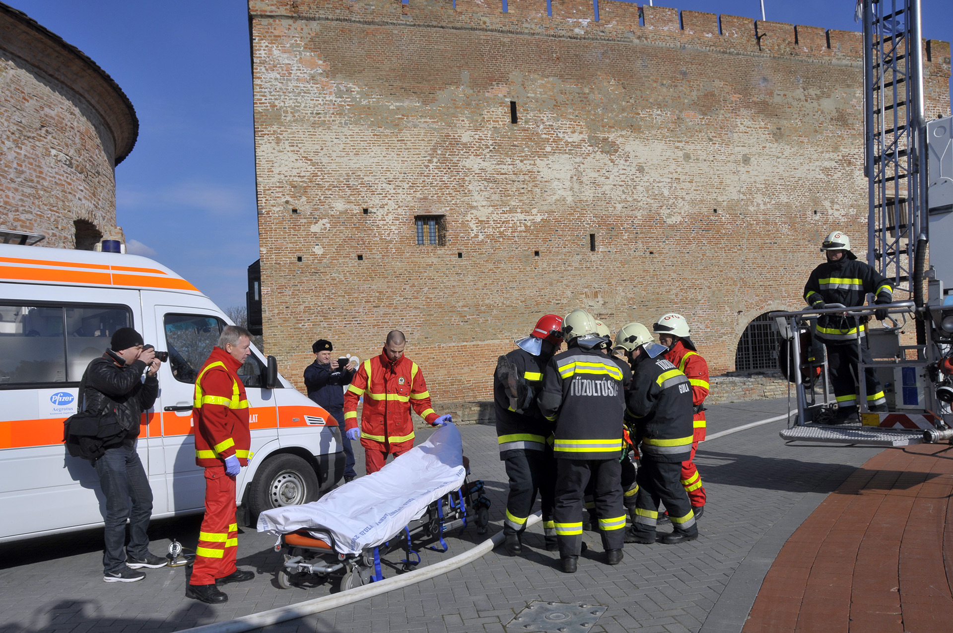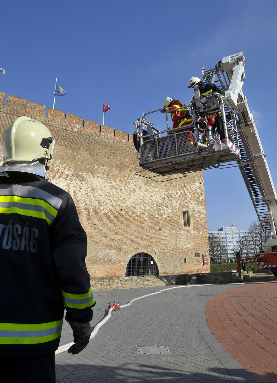 A rendszerbeállító szimulációs gyakorlatot Maczek Szilárd tűzoltó őrnagy, a Békés Megyei Katasztrófavédelmi Igazgatóság megyei tűzoltósági főfelügyelője vezényelte le. A bemutató során a Gyulai Hivatásos Tűzoltó-parancsnokság és a gyulai mentőállomás munkatársai a várfal legfelső szintjéről mentettek ki egy magasban rekedt karbantartót, majd figyelemmel kísérhettük a vízágyúval történő tűzoltás gyakorlatát is.