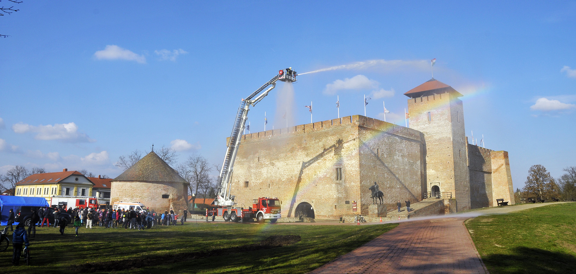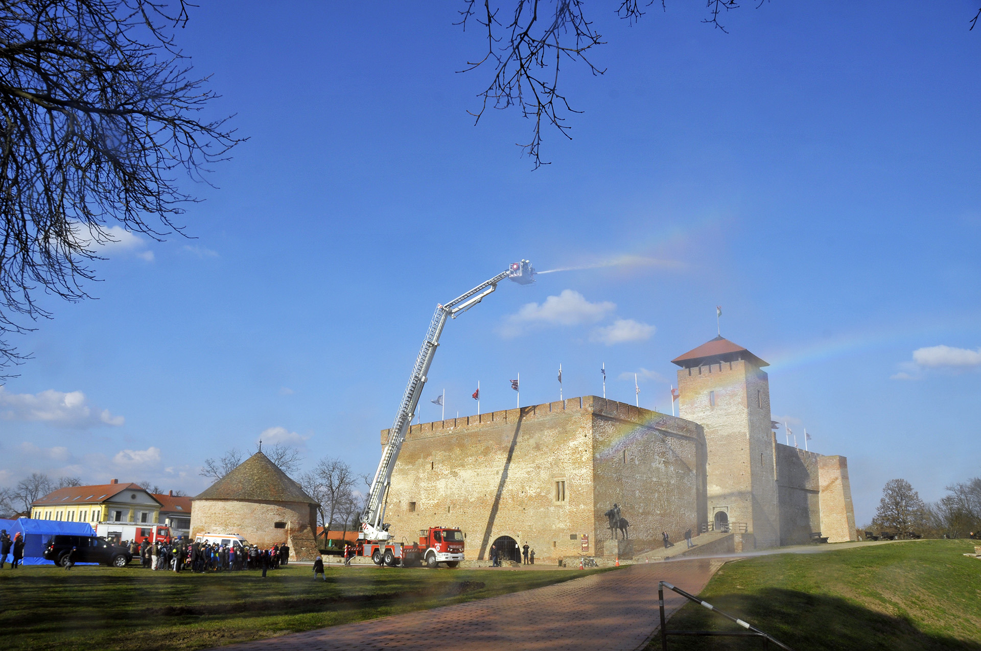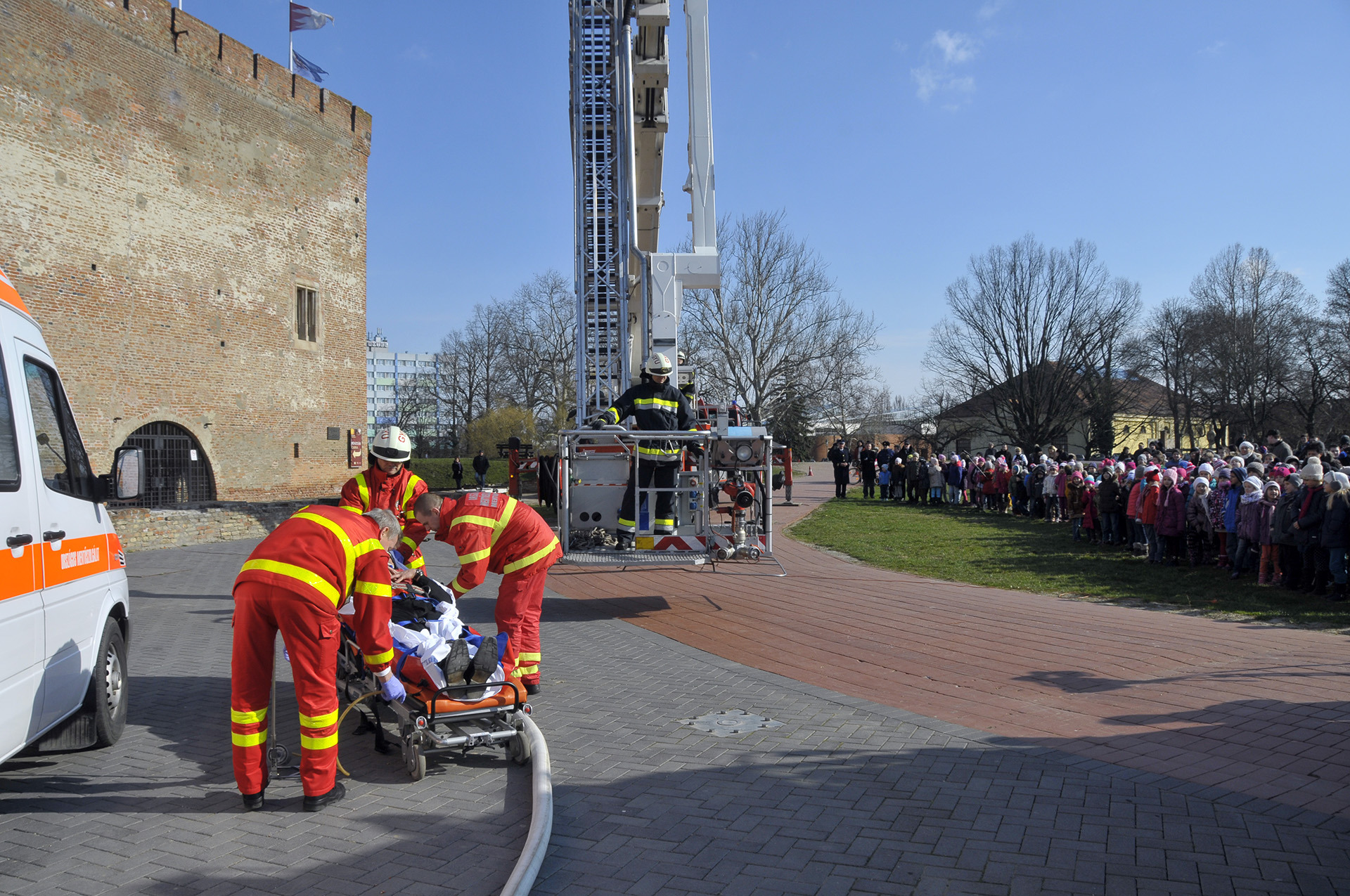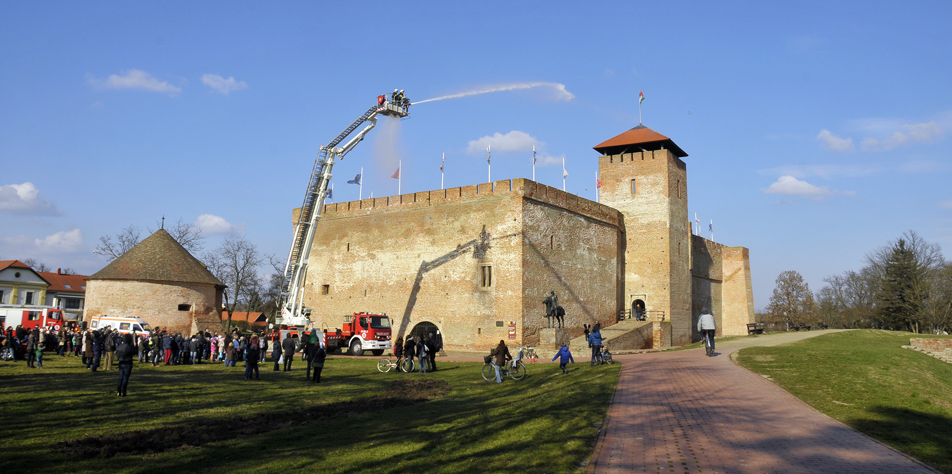 A rendszerbeállító szimulációs gyakorlatot Maczek Szilárd tűzoltó őrnagy, a Békés Megyei Katasztrófavédelmi Igazgatóság megyei tűzoltósági főfelügyelője vezényelte le. A bemutató során a Gyulai Hivatásos Tűzoltó-parancsnokság és a gyulai mentőállomás munkatársai a várfal legfelső szintjéről mentettek ki egy magasban rekedt karbantartót, majd figyelemmel kísérhettük a vízágyúval történő tűzoltás gyakorlatát is.