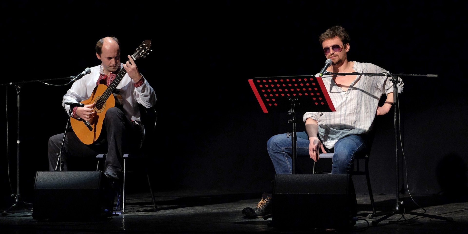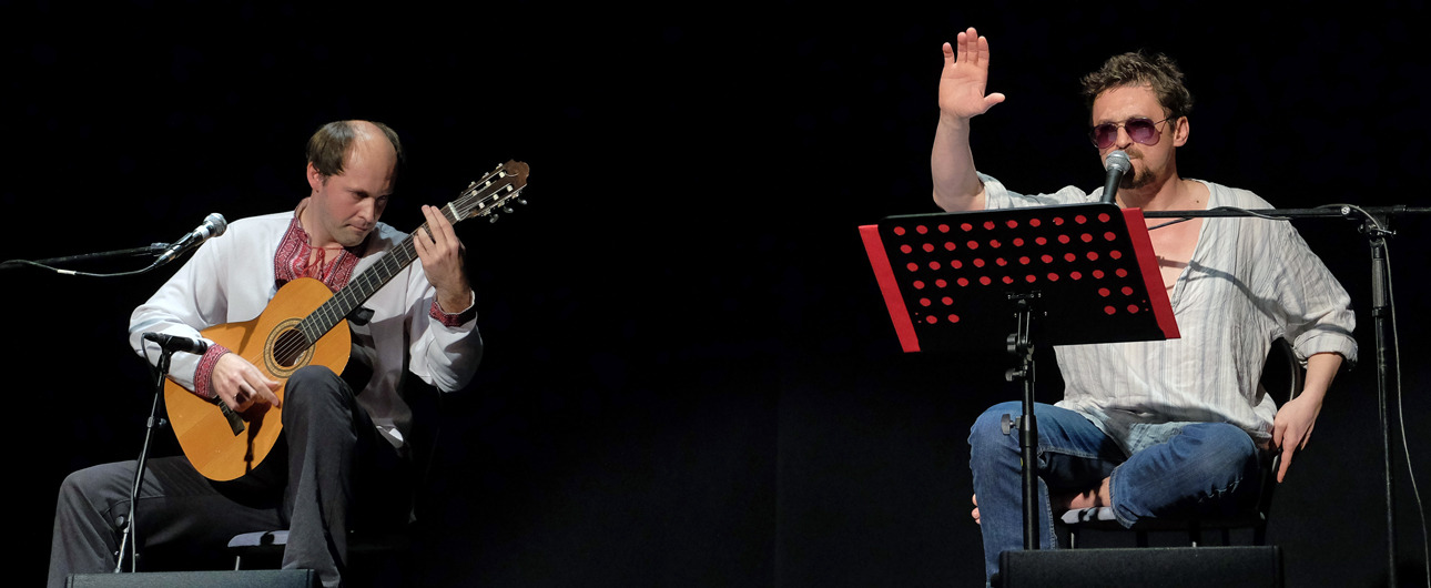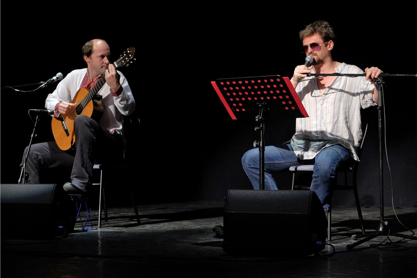 A már 5-6 éve Gyulára járó Aradi Kamaraszínház ezúttal a miskolci Grund Pinceszínházzal közösen készített, két teljesen különálló előadással érkezett. Az Oroszok Harsányi Attila Viszockij-estje, melyet Vihula Mihajlo, a nemzetközi hírű ukrán gitárművész kísér, az Amerikaiak pedig Harsányi Attila és Varga Andrea színházi koncertje.