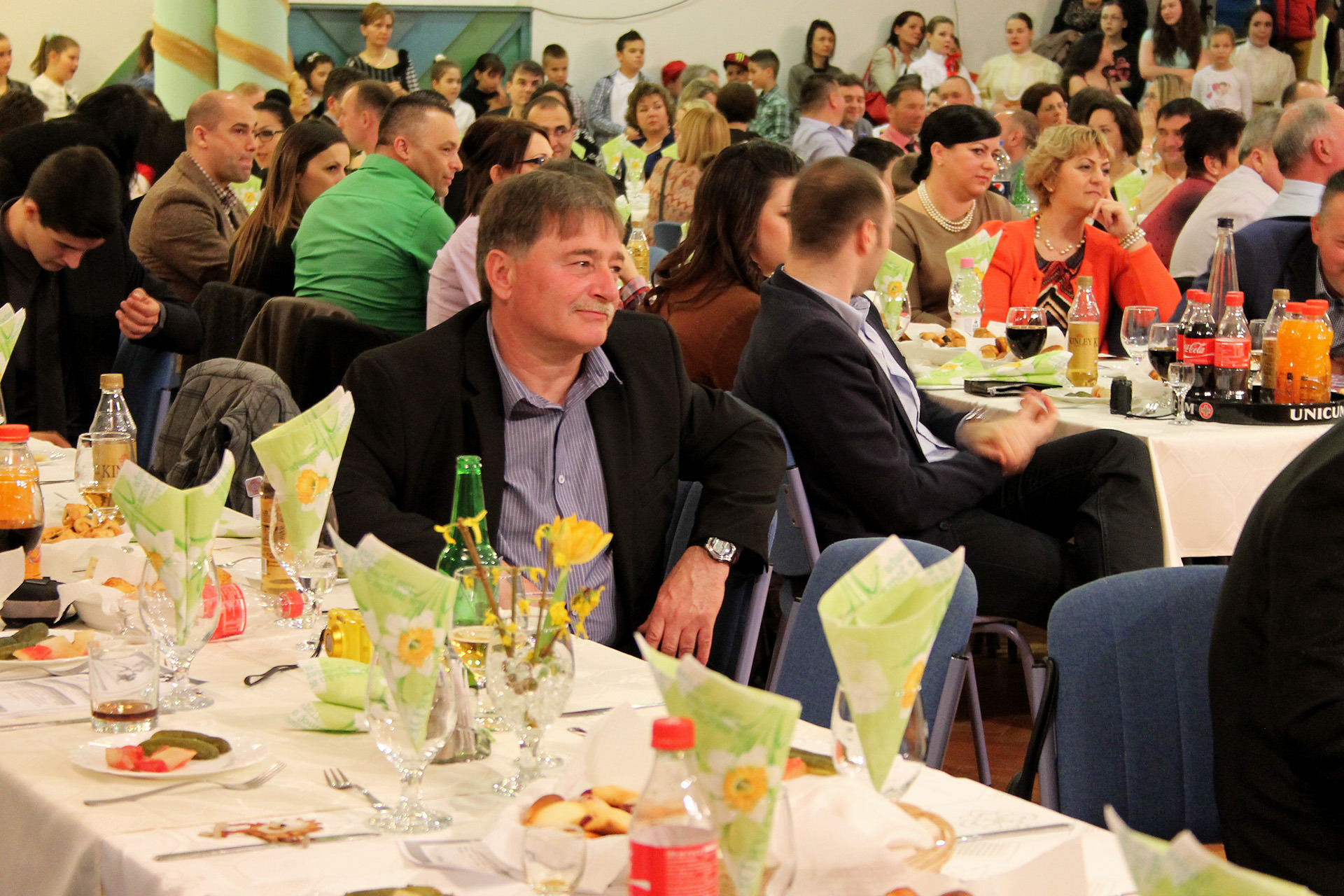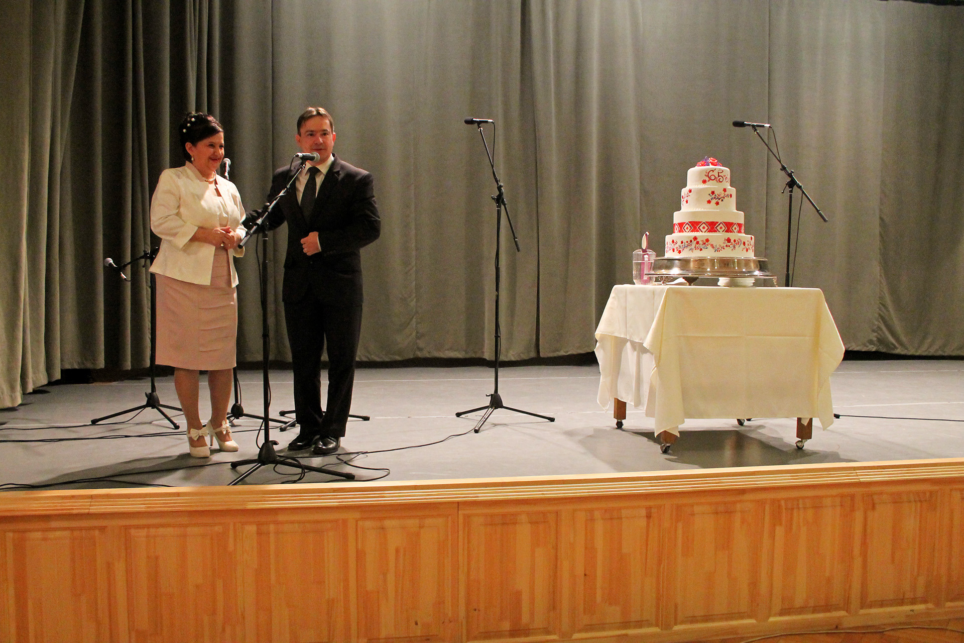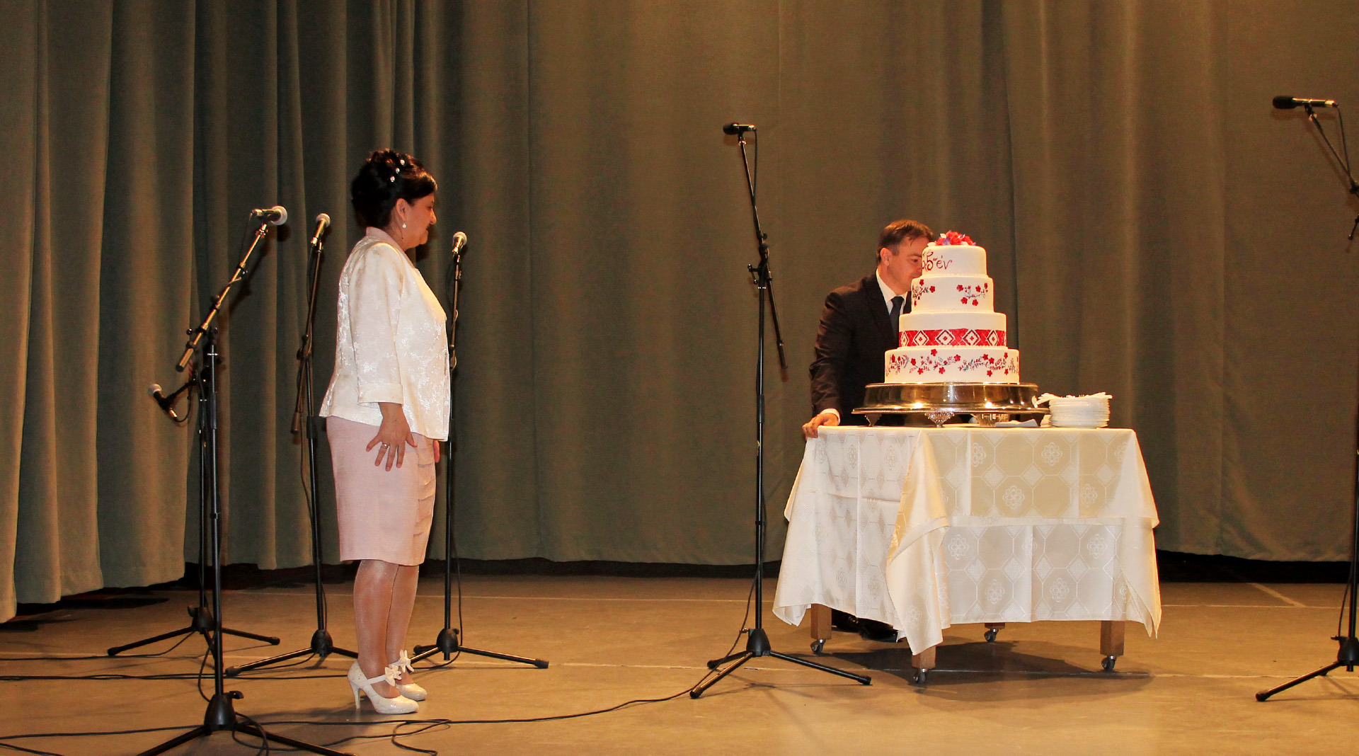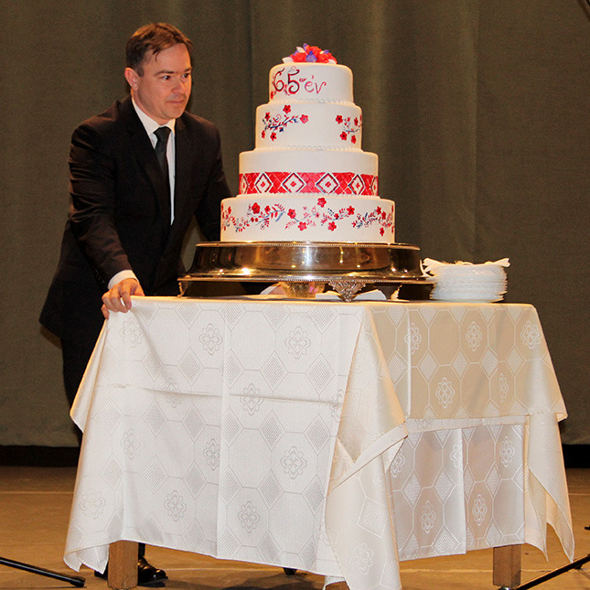 Az alpolgármester meglepetéssel is készült a jeles ünnepre, így köszöntője után egy hatalmas, népi motívumokkal díszített, emeletes tortát gurított be a színpadra. Az édes remekművel városunk nevében gratulált az elmúlt 65 esztendőhöz.