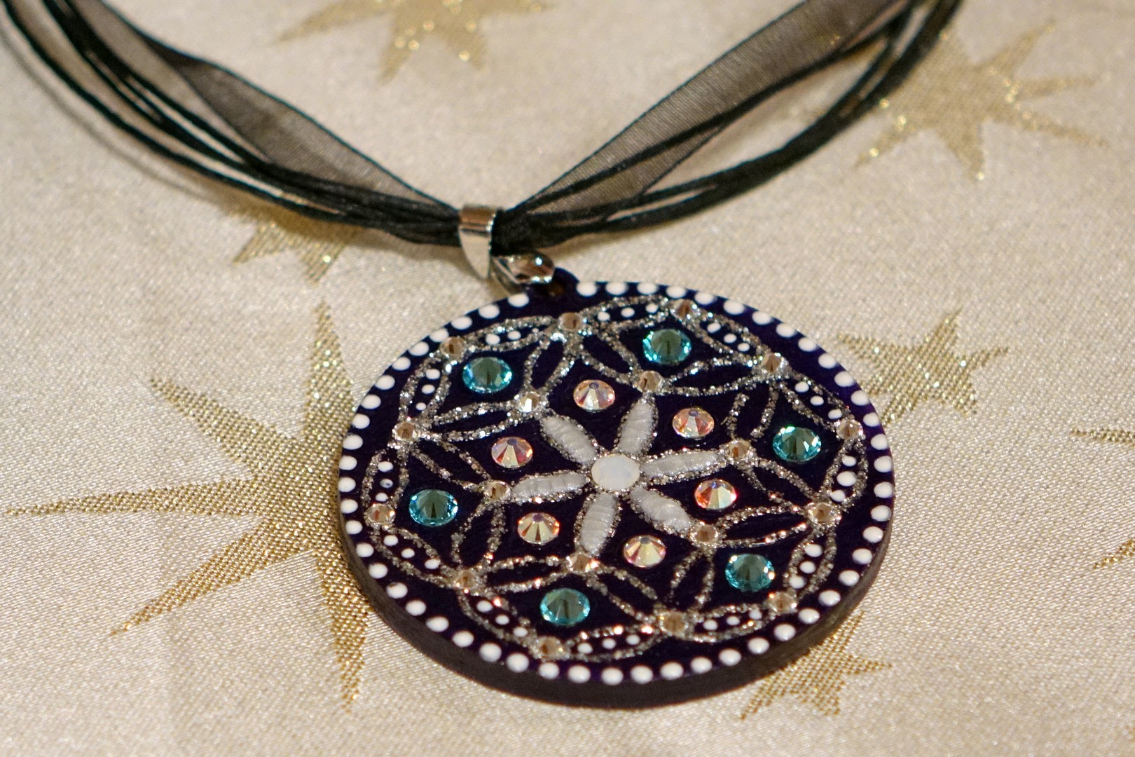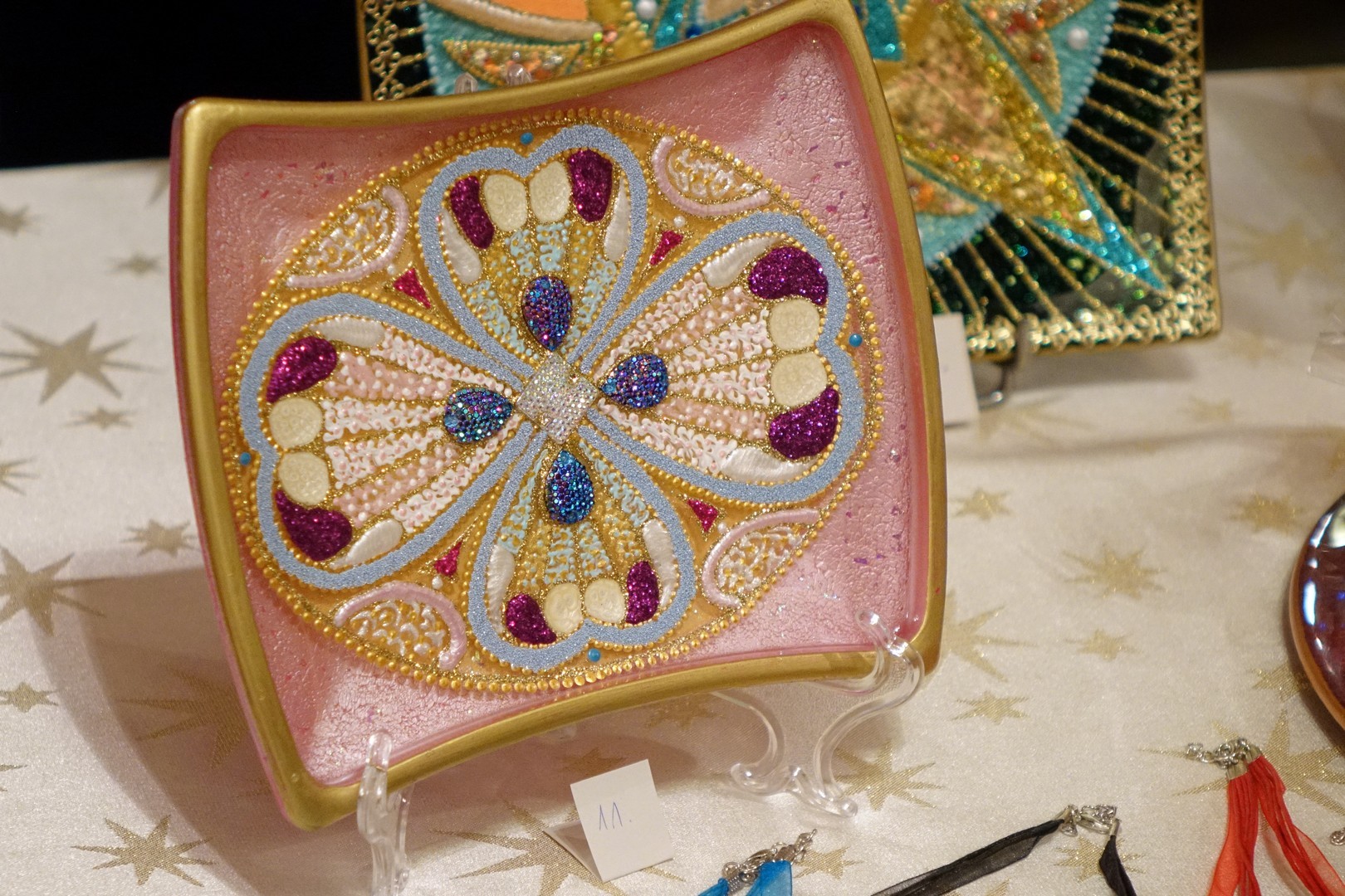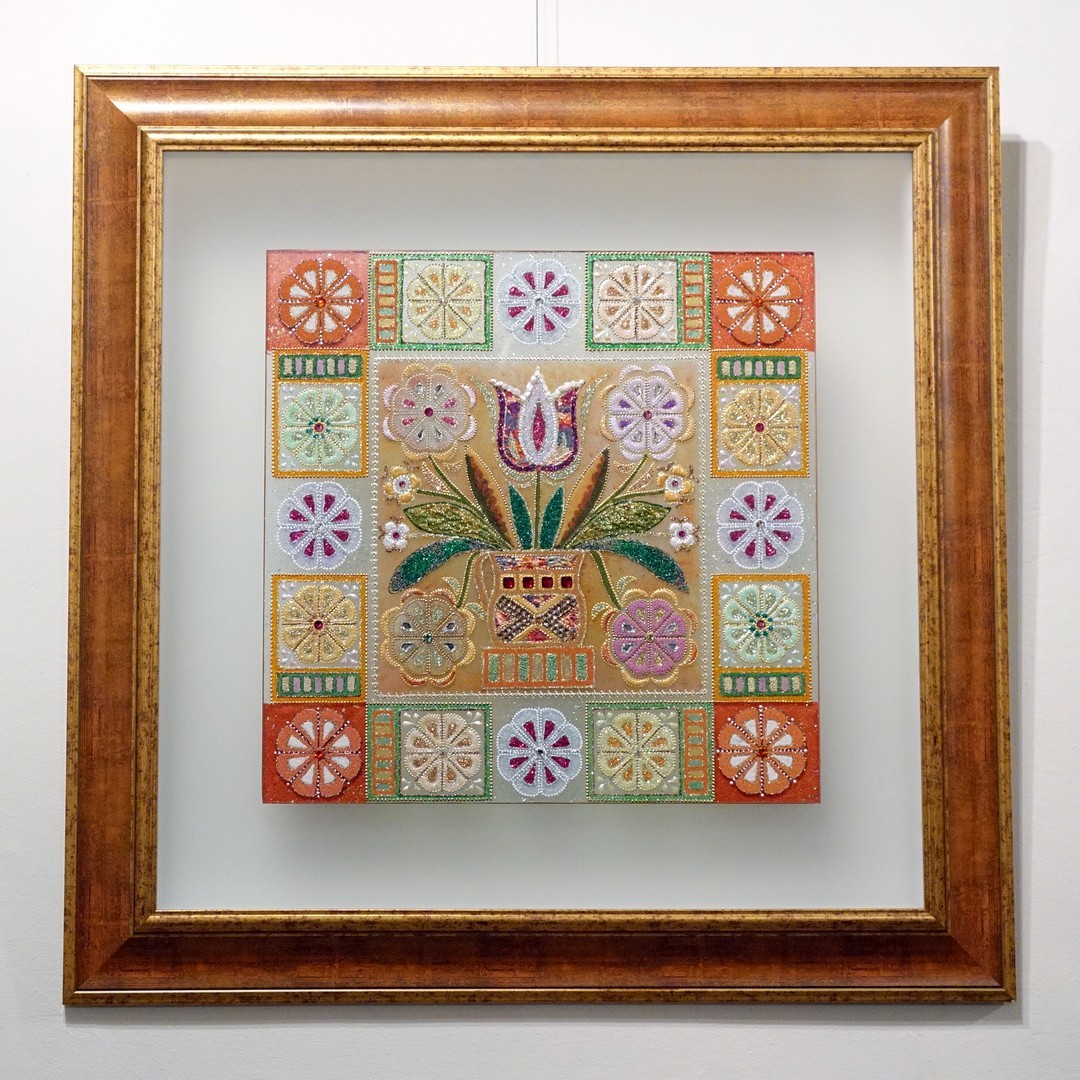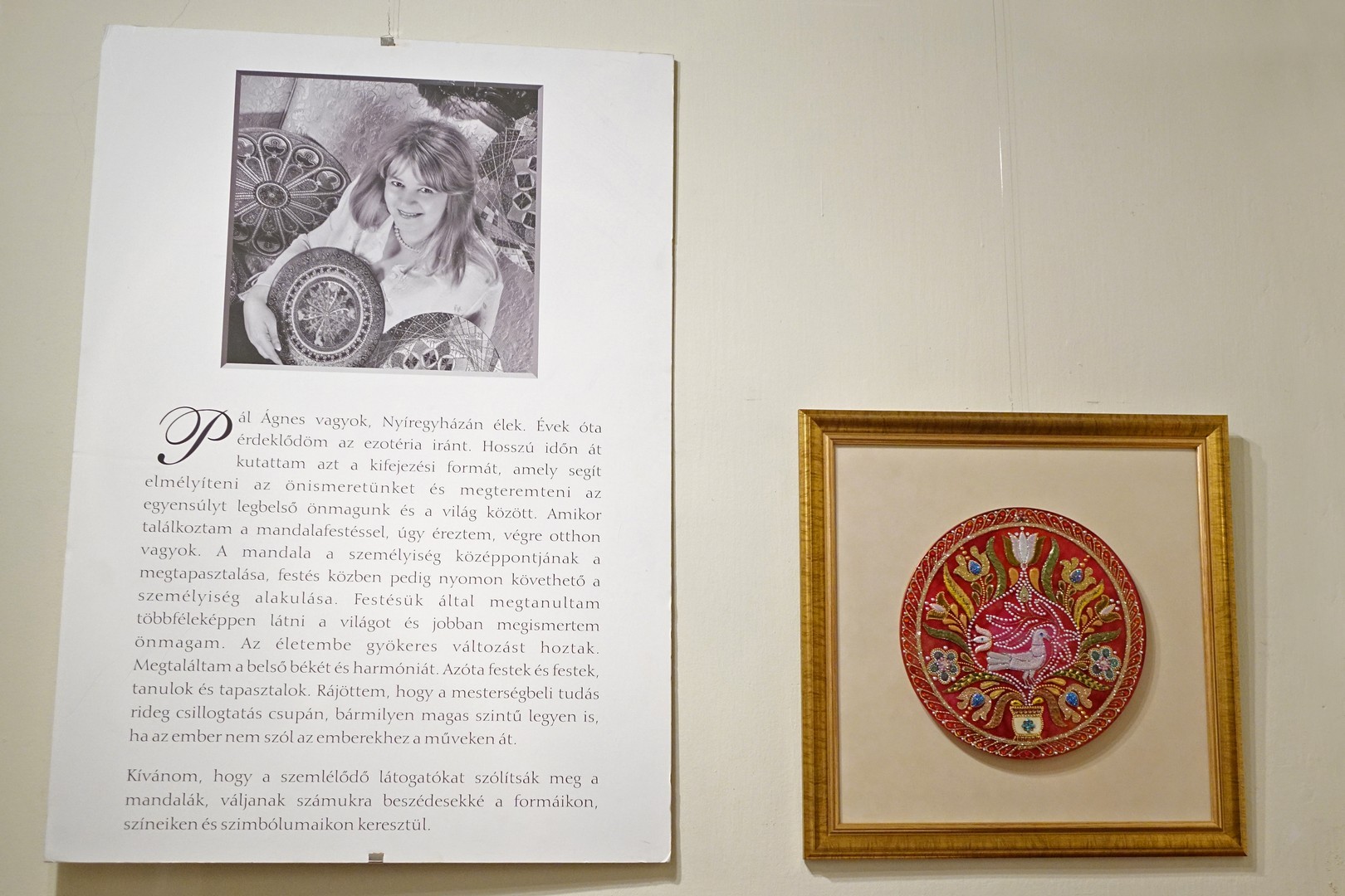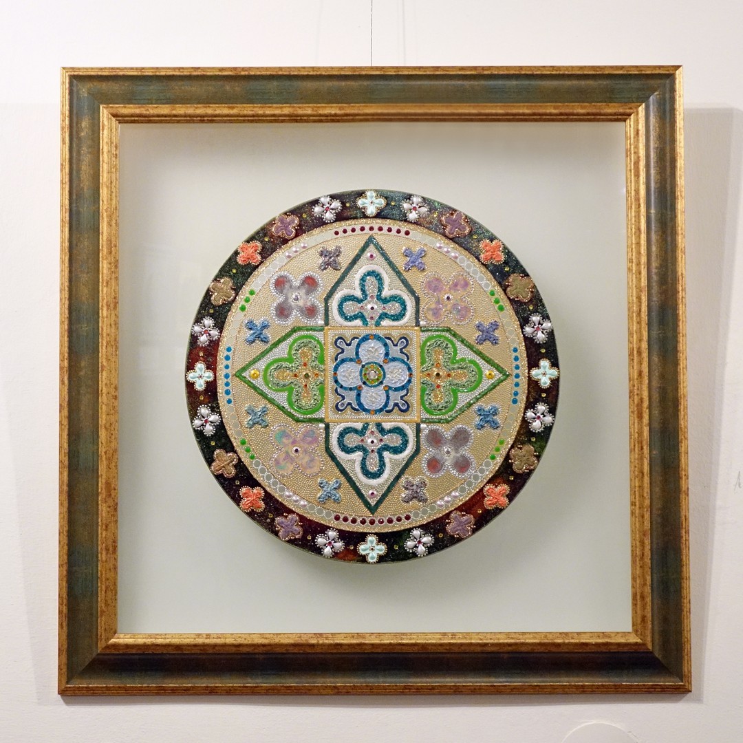 A mandala, az Indiában és Tibetben még ma is elterjedt szakrális ábrázolás nem kíván nyelvi tudást nézőjétől, csupán érdeklődést és nyitottságot. Pál Ágnes nyíregyházi alkotó évtizedek óta készít mandalákat, üvegre felvitt alkotásai főleg csillámporból, kristályokból, struktúrpasztából, ásványi zúzalékokból és Swarovski kristályból állnak. Színekben pompázó, csillogó képei kidomborodó íriszekként néznek vissza reánk a kamaragalériában.