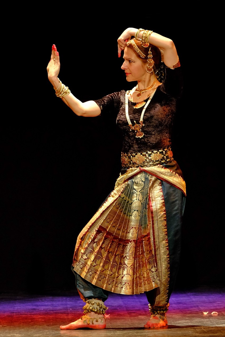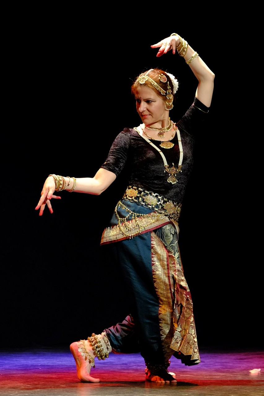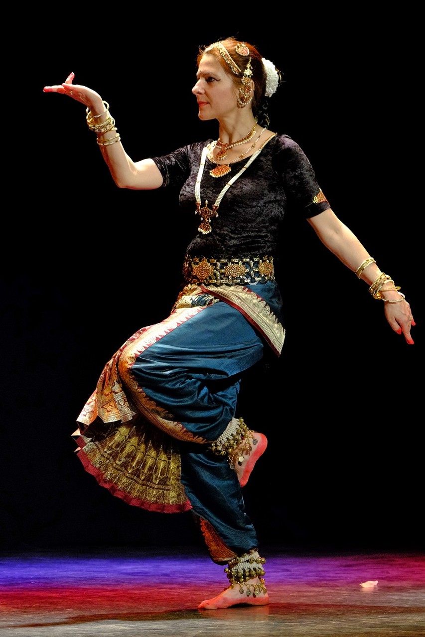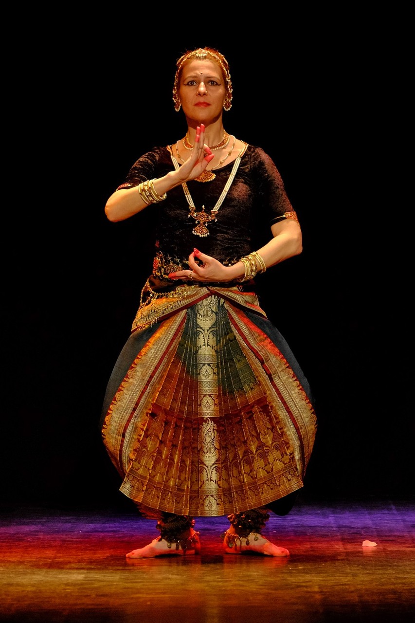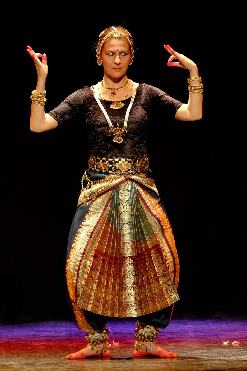 A tánc engesztelő imával kezdődött, amiért a táncos lábával a földet tapodta, majd a Föld és Ég áldását kérve kezdődhettek csak a kötött sorrendű, komplex táncok. Varázslatos látványnak lehettünk tanúi, amikor felcsendültek a jellegzetes, ritmusos énekek és autentikus indiai hangszerek, az ütős tabla, a pengetős szitár, a vonós sarangi, a fafúvós bansuri. Az első táncban egy virágáldozatot láttunk, a másodikban egy felajánló táncot, amelyben az isten menyasszonya készülődik a menyegzőre, majd a „tiszta táncban” technikai elemek koreográfiáját. Az előadás csúcspontját a drámai táncdarab képezte, amelyben a szimbólumok kapták a fő szerepet, a záróelemben végül a táncos a kicsinyes vágyaktól, a korlátoktól, a földi lét fizikai elemeitől való megszabadulást táncolta el.