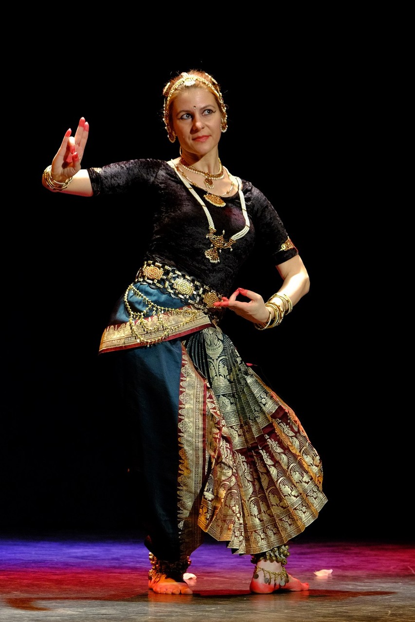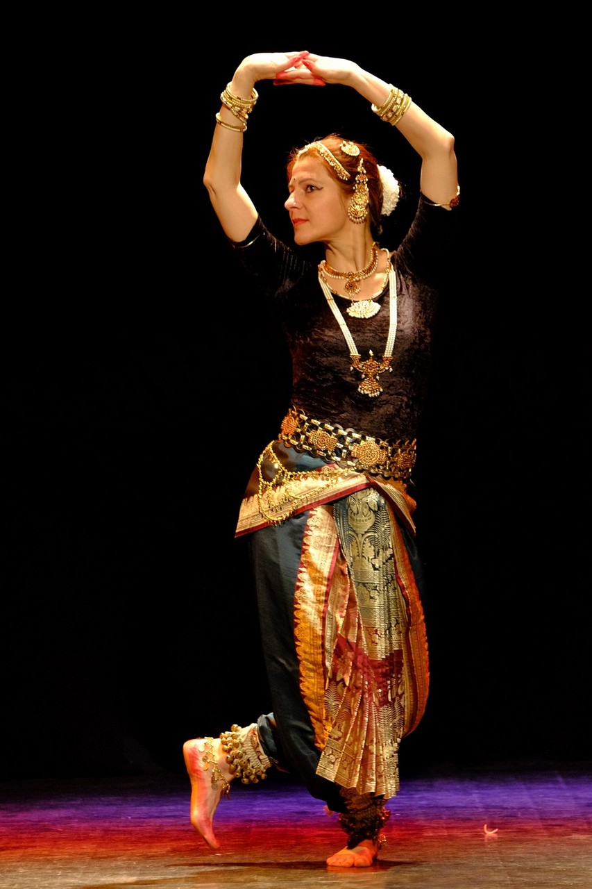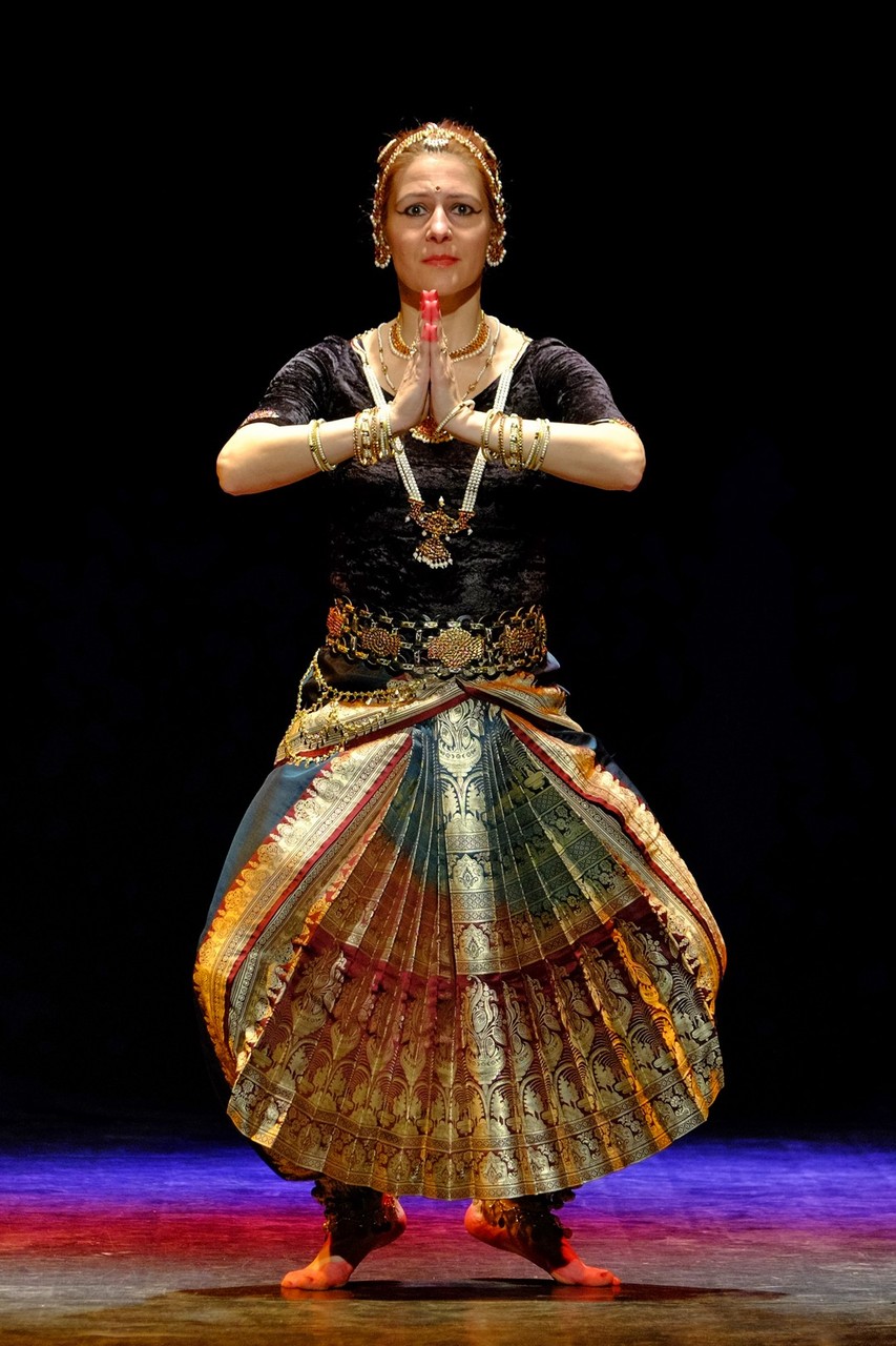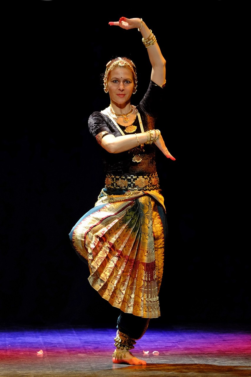 A tánc engesztelő imával kezdődött, amiért a táncos lábával a földet tapodta, majd a Föld és Ég áldását kérve kezdődhettek csak a kötött sorrendű, komplex táncok. Varázslatos látványnak lehettünk tanúi, amikor felcsendültek a jellegzetes, ritmusos énekek és autentikus indiai hangszerek, az ütős tabla, a pengetős szitár, a vonós sarangi, a fafúvós bansuri. Az első táncban egy virágáldozatot láttunk, a másodikban egy felajánló táncot, amelyben az isten menyasszonya készülődik a menyegzőre, majd a „tiszta táncban” technikai elemek koreográfiáját. Az előadás csúcspontját a drámai táncdarab képezte, amelyben a szimbólumok kapták a fő szerepet, a záróelemben végül a táncos a kicsinyes vágyaktól, a korlátoktól, a földi lét fizikai elemeitől való megszabadulást táncolta el.