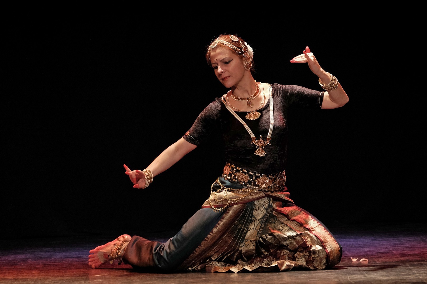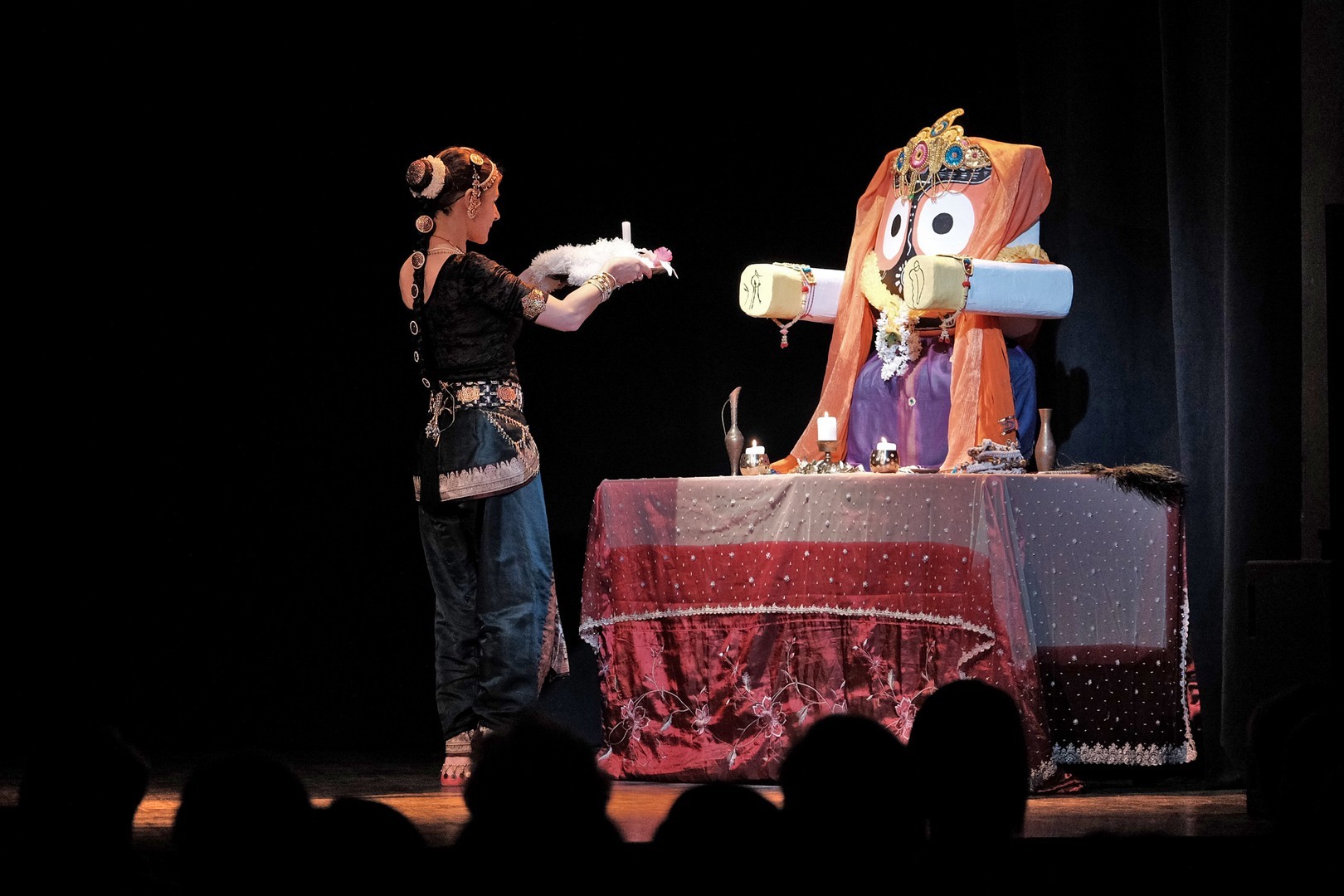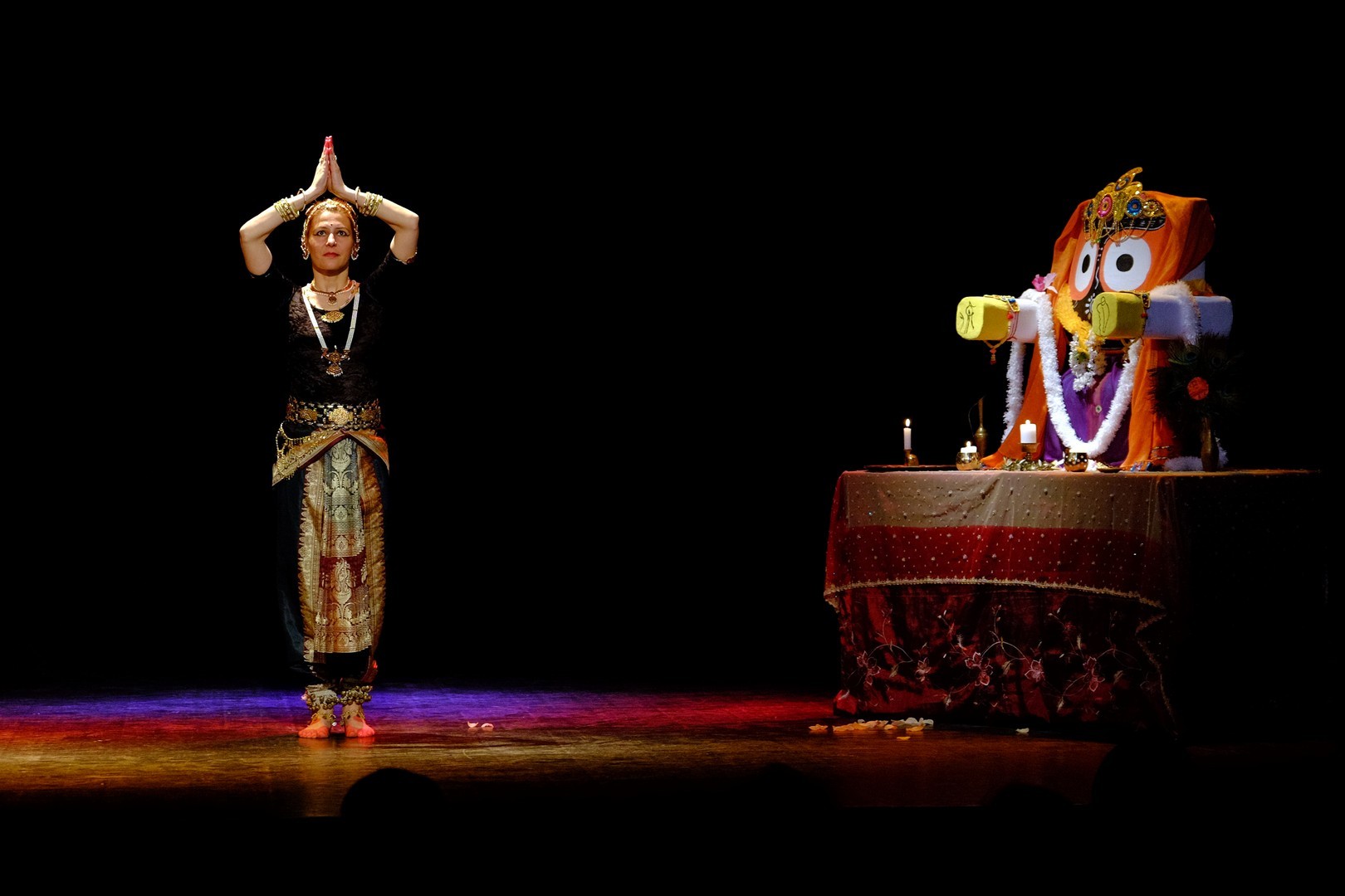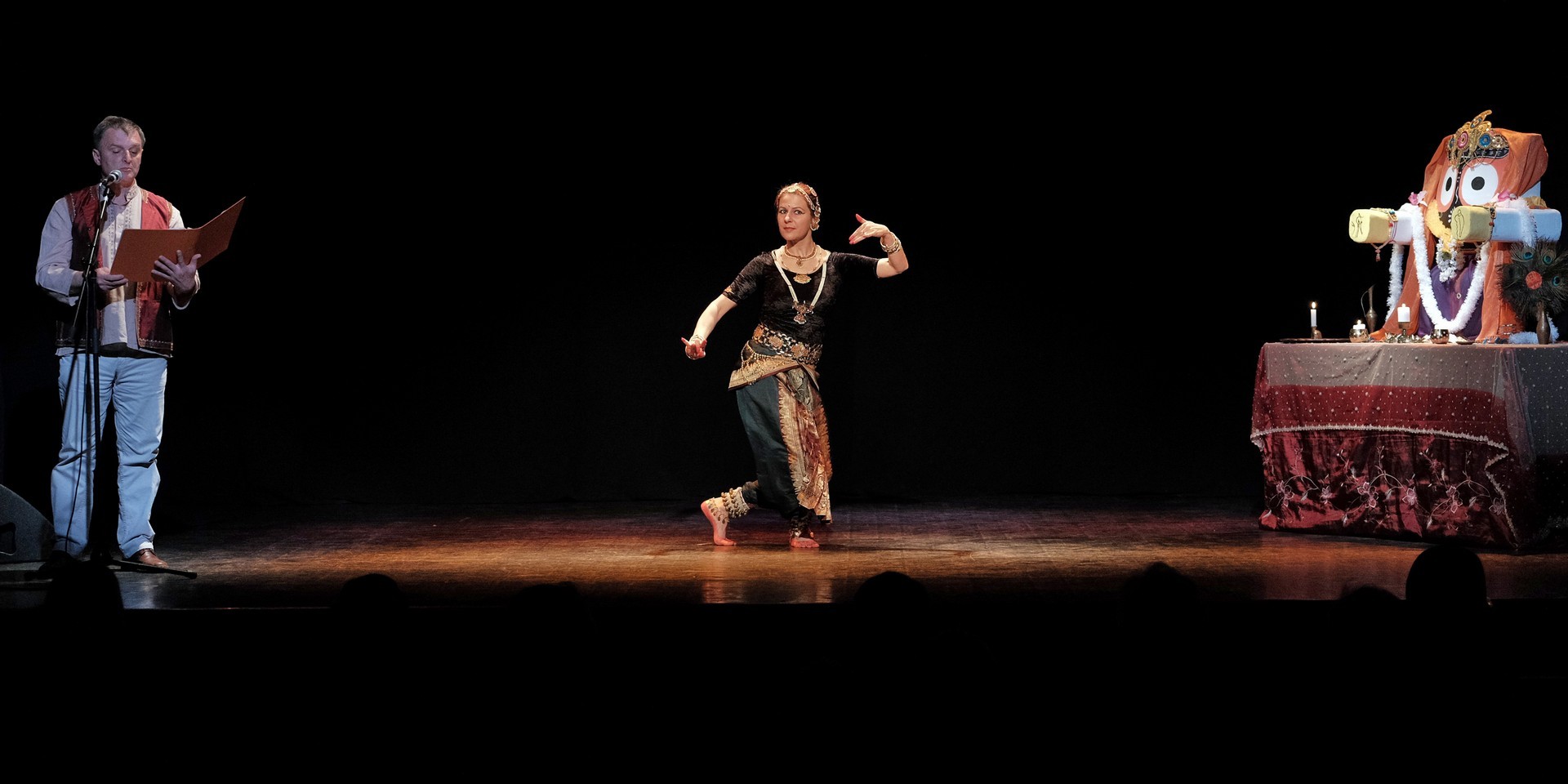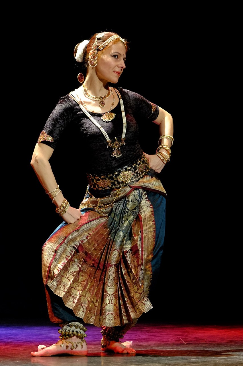 A tánc engesztelő imával kezdődött, amiért a táncos lábával a földet tapodta, majd a Föld és Ég áldását kérve kezdődhettek csak a kötött sorrendű, komplex táncok. Varázslatos látványnak lehettünk tanúi, amikor felcsendültek a jellegzetes, ritmusos énekek és autentikus indiai hangszerek, az ütős tabla, a pengetős szitár, a vonós sarangi, a fafúvós bansuri. Az első táncban egy virágáldozatot láttunk, a másodikban egy felajánló táncot, amelyben az isten menyasszonya készülődik a menyegzőre, majd a „tiszta táncban” technikai elemek koreográfiáját. Az előadás csúcspontját a drámai táncdarab képezte, amelyben a szimbólumok kapták a fő szerepet, a záróelemben végül a táncos a kicsinyes vágyaktól, a korlátoktól, a földi lét fizikai elemeitől való megszabadulást táncolta el.
