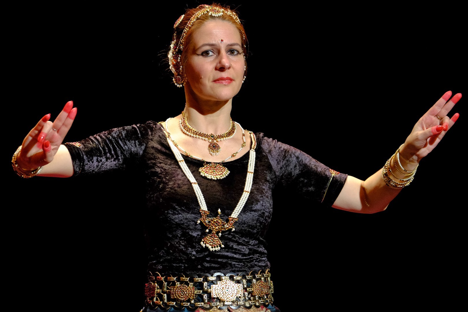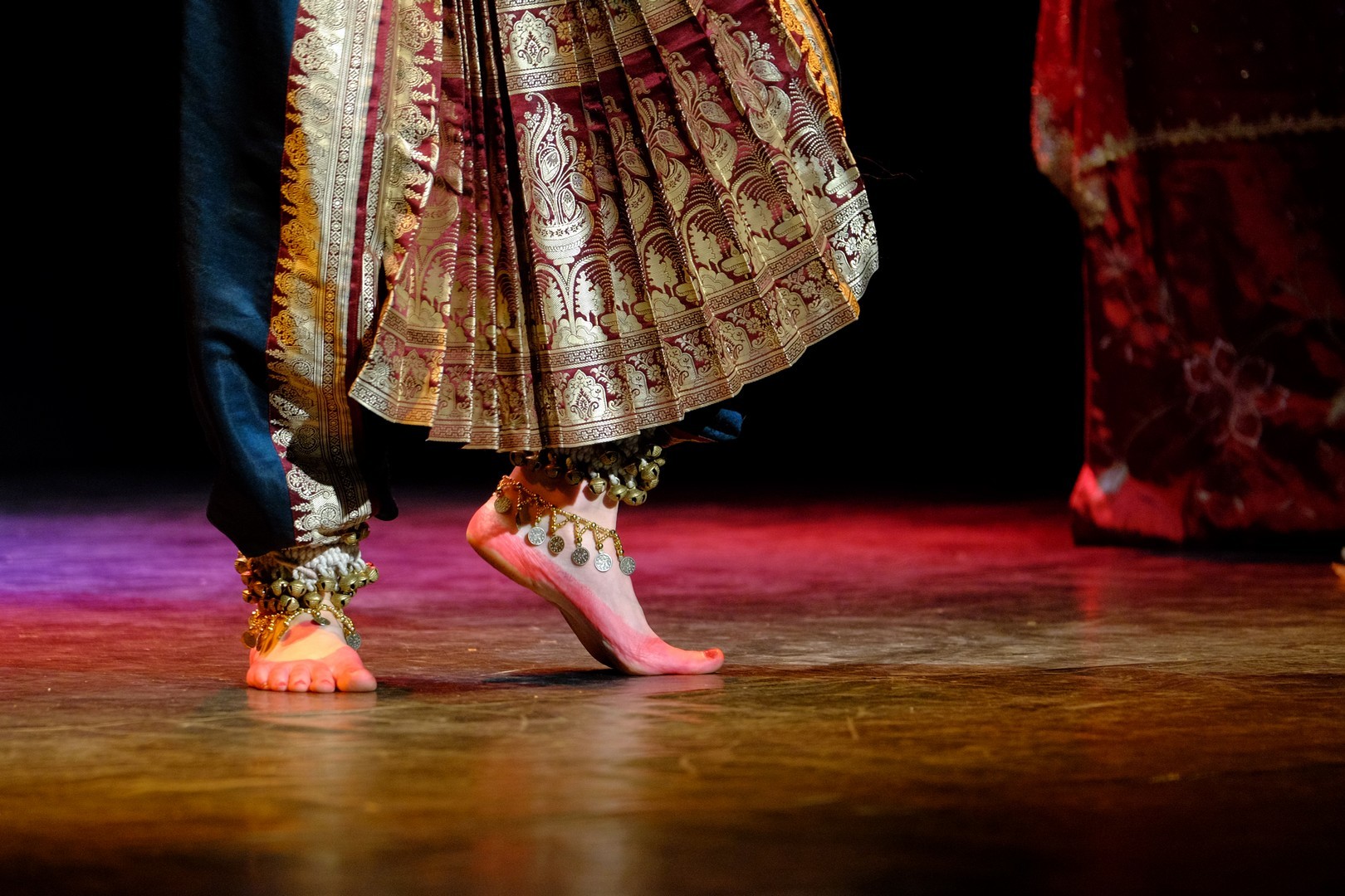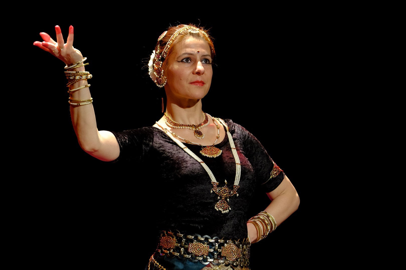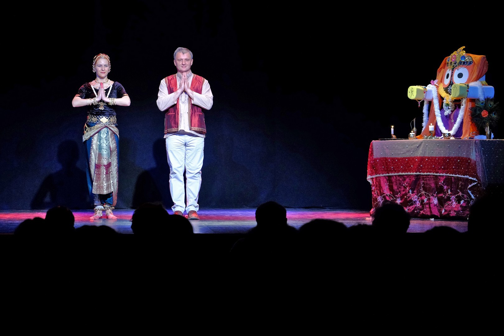 A tánc engesztelő imával kezdődött, amiért a táncos lábával a földet tapodta, majd a Föld és Ég áldását kérve kezdődhettek csak a kötött sorrendű, komplex táncok. Varázslatos látványnak lehettünk tanúi, amikor felcsendültek a jellegzetes, ritmusos énekek és autentikus indiai hangszerek, az ütős tabla, a pengetős szitár, a vonós sarangi, a fafúvós bansuri. Az első táncban egy virágáldozatot láttunk, a másodikban egy felajánló táncot, amelyben az isten menyasszonya készülődik a menyegzőre, majd a „tiszta táncban” technikai elemek koreográfiáját. Az előadás csúcspontját a drámai táncdarab képezte, amelyben a szimbólumok kapták a fő szerepet, a záróelemben végül a táncos a kicsinyes vágyaktól, a korlátoktól, a földi lét fizikai elemeitől való megszabadulást táncolta el.
