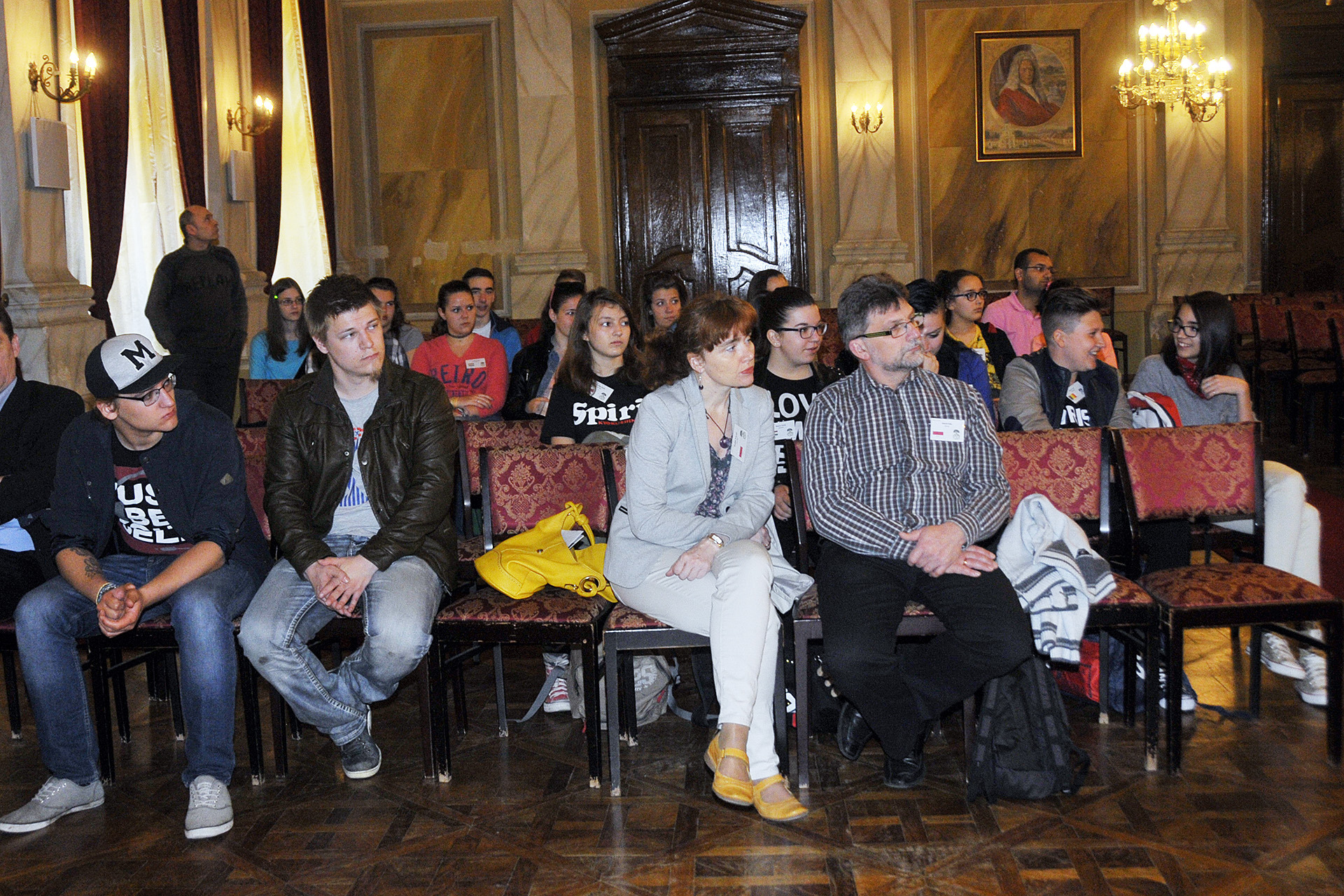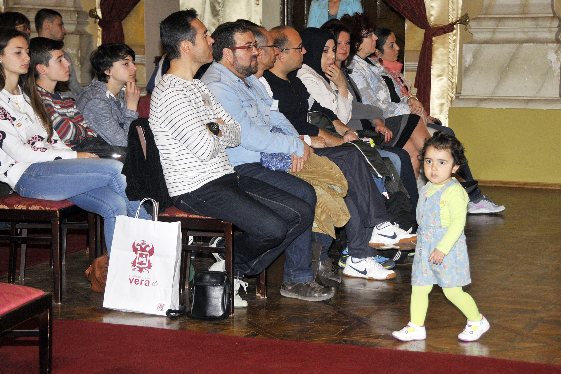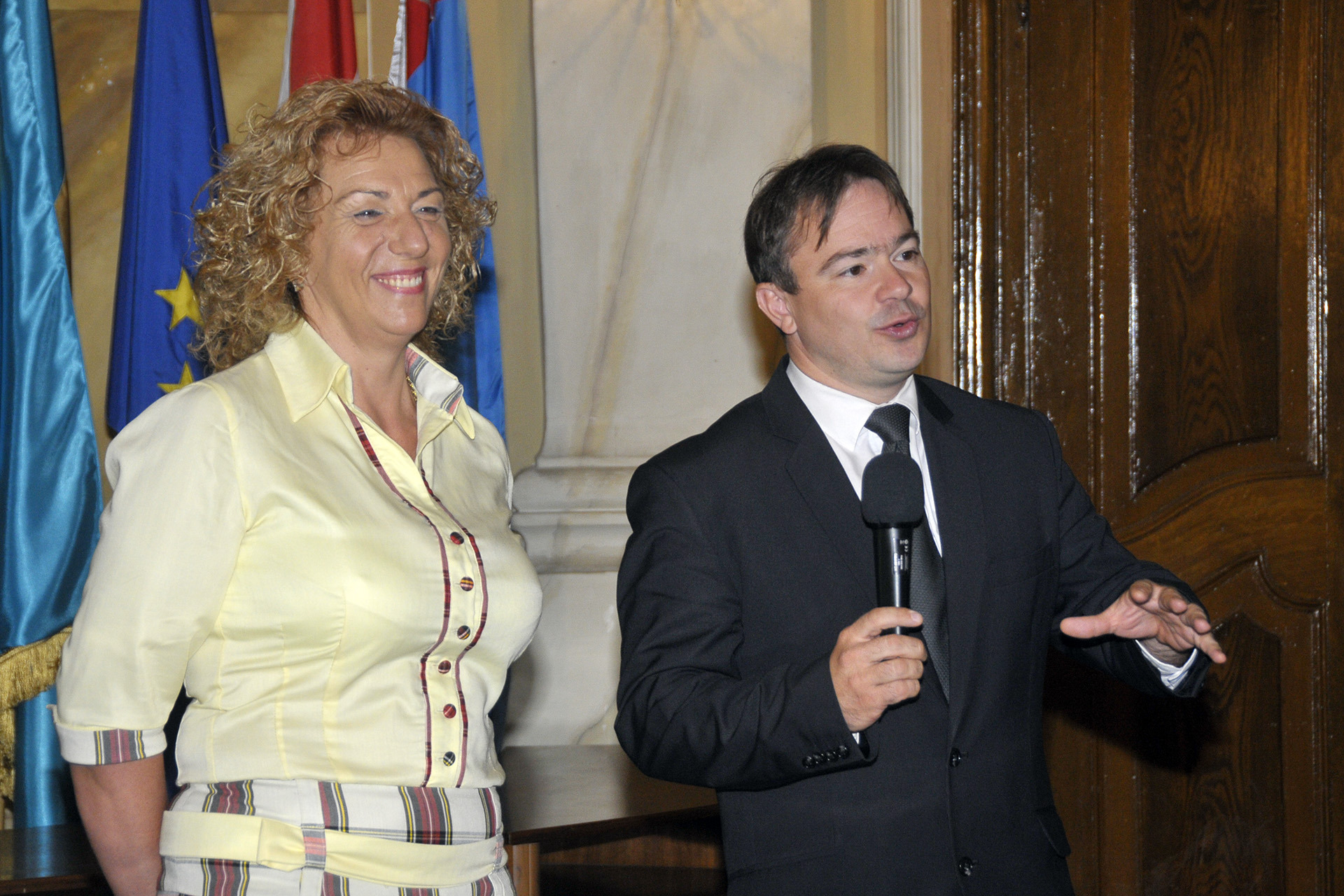 A 20 pedagógusból és 20 diákból álló küldöttséget Kónya István, Gyula város alpolgármestere és Hajnal Edit városmarketing-referens üdvözölte a városháza dísztermében. Kónya István beszédében örömét fejezte ki, hogy a nemzetközi programnak köszönhetően igazi barátságok alakulhatnak ki, ezért biztosította a jelenlévőket, hogy a városvezetés támogatja a projekt folytatását. A városvezető köszöntőjében röviden városunk természeti, építészeti és kulturális nevezetességeit is bemutatta: beszélt többek között környezeti értékeinkről, vizeinkről, tavainkról, a városházáról, a hamarosan megnyíló Almásy-kastélyról és természetesen a gyulai kolbászról is.