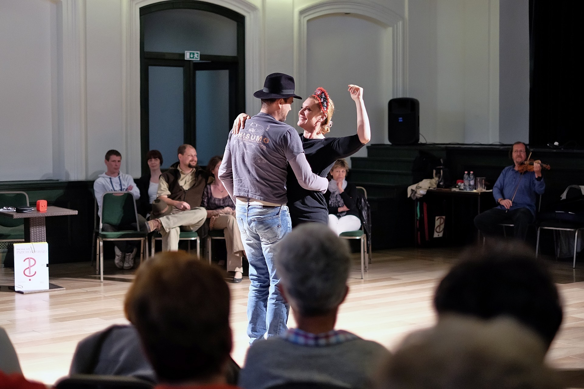 Az április 29-én, a gyulai Vigadóban megrendezett program már berendezésében is rendhagyónak mutatkozott, ugyanis a körbe helyezett széksorok – ezúttal a színpad figyelmen kívül hagyásával – középen sejtették a játékteret, ahová hegedűszóra csárdást járva Hegyi Barbara és Debreczeny Csaba egy táncház lelkes párjaként meg is érkezett.