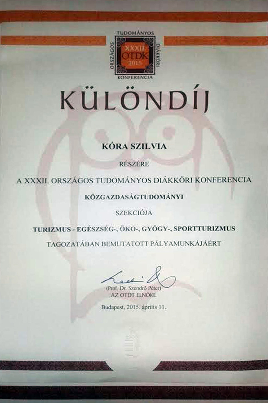 Tudományos elismerésben részesült az Országos Tudományos Diákköri Konferencián (OTDK) Kóra Szilvia, a Szent István Egyetem gyulai campusának idén végzett hallgatója. Kutató munkájáért a bizottság különdíjat adott az egészségturisztikai szakirányon summa cum laude diplomázott ifjú szakembernek, valamint konzulensét, Varga Dorottyát, a Szent István Egyetem tanársegédét illetve PhD hallgatóját is elismerte.