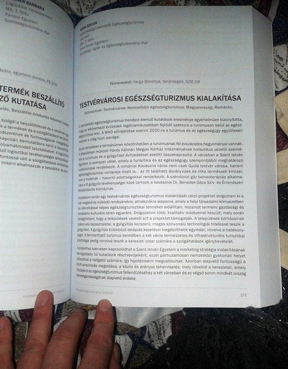 - Gyulán, az egészségügyi szervező szekcióban első helyezést értem el tavaly, így jutottam tovább a XXXII. Országos Tudományos Diákköri Konferencia Közgazdaságtudományi szekció Egészség-, Öko-, Gyógy-, Sportturizmus tagozatára Budapesten, amelyet a Budapesti Gazdasági Főiskola szervezett meg. Nagy élmény volt, hogy kiemelték dolgozatom innovatívságát. És annak is nagyon örültem, hogy konzulensem is elismerést kapott, hiszen az ő gondozásában készültem fel a versenyekre. Gratuláltak neki, maximálisan elismerték munkáját. Hatalmas élmény volt a verseny is, hiszen a szakma legnagyobbjai ültek a bíráló bizottság székében, olyanok, akiknek a szakirodalmaiból készültem fel – mondta Kóra Szilvia.