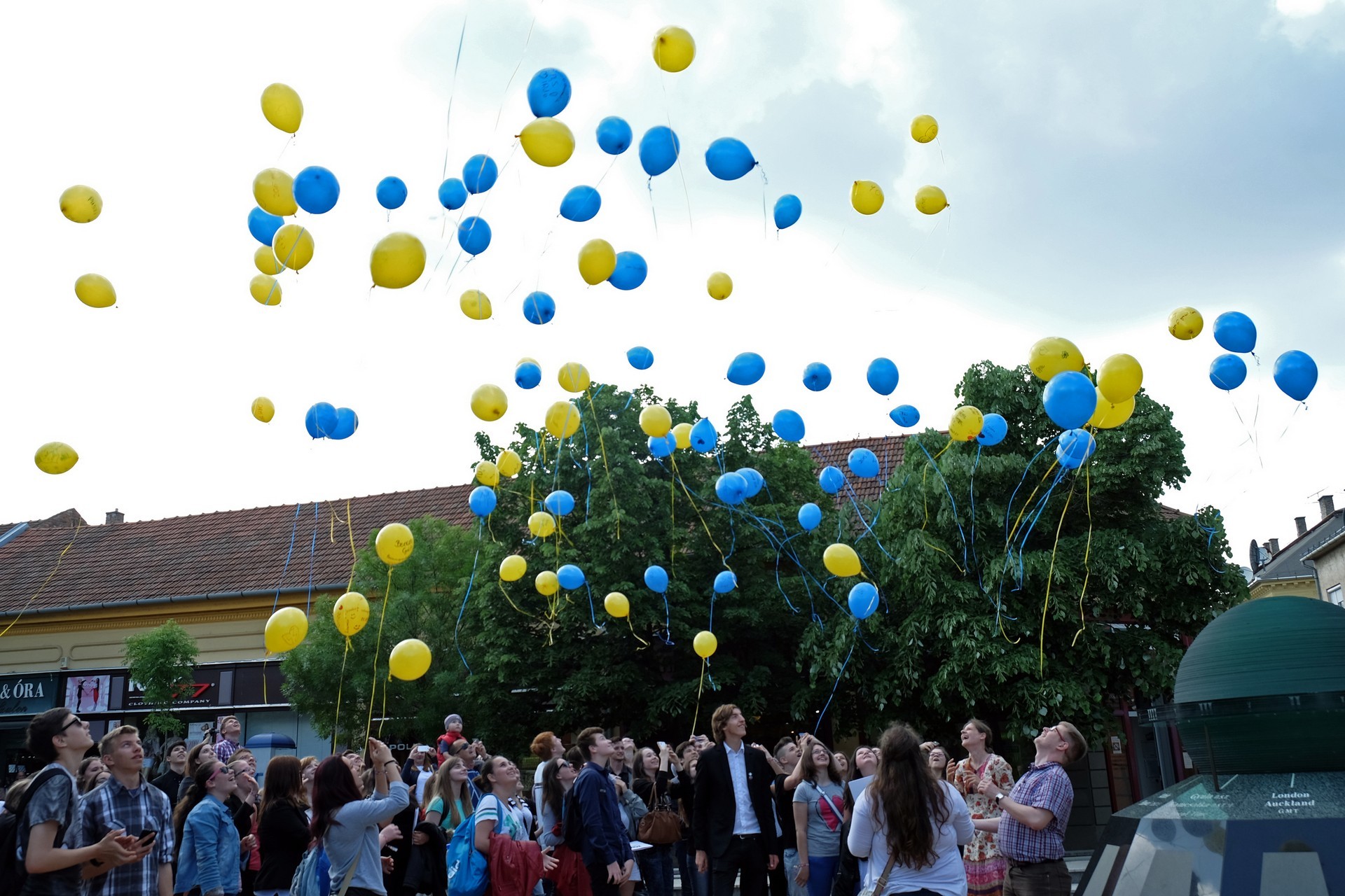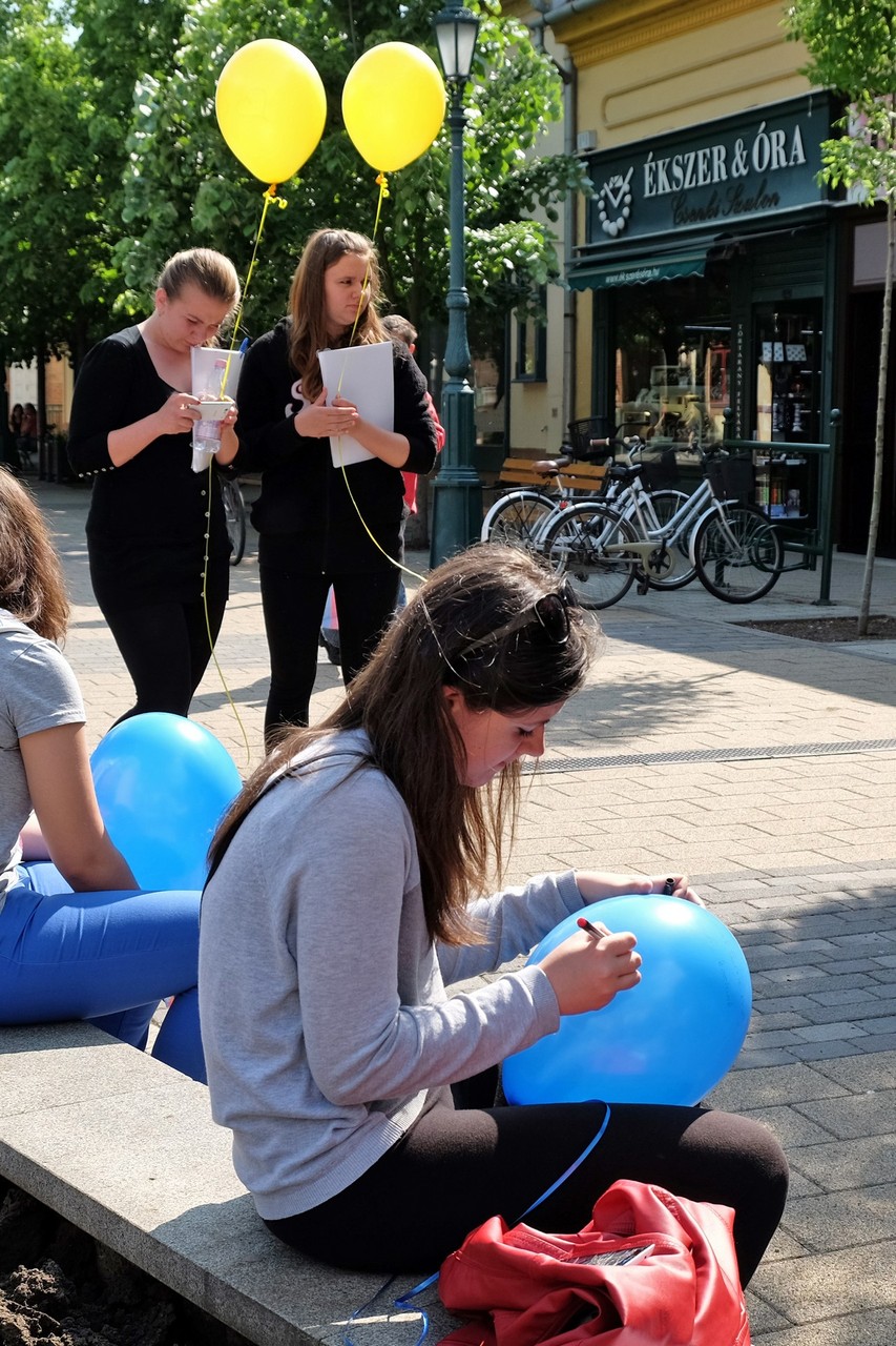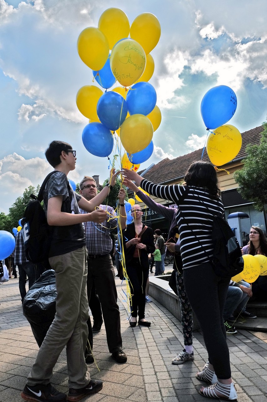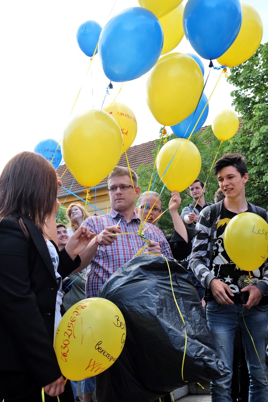 Végezetül, az egybegyűltek a Világórához vonultak, ahol 200 darab sárga és kék színű léggömböt osztottak szét a jelenlévők között. A diákok személyes üzenetekkel ruházták fel a színes lufikat, majd világgá kürtölve a konferencia sikerét, egyszerre engedték szélnek a ballonokat.