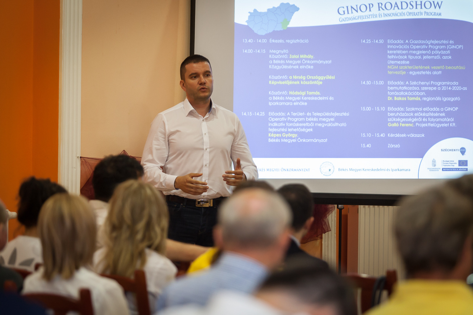 Néhány hónappal ezelőtt a Terület- és Településfejlesztési Operatív Programmal kapcsolatosan tartottak tájékoztatót a megyei önkormányzat kollégái és felkért szakértők, most újabb előadás-sorozatot szervezett a Békés Megyei Kereskedelmi és Iparkamarával karöltve a Békés Megyei Önkormányzat. A 2014–2020-as európai uniós pénzügyi ciklushoz kapcsolódó Gazdaságfejlesztési és Innovációs Operatív Program (GINOP) első pályázati kiírásai hamarosan megjelennek. A Békés megyei vállalkozók versenyképességének javítása, a forrásszerzési lehetőségek bemutatása érdekében vendégelőadók és az önkormányzat kollégái informálják a gazdaságfejlesztési fókuszú GINOP-ban rejlő lehetőségekről a vállalkozásokat és a települési önkormányzatokat.