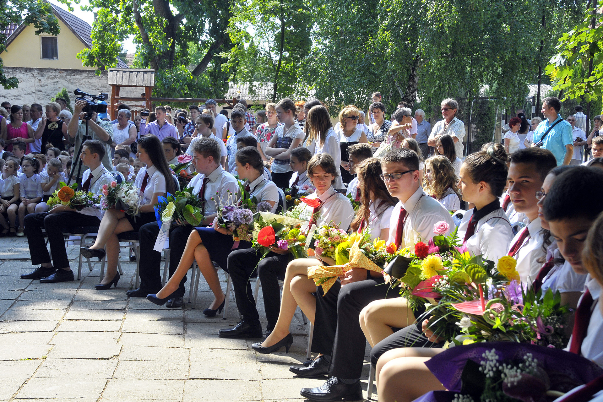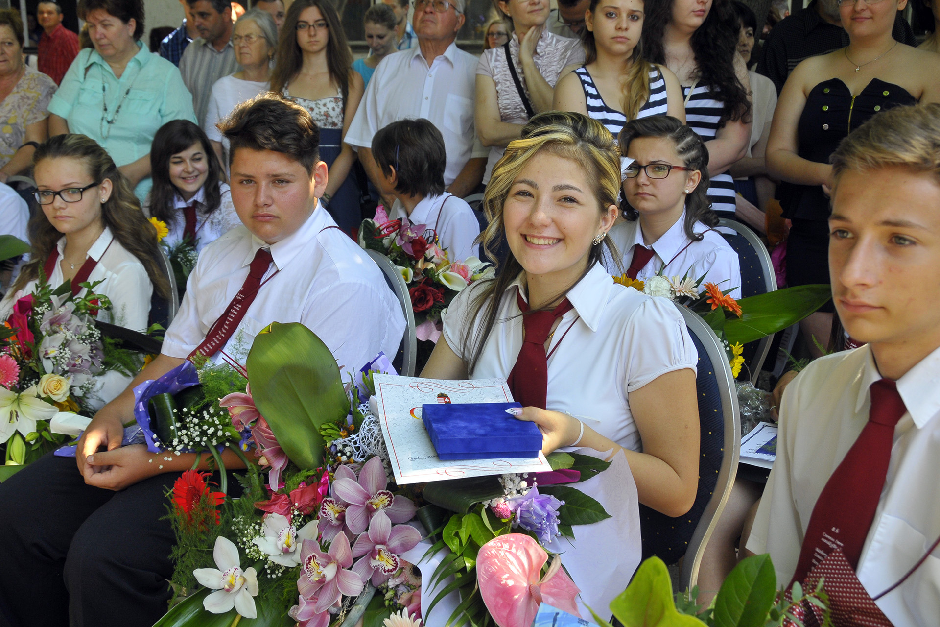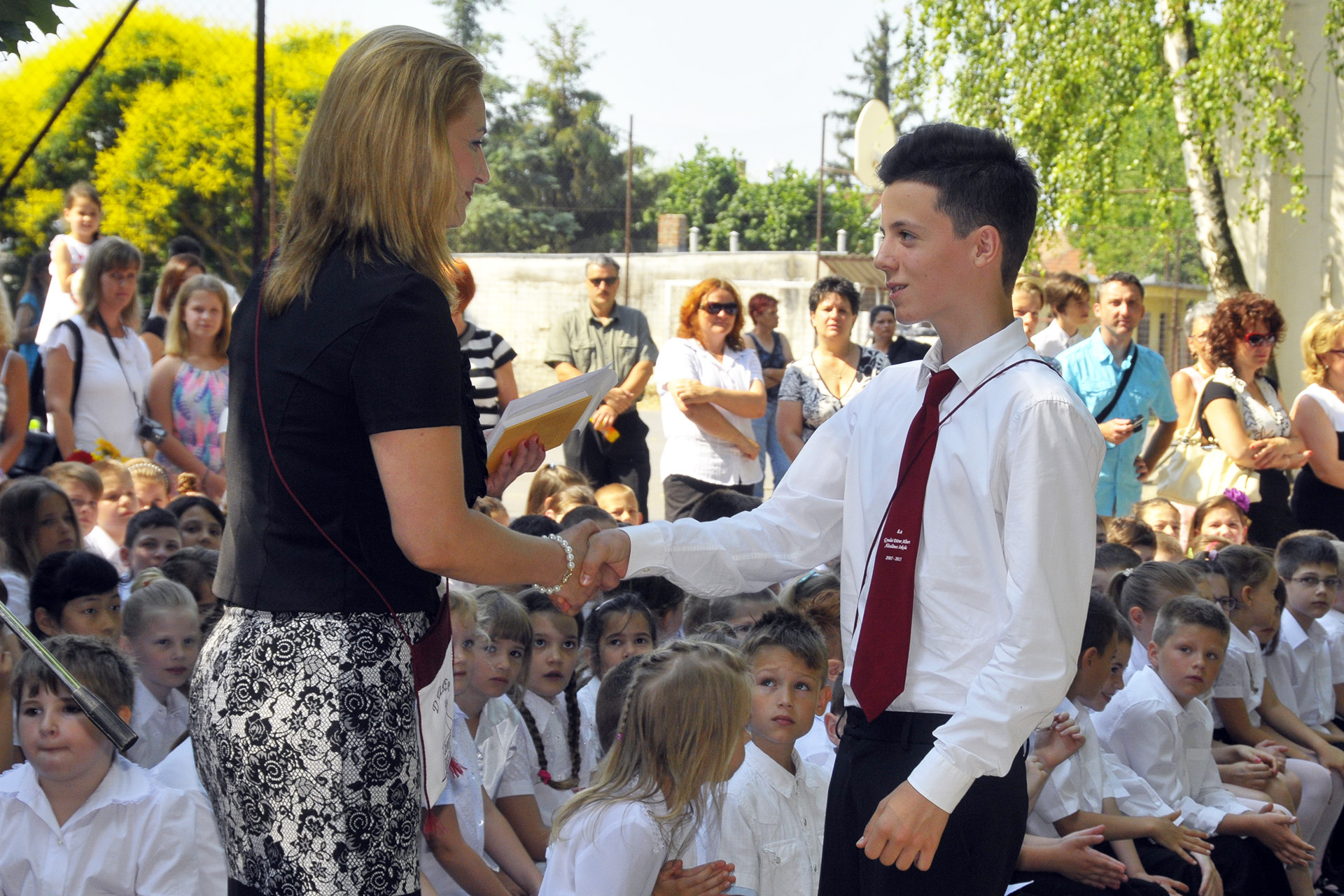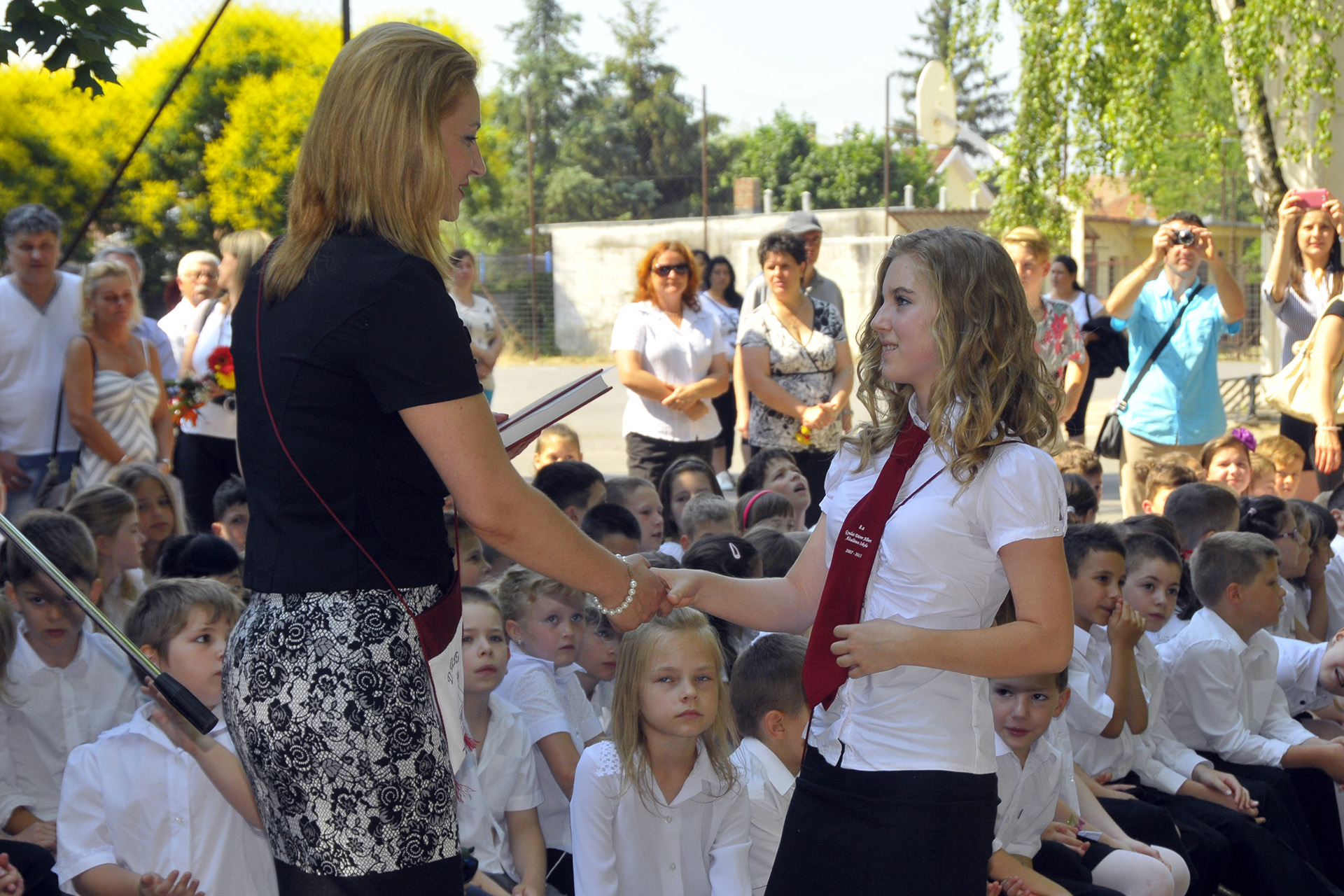 - Örömteli ez a mai nap. Mégis meghatódottak vagyunk. Ti is, én is. Nehéz belegondolni abba, hogy az a 8 év, amit az iskola falai között töltöttetek, hirtelen véget ér. Minden teremhez, tanárokhoz, diáktársakhoz egy-egy emlék fűződik. Az itt töltött évek összekötnek bennünket. Annyi minden történt a nyolc év alatt: jó felidézni a kezdeteket, amikor elsősként megilletődötten ültetek a tanévnyitón, ismerkedtetek az ABC betűivel, a számolás, írás rejtelmeivel. Majd a további évek során sok-sok új ismeretet kaptatok a felső tagozaton. Az eltöltött idő alatt sok minden változott. Mi nem változott? Az az aggodalom, gondoskodás, amit a jövőtök iránt érzünk. Ezeket az éveket nem lehet kitörölni, valamilyen nyomot hagy mindenkiben. Bennünk is. Nem fogunk, nem is akarunk elfelejteni benneteket. Kollégáimmal együtt örültünk minden sikereteknek, apró örömötöknek, átéreztük a kudarc okozta fájdalmat, bánatot. Ma véget értek az általános iskolás napok. Kedves lányok és fiúk! Pedagógusaitok felkészítettek benneteket a továbbtanulásra, mi több, az élethosszig történő tanulásra. Kit jobban, kit kevésbé jól sikerült. Kinek könnyebb, kinek nehezebb lesz a folytatás. Annak örülünk, hogy valamennyien továbbtanultok. Bízunk bennetek, hogy választott iskolátokban helyt álltok, és sok jót hallunk még felőletek. Ám tudnotok kell, hogy a felvétellel csak a lehetőséget kaptátok meg a középiskolától. A lehetőséget ahhoz, hogy újabb évek munkája, a tanulás révén közel jussatok életcélotokhoz, későbbi munkátokhoz. Az első naptól kezdve tanuljatok szorgalmasan, szerezzetek még több tudást még több ismeretet és dicsőséget magatoknak. Ezt várják tőletek szüleitek, ezt kérjük mi is. Ígérjük, gondolunk rátok – szólt a ballagókhoz az intézményvezető.