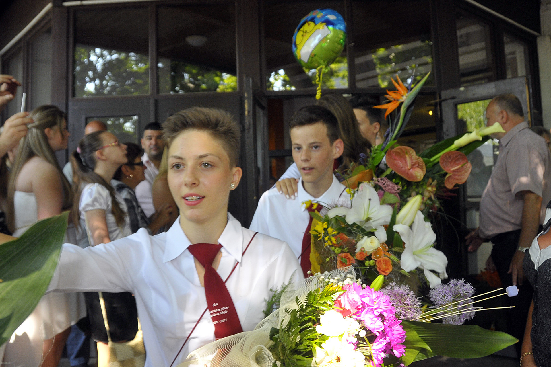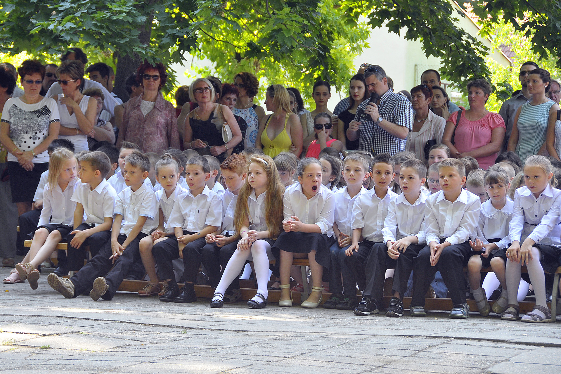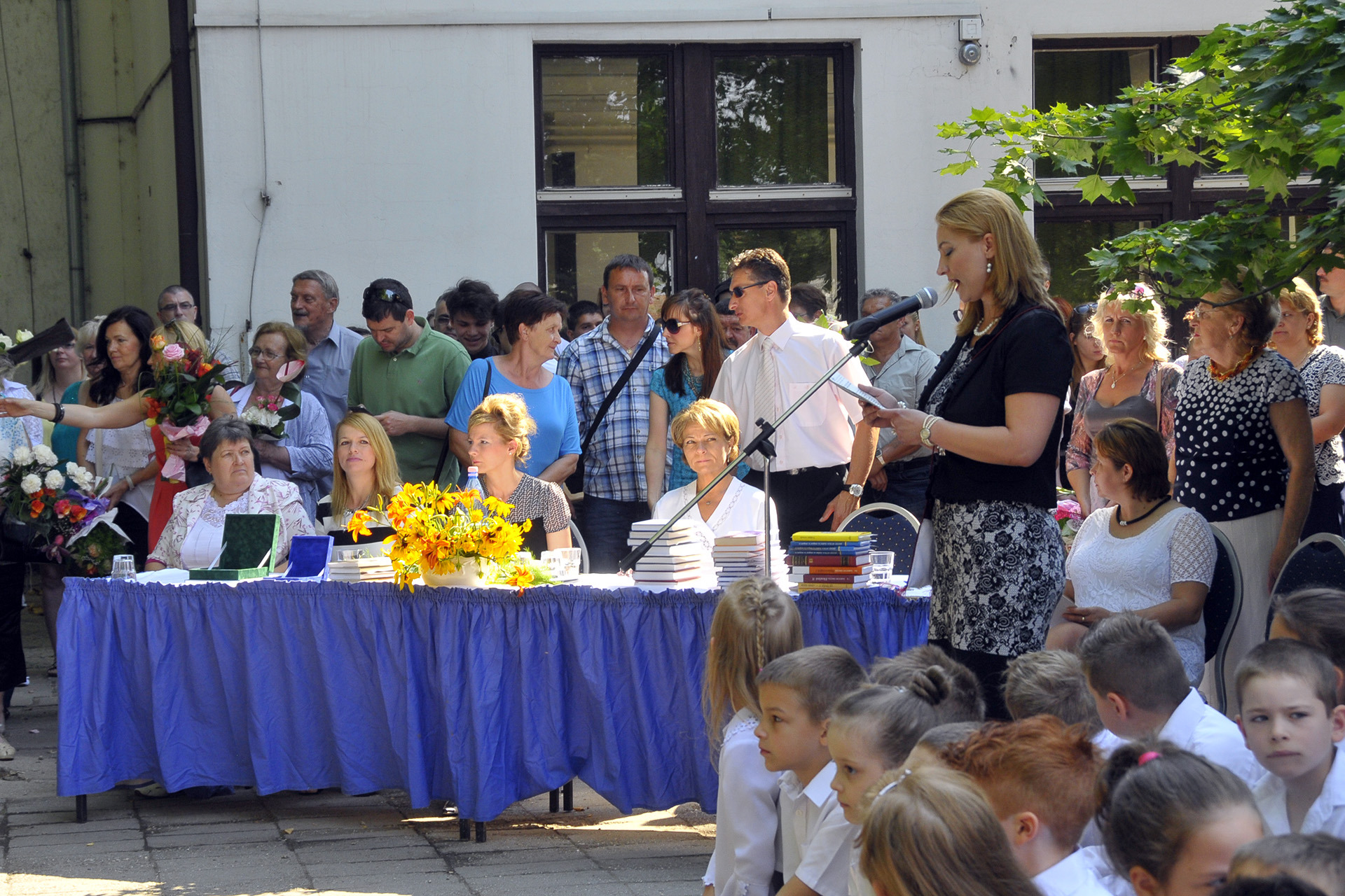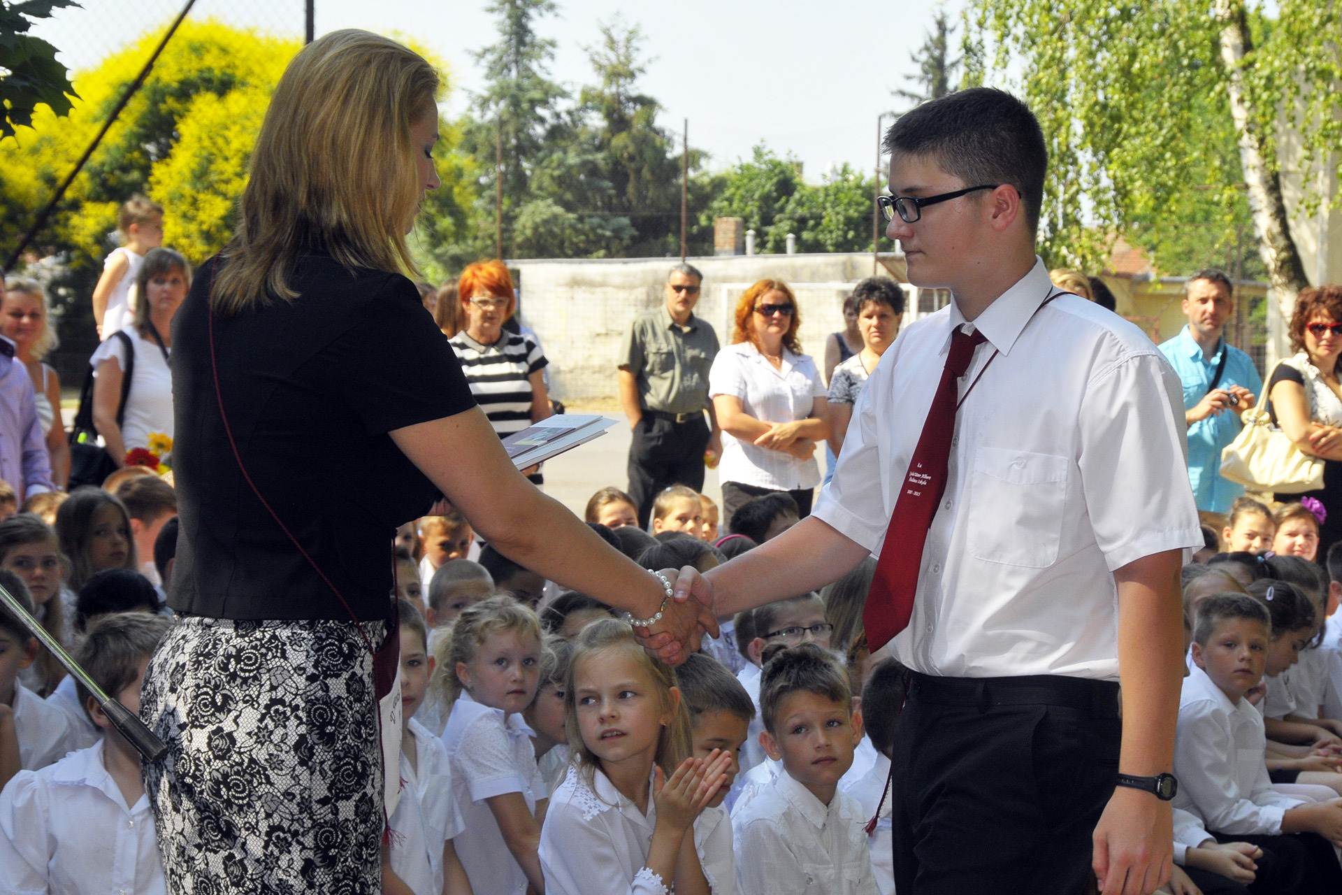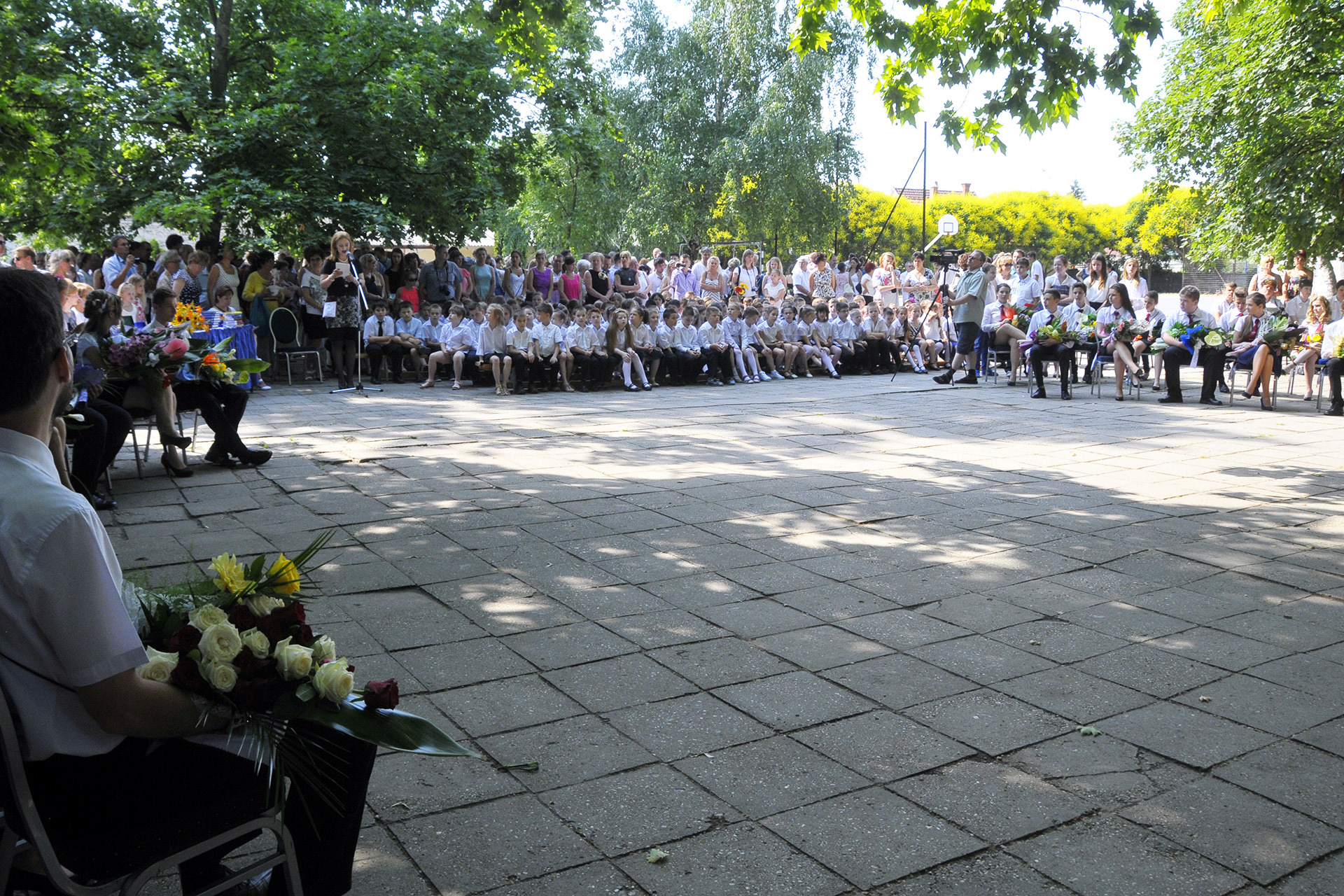 - Örömteli ez a mai nap. Mégis meghatódottak vagyunk. Ti is, én is. Nehéz belegondolni abba, hogy az a 8 év, amit az iskola falai között töltöttetek, hirtelen véget ér. Minden teremhez, tanárokhoz, diáktársakhoz egy-egy emlék fűződik. Az itt töltött évek összekötnek bennünket. Annyi minden történt a nyolc év alatt: jó felidézni a kezdeteket, amikor elsősként megilletődötten ültetek a tanévnyitón, ismerkedtetek az ABC betűivel, a számolás, írás rejtelmeivel. Majd a további évek során sok-sok új ismeretet kaptatok a felső tagozaton. Az eltöltött idő alatt sok minden változott. Mi nem változott? Az az aggodalom, gondoskodás, amit a jövőtök iránt érzünk. Ezeket az éveket nem lehet kitörölni, valamilyen nyomot hagy mindenkiben. Bennünk is. Nem fogunk, nem is akarunk elfelejteni benneteket. Kollégáimmal együtt örültünk minden sikereteknek, apró örömötöknek, átéreztük a kudarc okozta fájdalmat, bánatot. Ma véget értek az általános iskolás napok. Kedves lányok és fiúk! Pedagógusaitok felkészítettek benneteket a továbbtanulásra, mi több, az élethosszig történő tanulásra. Kit jobban, kit kevésbé jól sikerült. Kinek könnyebb, kinek nehezebb lesz a folytatás. Annak örülünk, hogy valamennyien továbbtanultok. Bízunk bennetek, hogy választott iskolátokban helyt álltok, és sok jót hallunk még felőletek. Ám tudnotok kell, hogy a felvétellel csak a lehetőséget kaptátok meg a középiskolától. A lehetőséget ahhoz, hogy újabb évek munkája, a tanulás révén közel jussatok életcélotokhoz, későbbi munkátokhoz. Az első naptól kezdve tanuljatok szorgalmasan, szerezzetek még több tudást még több ismeretet és dicsőséget magatoknak. Ezt várják tőletek szüleitek, ezt kérjük mi is. Ígérjük, gondolunk rátok – szólt a ballagókhoz az intézményvezető.