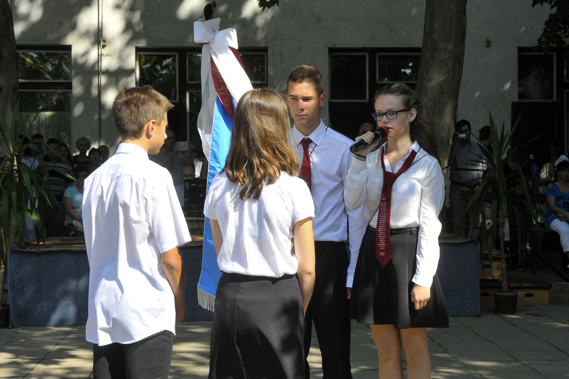 A virágátadás és a Himnusz után a hagyományokhoz híven a ballagó diákok átadták az iskola zászlaját a hetedikeseknek, majd a nyolcadikosok műsorukban prózával és énekkel köszöntek el az iskolától.