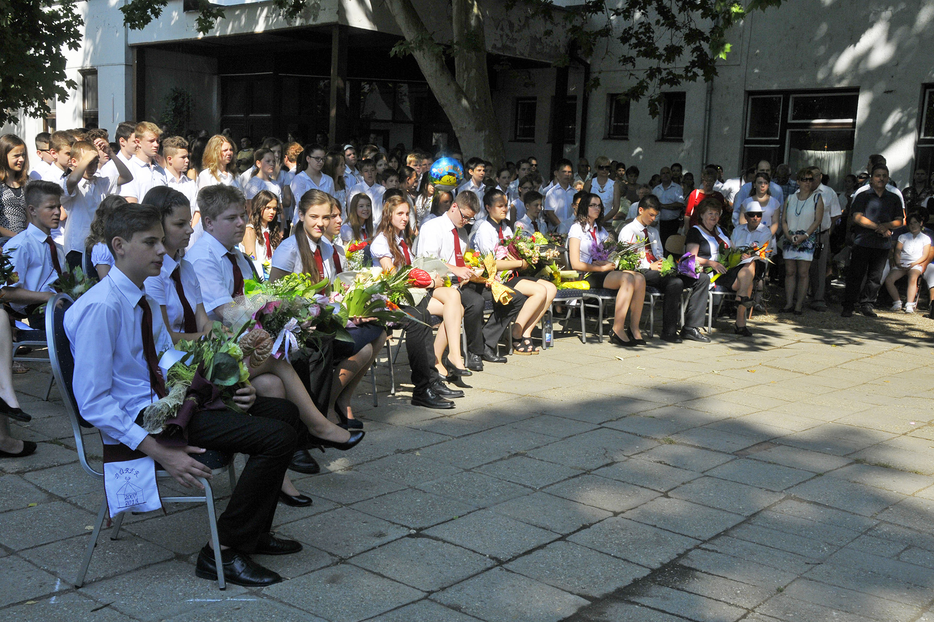 Két osztály összesen 48 végzőse búcsúzott az elmúlt nyolc évtől a gyulai Dürer Albert Általános Iskolában. A ballagó diákok Petri Hajnalka intézményvezető, valamint Bánkutiné Tóth Gizella és Csontos Imre osztályfőnökök vezetésével még utoljára együtt bejárták az épületet, majd a búcsúzók a nyárias délelőttön az intézmény kellemesen árnyékos udvarán foglaltak helyet.