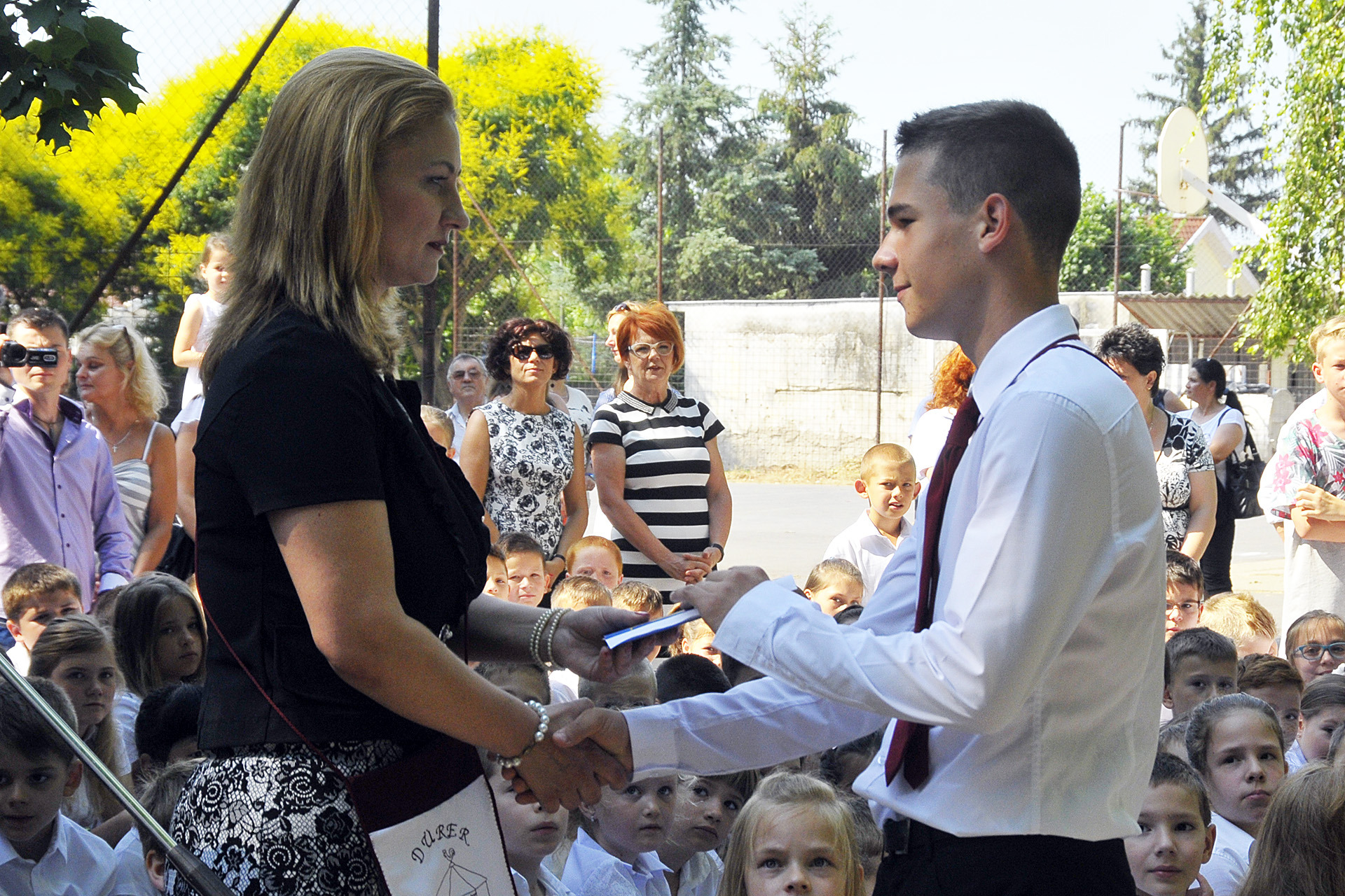 Végül a díjak átadása következett, könyvjutalomban részesültek az iskola nevét öregbítő, valamint a kitűnő diákok és a legaktívabb szülők. Idén a Jó tanuló, jó sportoló díjat Havas Anna Gréta, a Dürer közösségéért díjat Fejes Alexandra Flóra vehette át Teleki-Szávai Krisztina tankerületi igazgatótól.