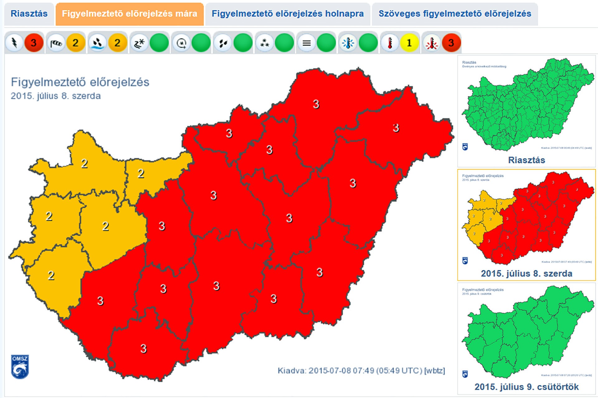 Az Országos Meteorológiai Szolgálat előrejelzései alapján heves zivatarral érkezik a hőséget követő enyhülés. Az előrejelzések szerint helyenként erős, akár 90 kilométer/órát meghaladó széllökések, illetve intenzív, nagyméretű jégeső, továbbá felhőszakadás is várható.