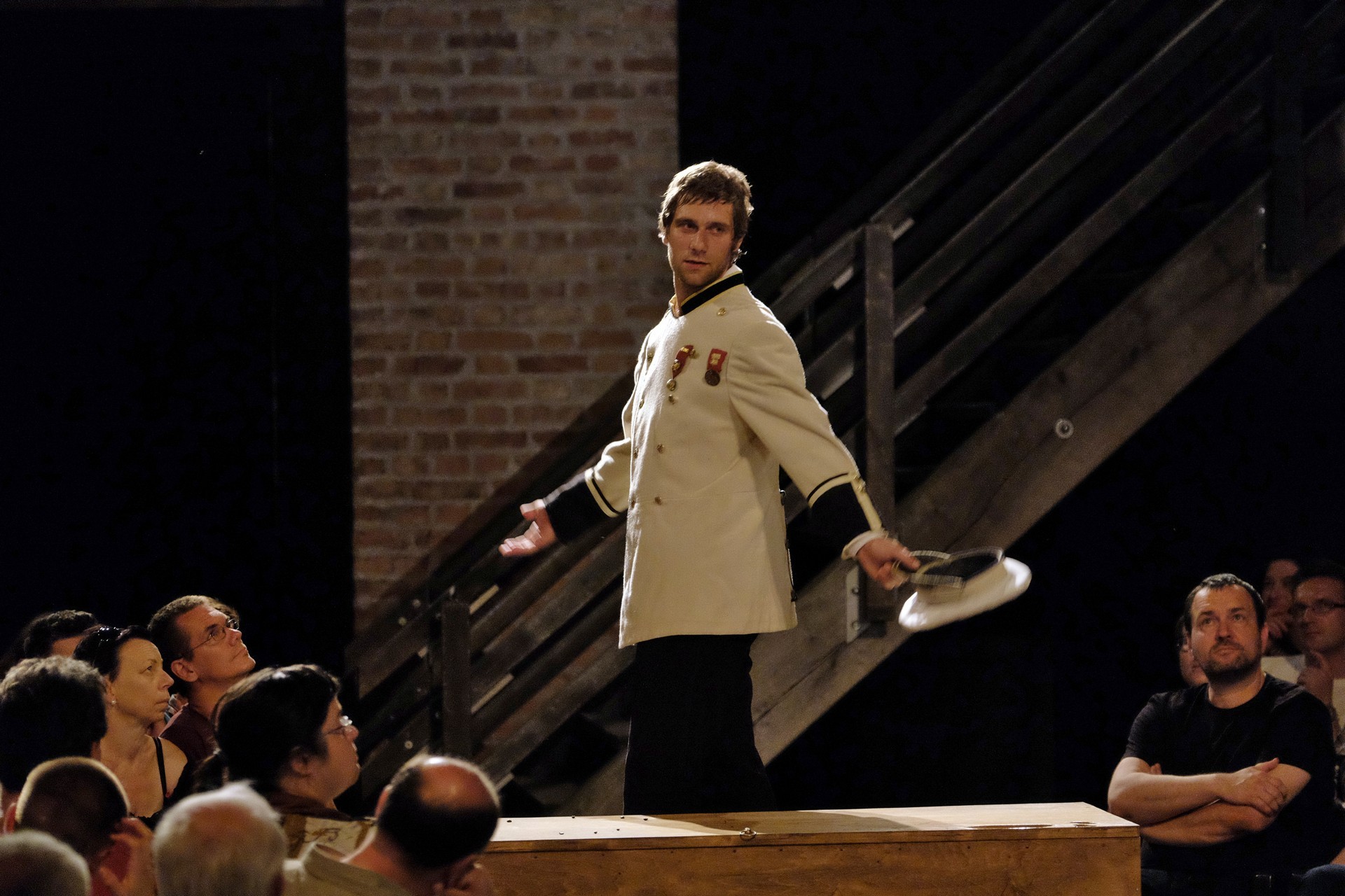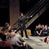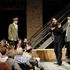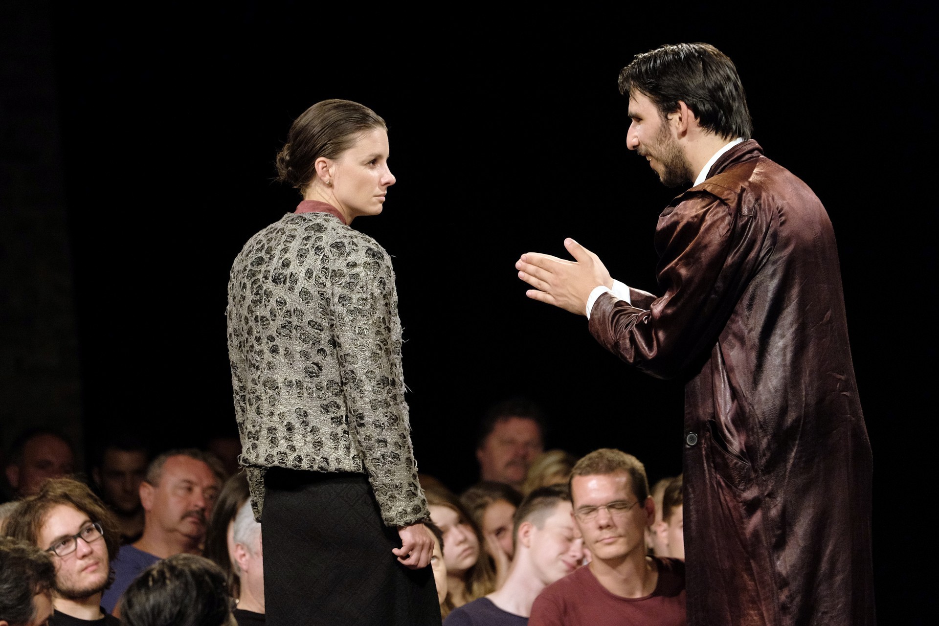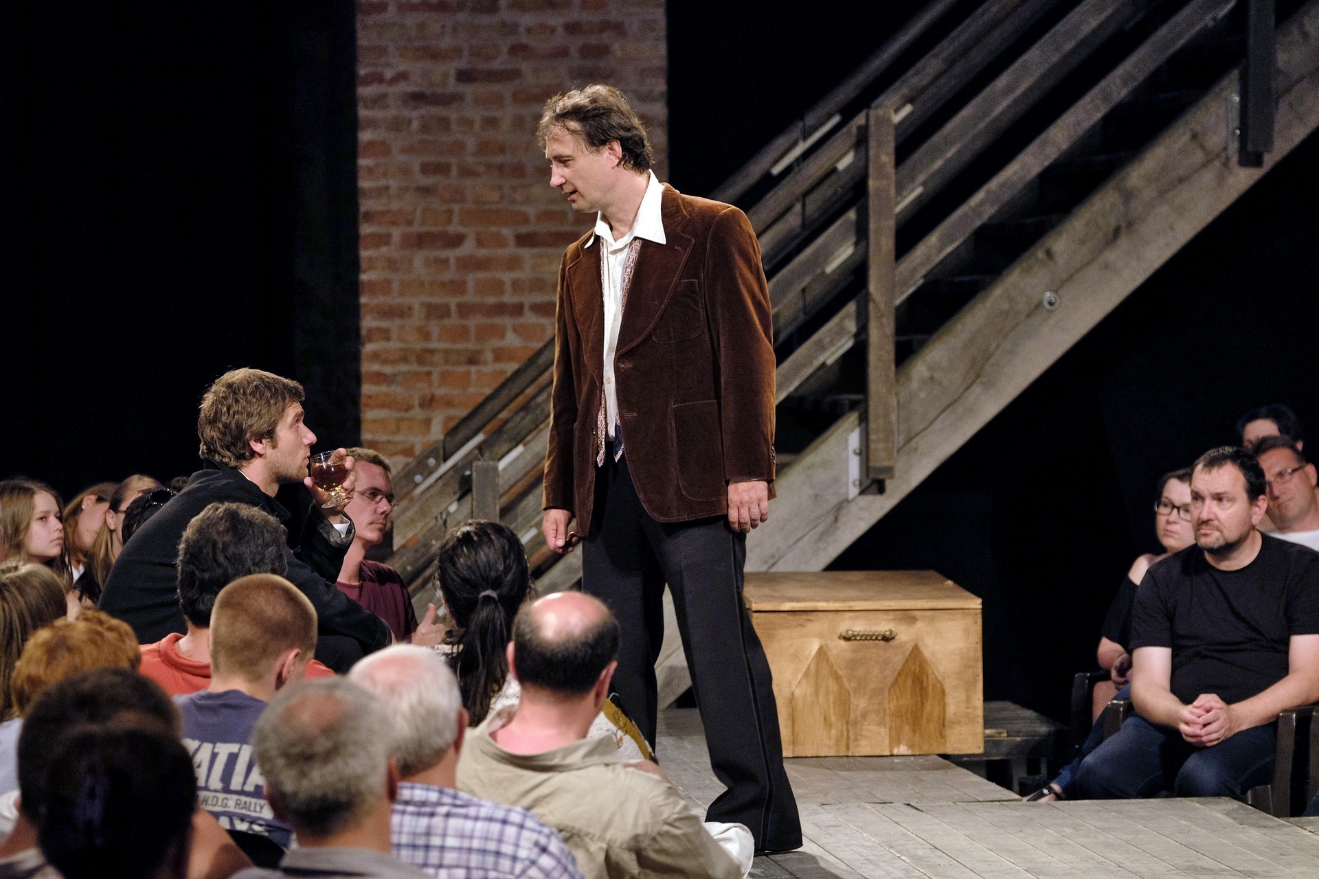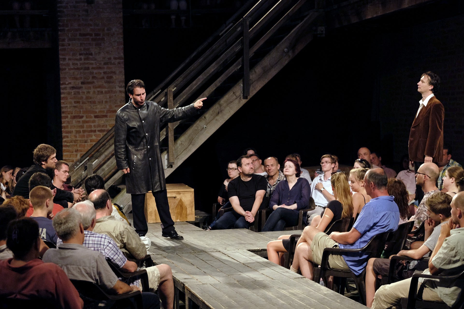 A főhössel szemben táplált félszünket az fokozta leginkább, hogy a leendő király zavart dühkitörései, hirtelen feltörő hangos üvöltései szó szerint az orrunk előtt zajlottak. A darabot ugyanis két keskeny útból álló keresztszínpadon játszották, négy sarkában a közönséggel. Karnyújtásnyira volt tőlünk a gaz, amikor Buckhingham hercege felsegítette őt a trónra, és ott ültünk mellette sátrában is, amikor utolsó csatája előtti rémálmában felkeresték őt a sírba taszított lelkek, hogy halálát kívánják.