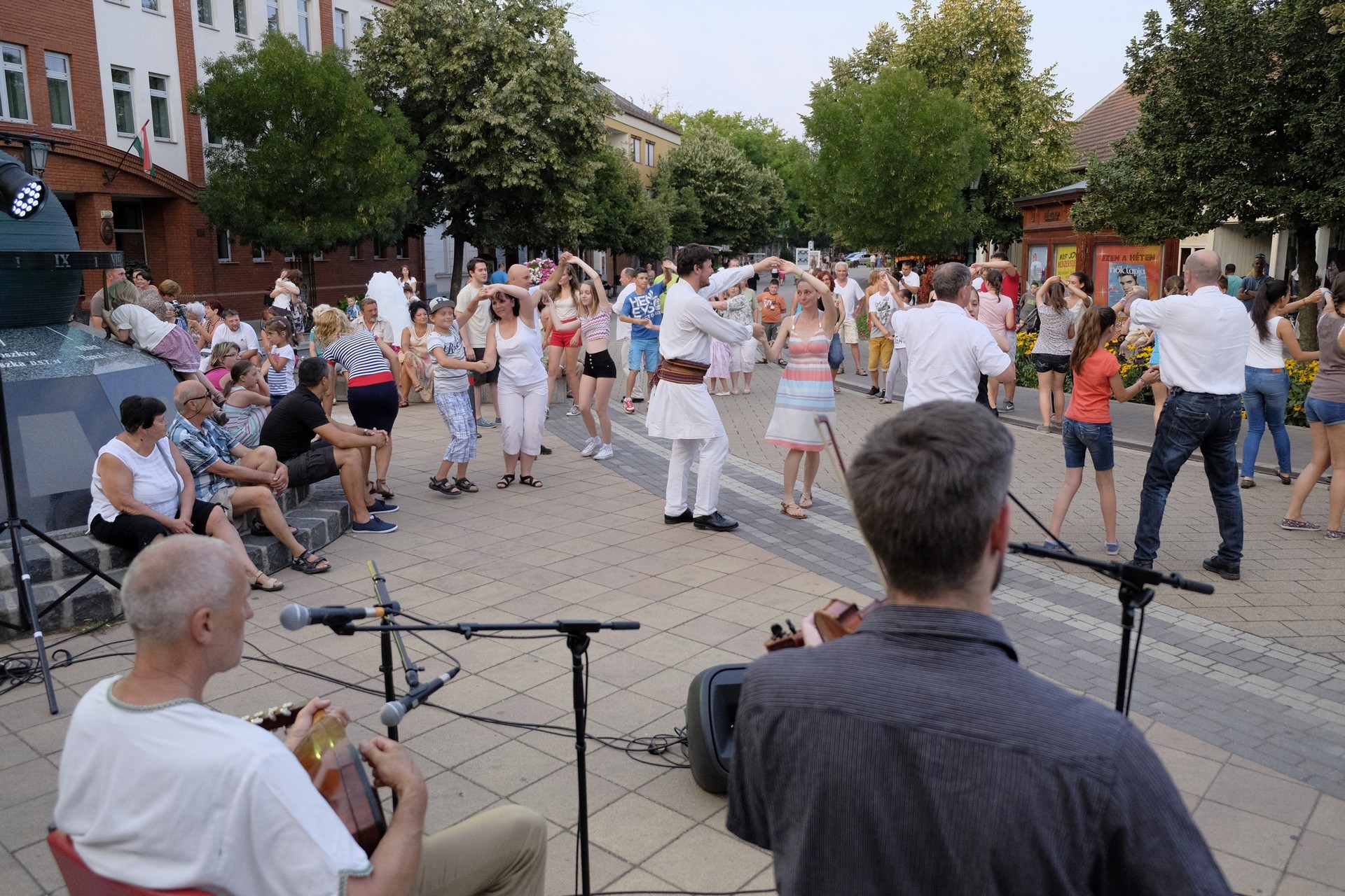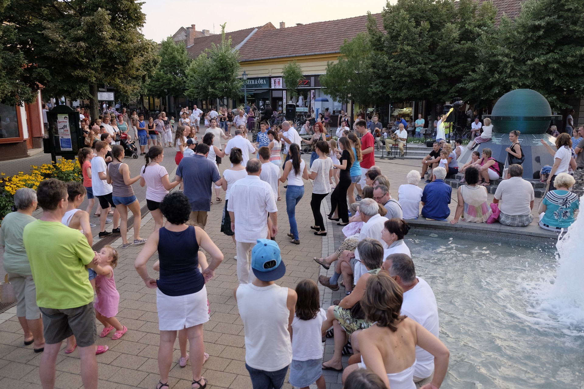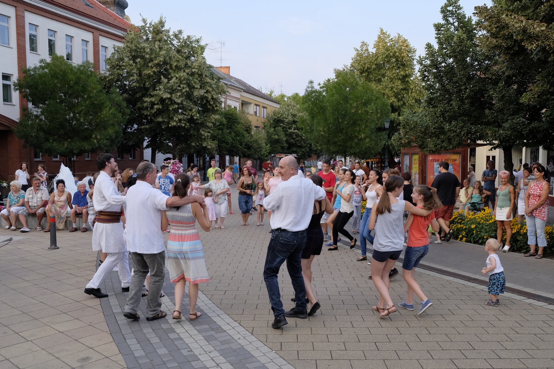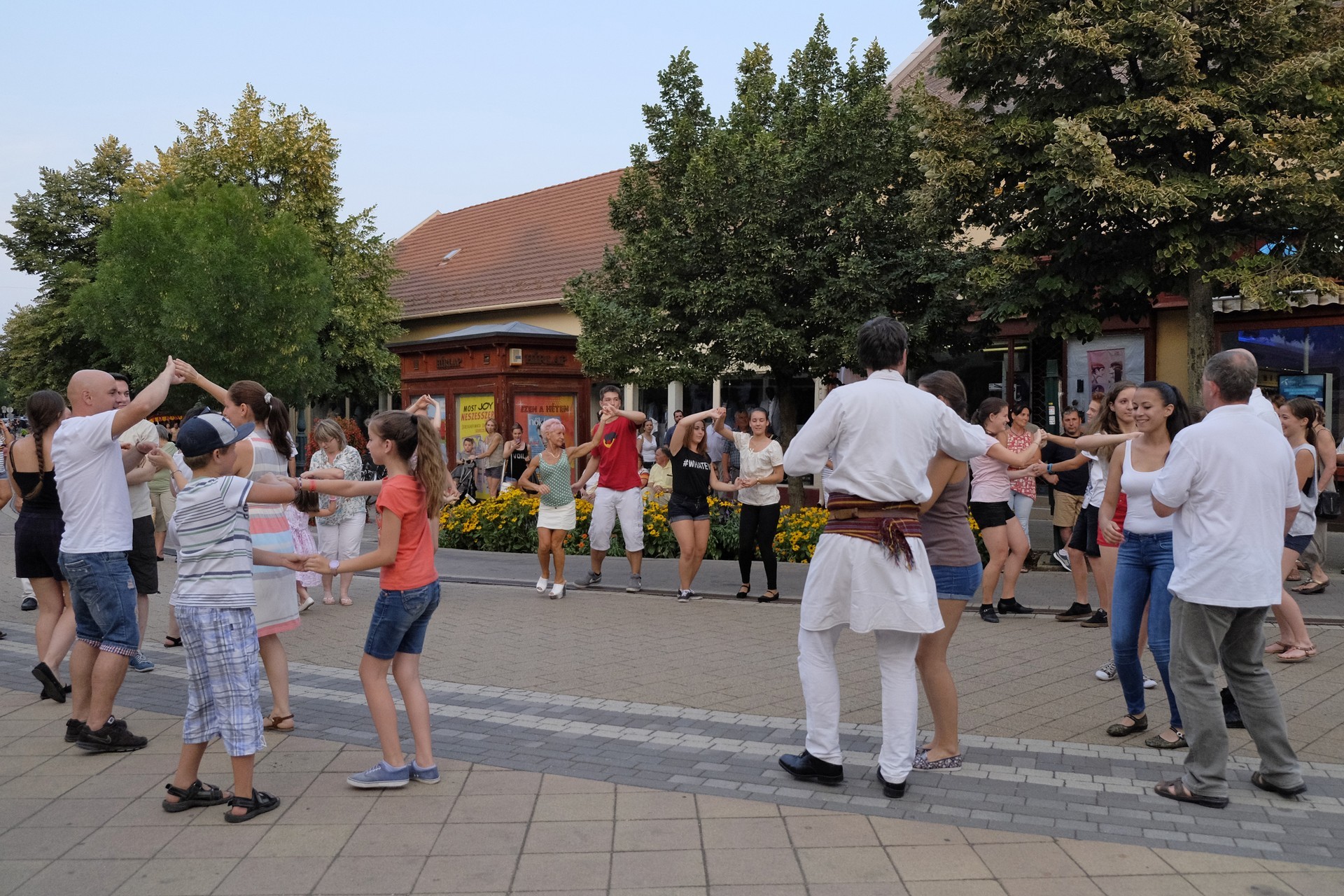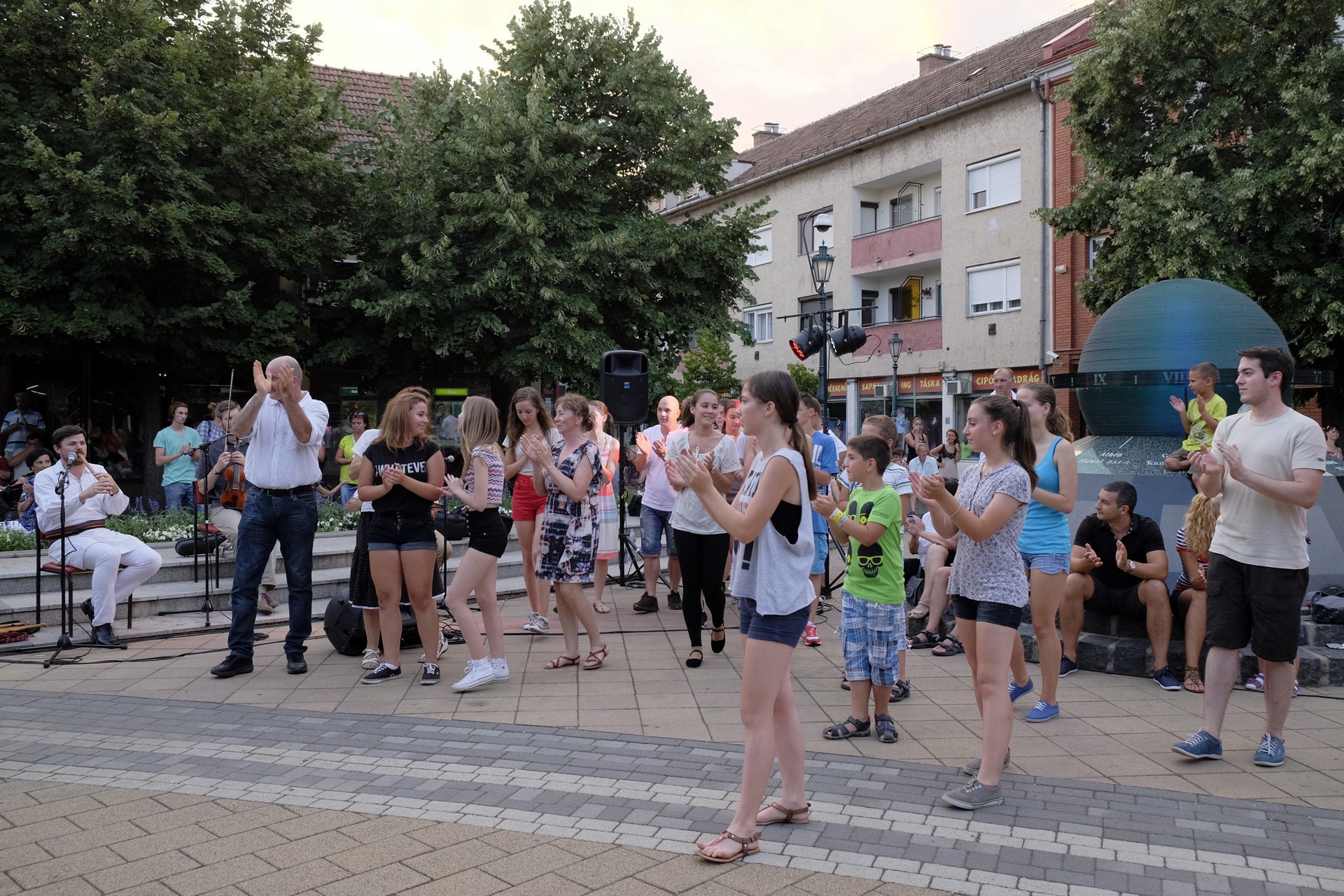 Aznap rekkenő hőség köszöntött ránk, s a lemenő Nap még késő délután is izzasztó erejét fitogtatta előttünk. A fülledt meleg ellenére szépszámú tömeg perdült táncra a téren. A Világórát is körbetáncoló sokaság keménymagját a gyulai Körös Néptáncegyüttes táncosai adták, akik néhány nézelődőt is táncra csábítottak. A csángó magyar táncház Patyi Zoltán művészeti vezető irányításával zajlott, míg a talpalávalóról a később fellépő Mentés Másként Trió gondoskodott.