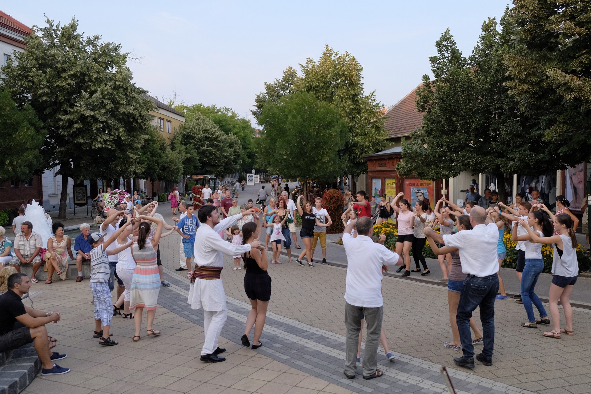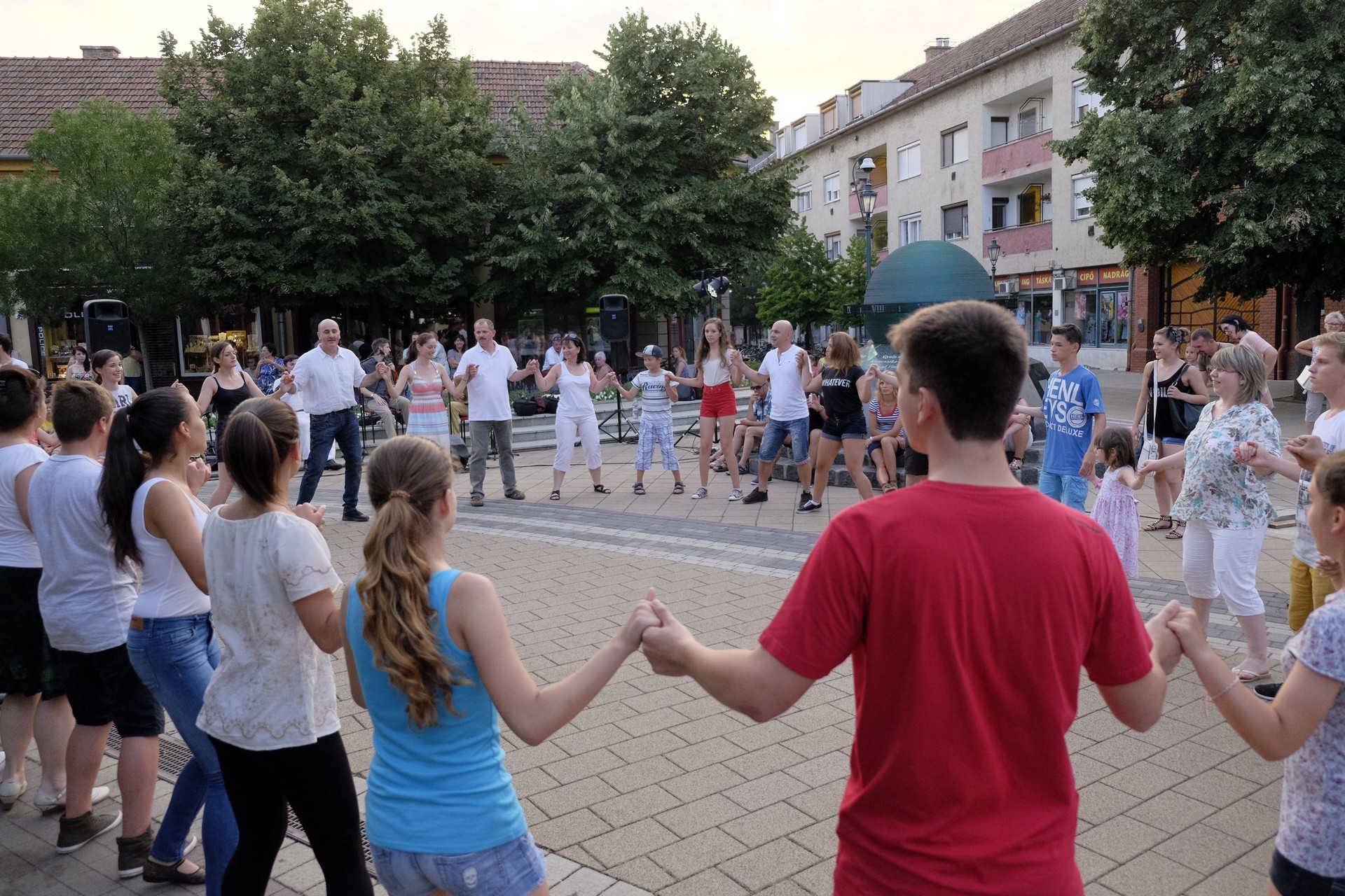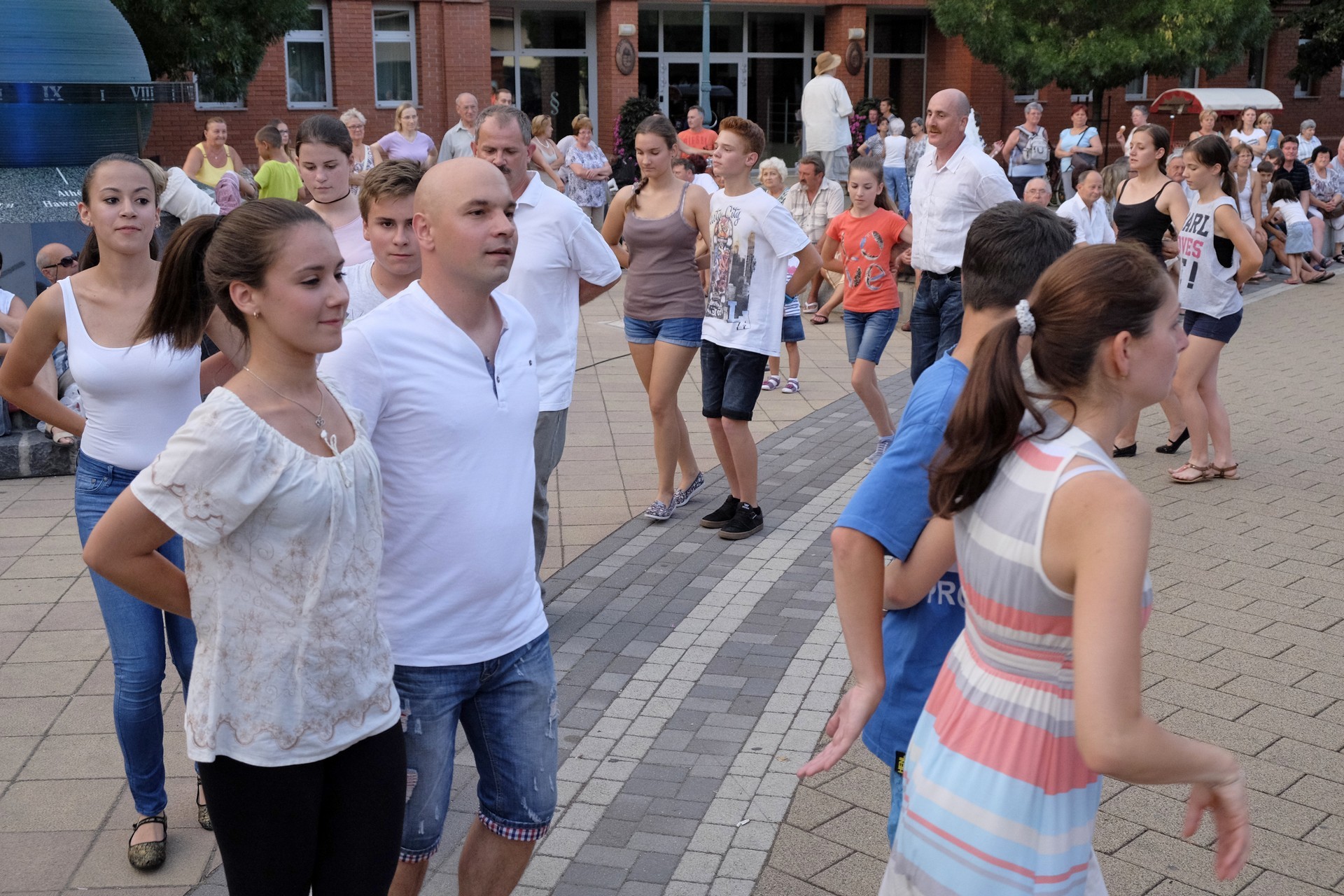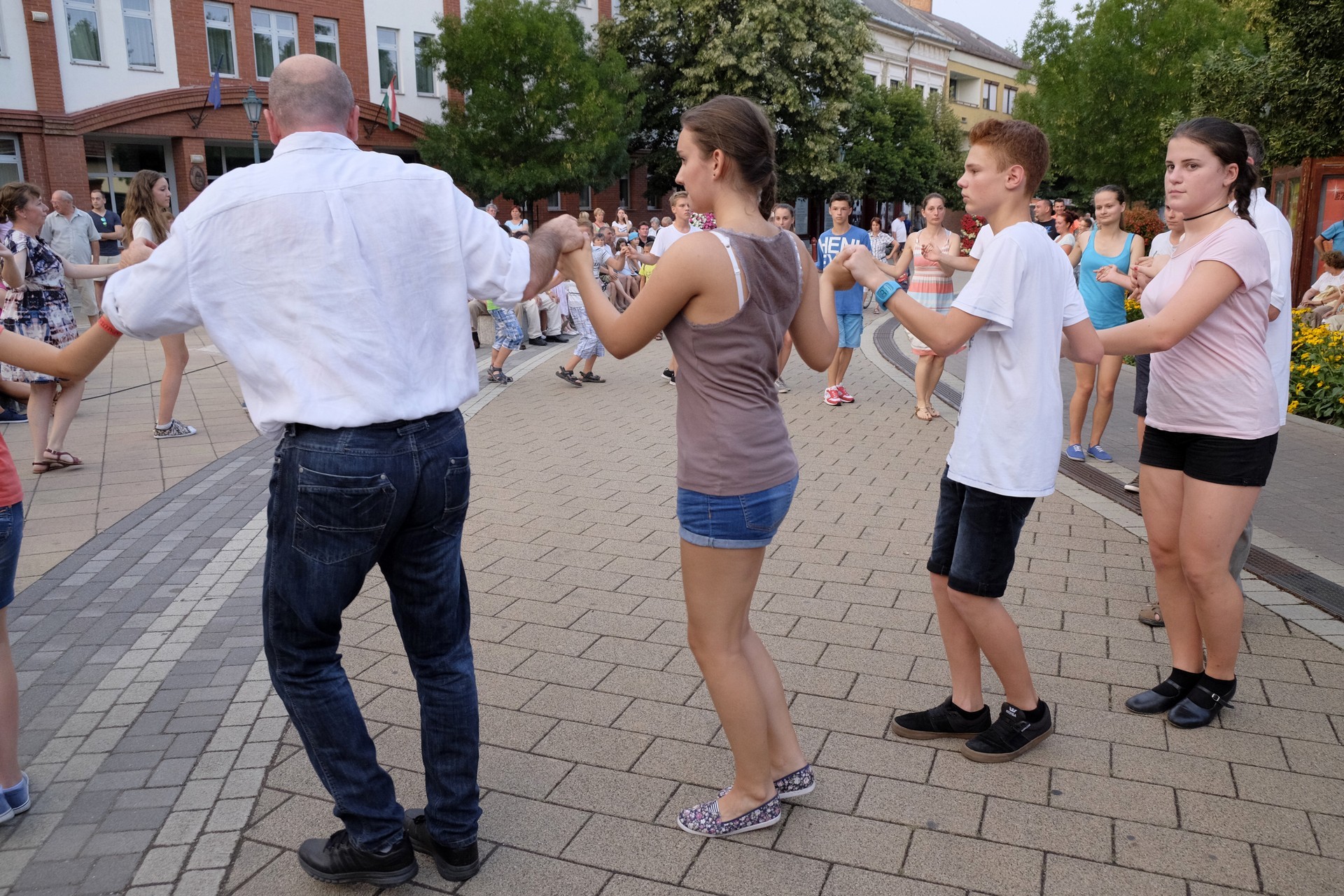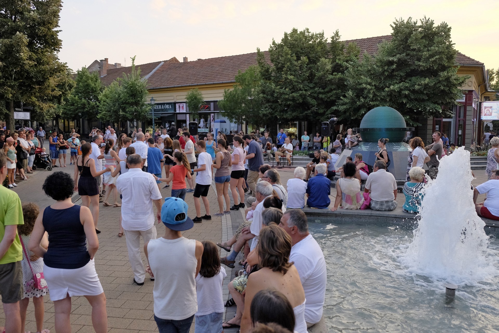 Aznap rekkenő hőség köszöntött ránk, s a lemenő Nap még késő délután is izzasztó erejét fitogtatta előttünk. A fülledt meleg ellenére szépszámú tömeg perdült táncra a téren. A Világórát is körbetáncoló sokaság keménymagját a gyulai Körös Néptáncegyüttes táncosai adták, akik néhány nézelődőt is táncra csábítottak. A csángó magyar táncház Patyi Zoltán művészeti vezető irányításával zajlott, míg a talpalávalóról a később fellépő Mentés Másként Trió gondoskodott.