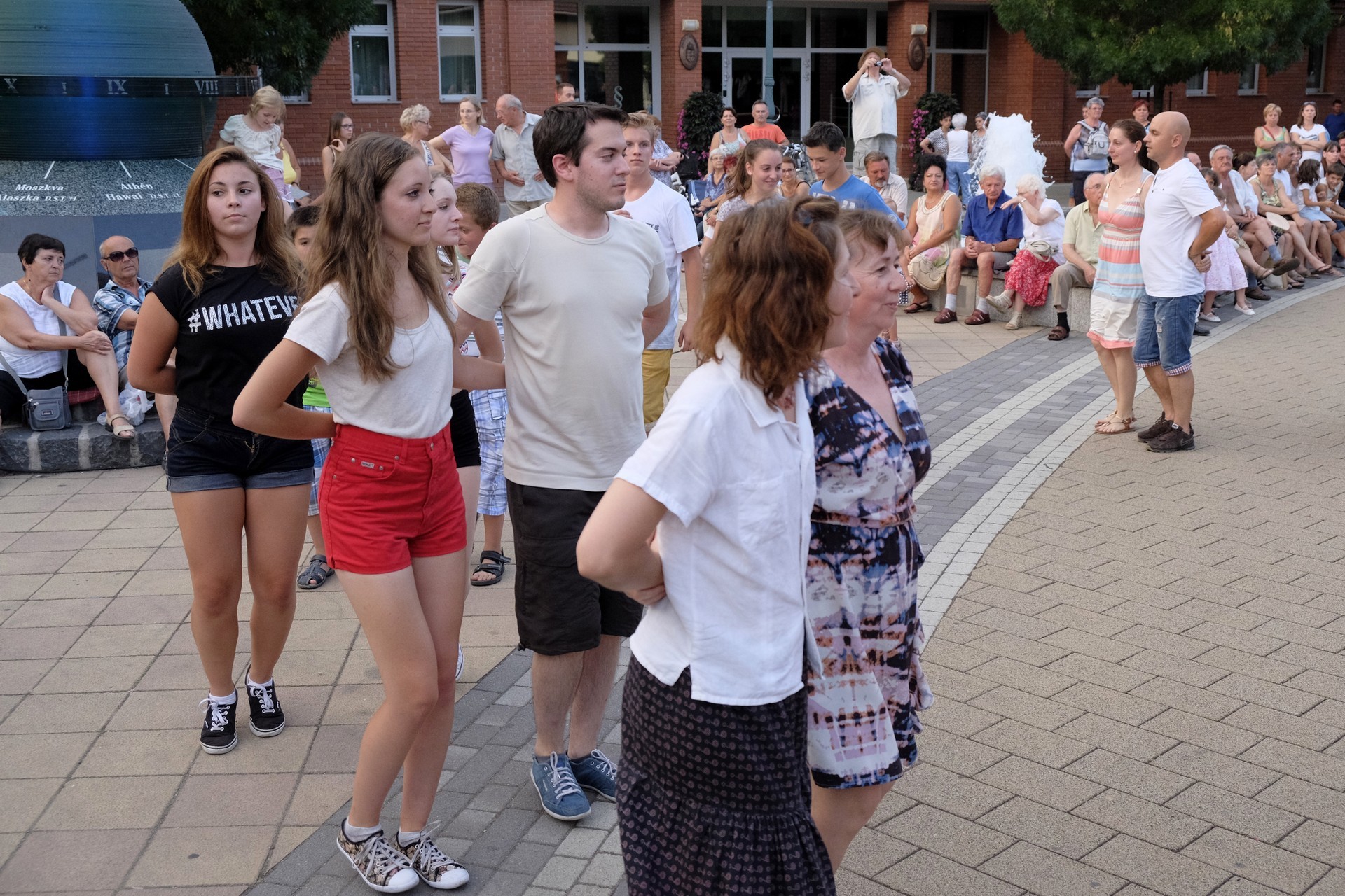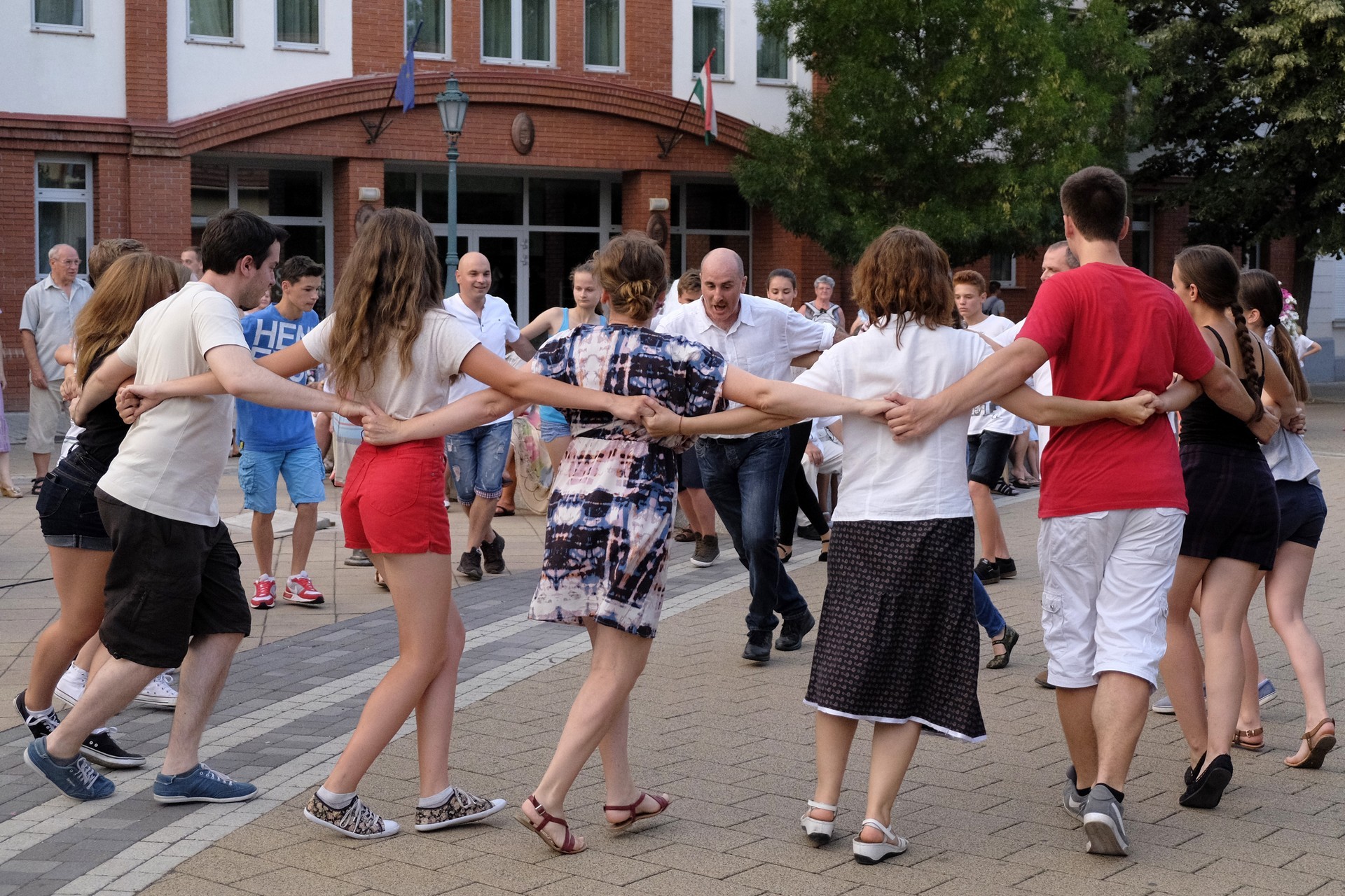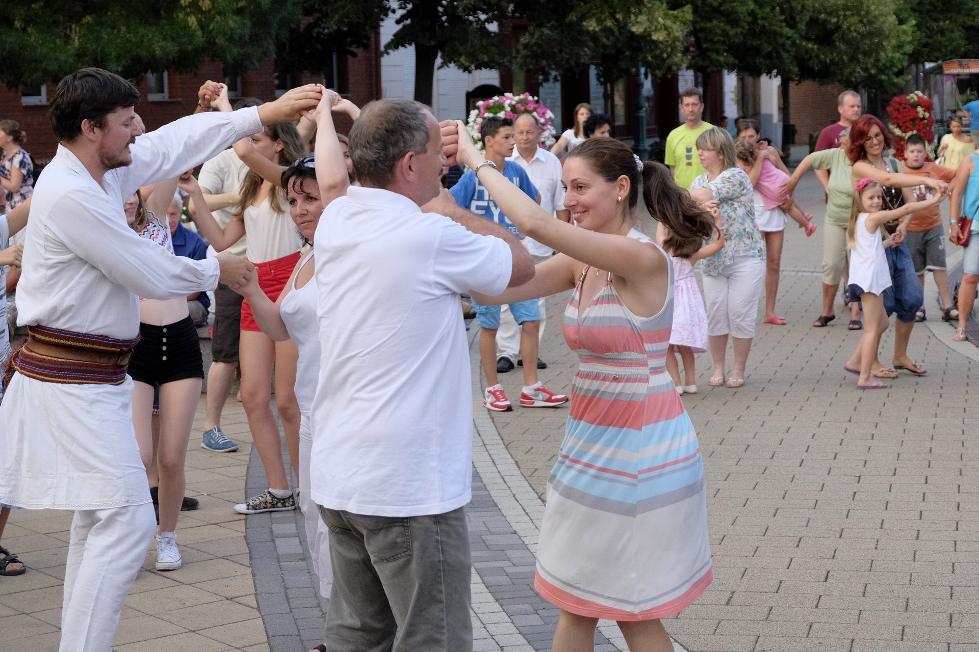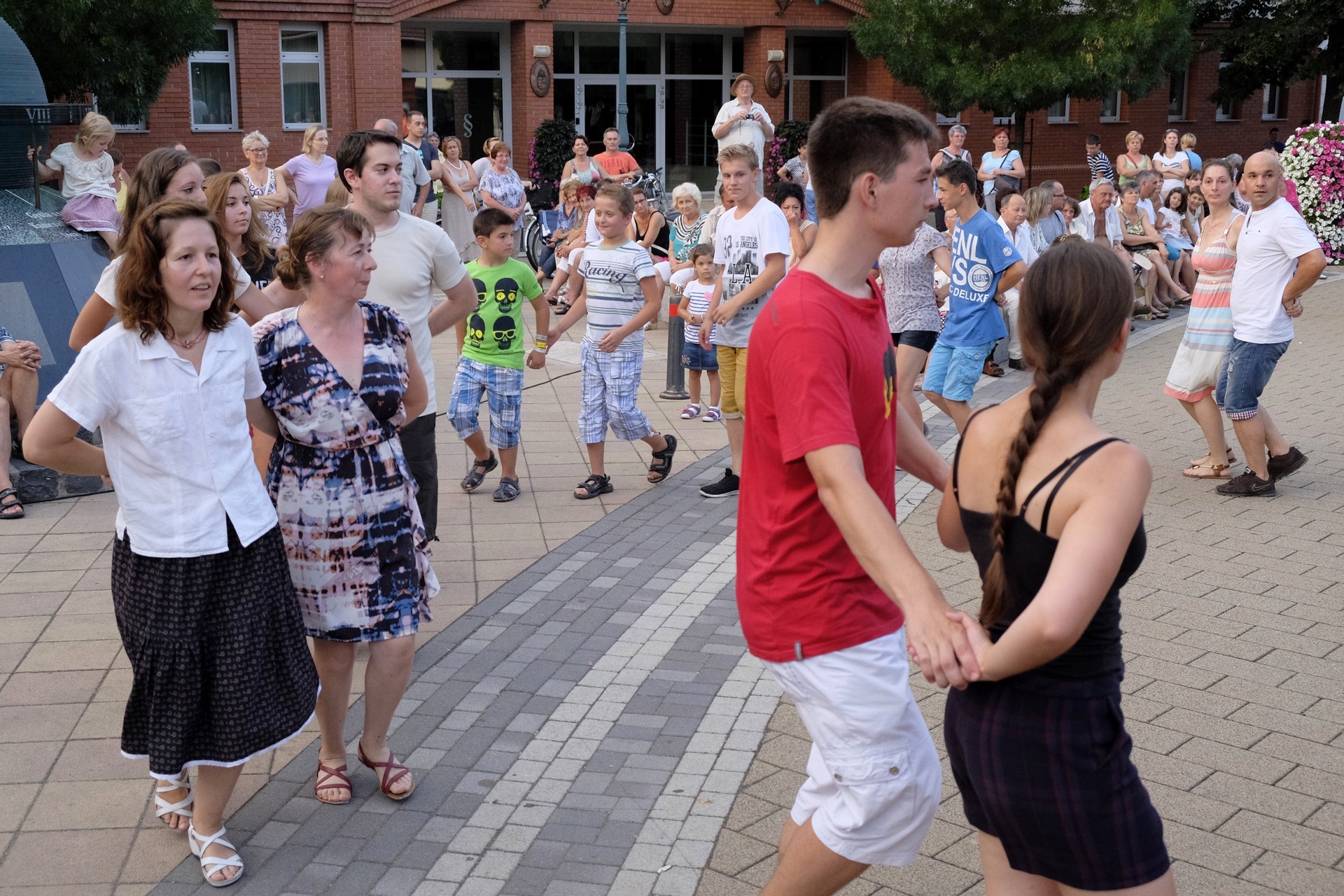 Aznap rekkenő hőség köszöntött ránk, s a lemenő Nap még késő délután is izzasztó erejét fitogtatta előttünk. A fülledt meleg ellenére szépszámú tömeg perdült táncra a téren. A Világórát is körbetáncoló sokaság keménymagját a gyulai Körös Néptáncegyüttes táncosai adták, akik néhány nézelődőt is táncra csábítottak. A csángó magyar táncház Patyi Zoltán művészeti vezető irányításával zajlott, míg a talpalávalóról a később fellépő Mentés Másként Trió gondoskodott.