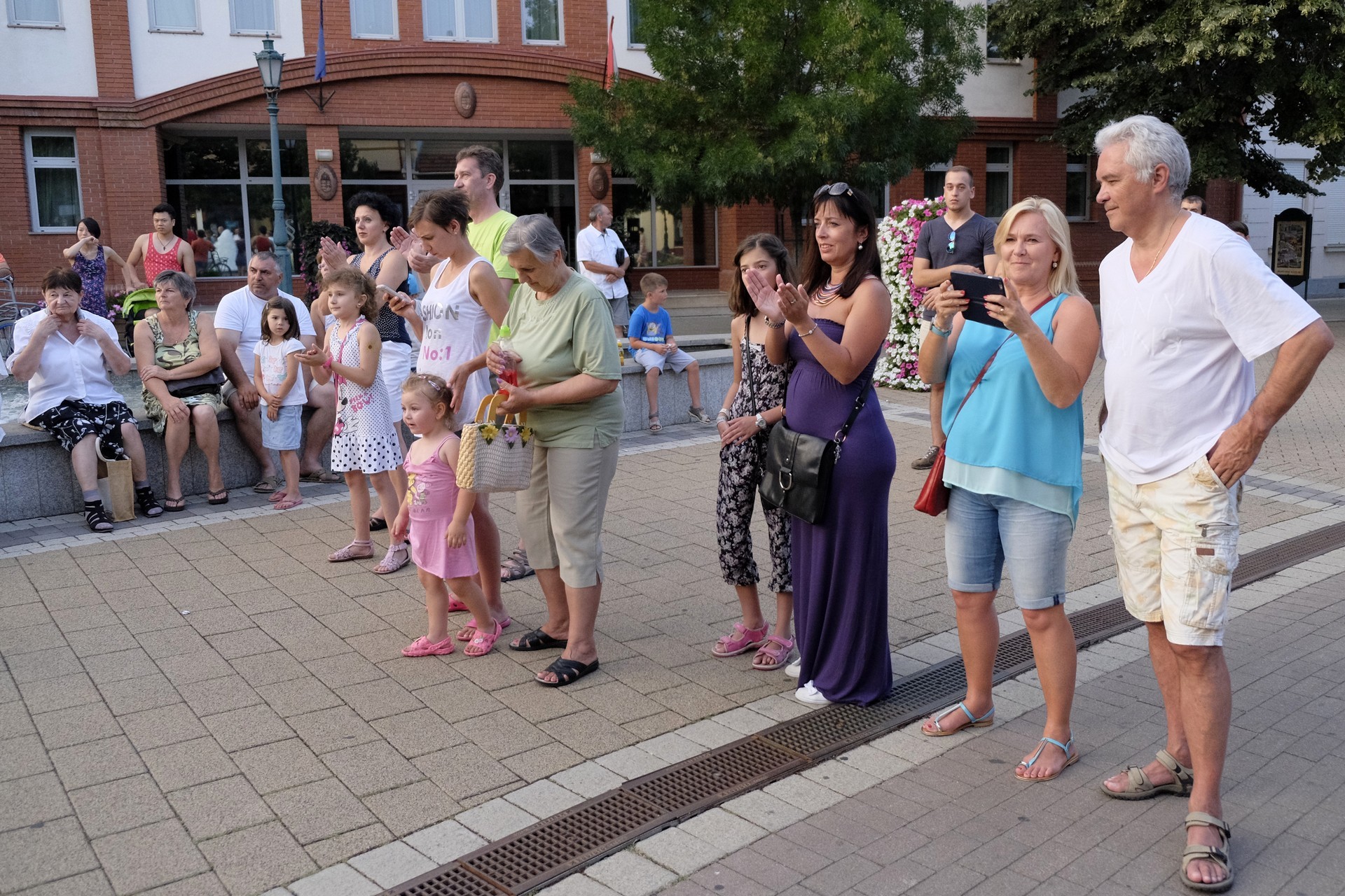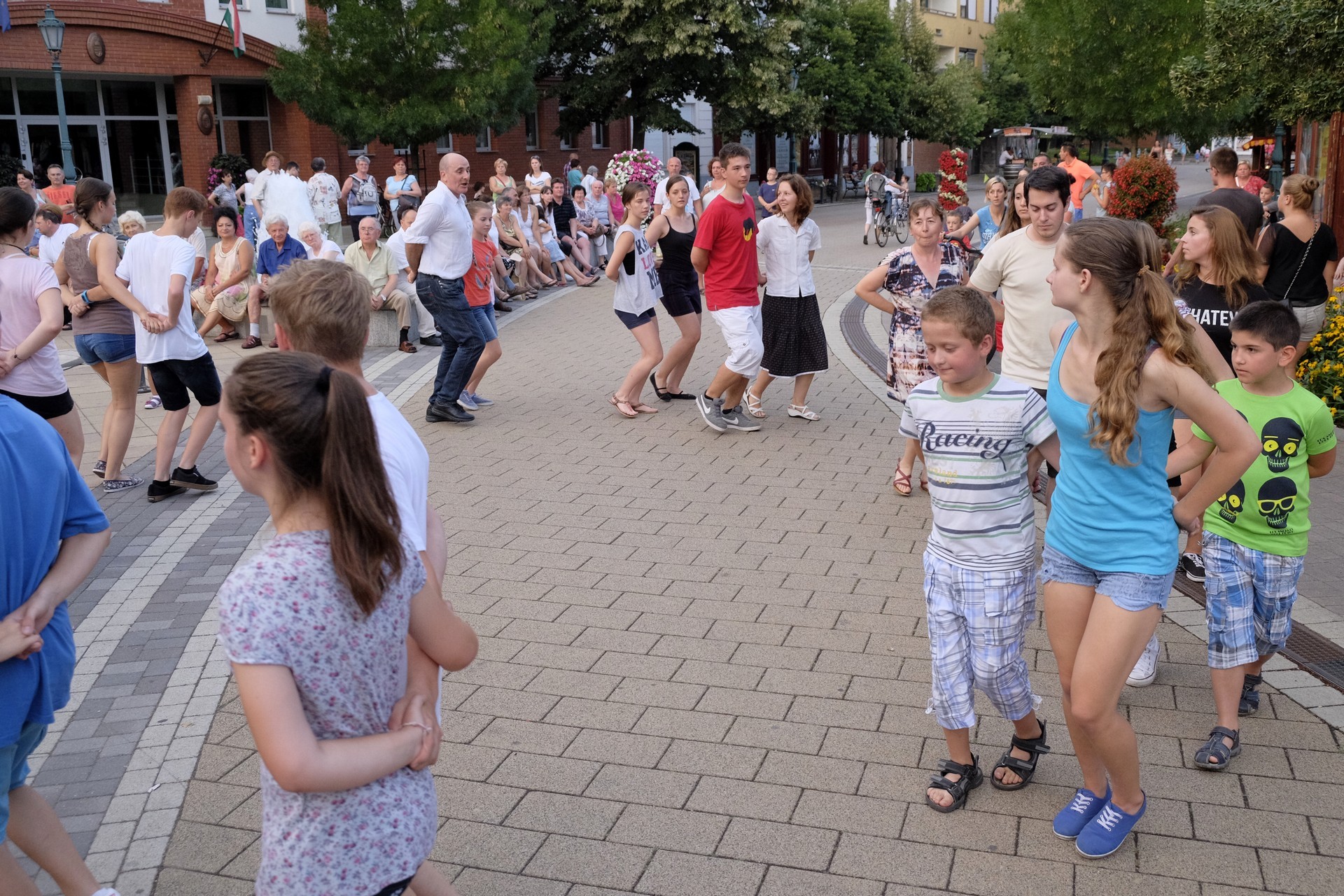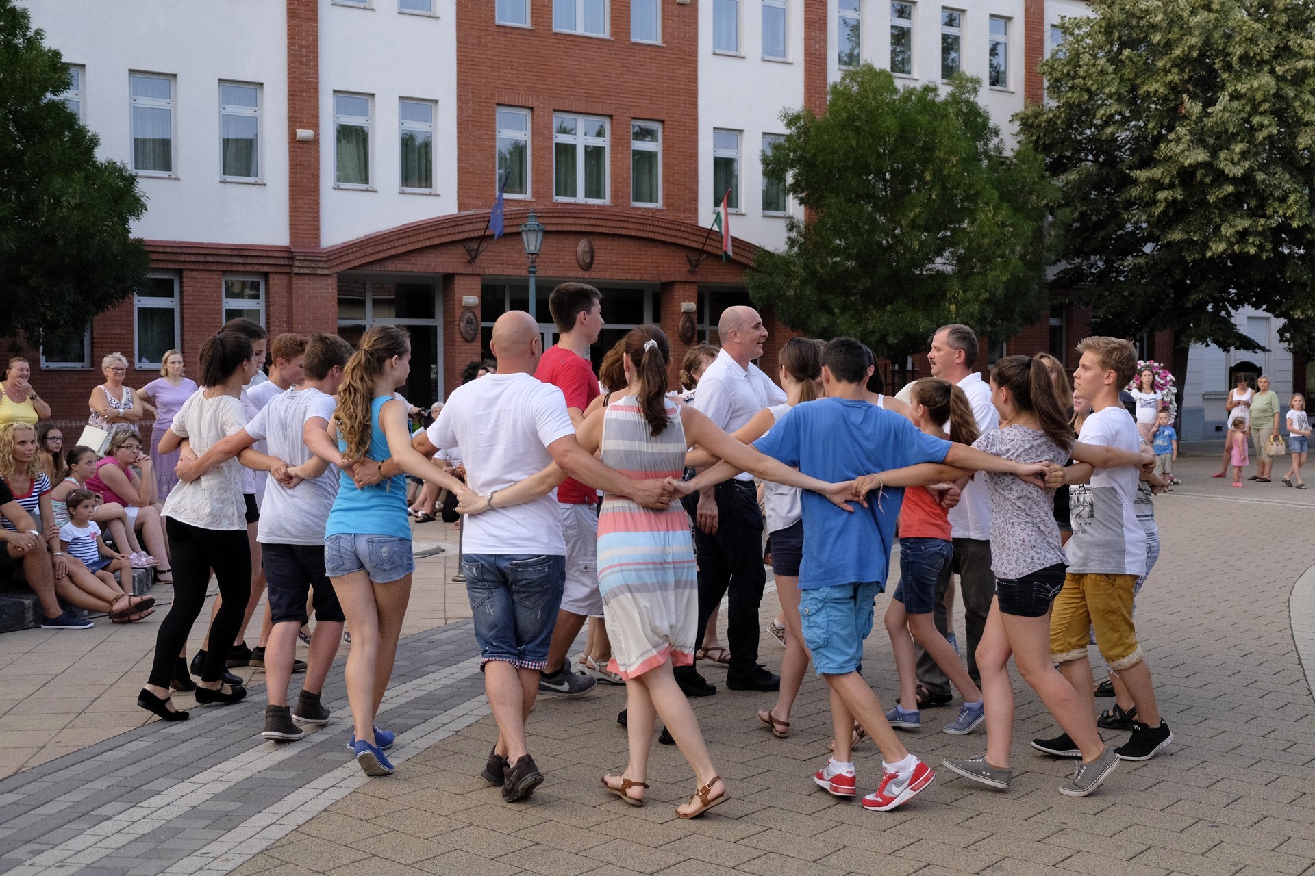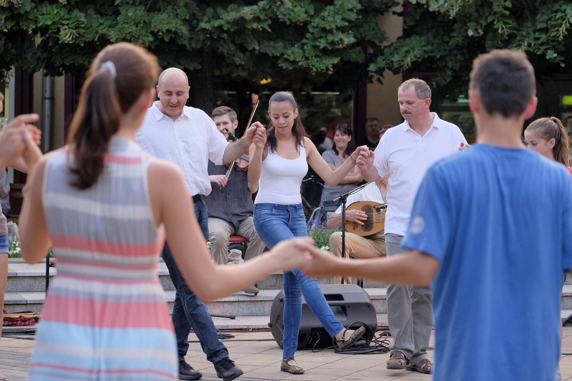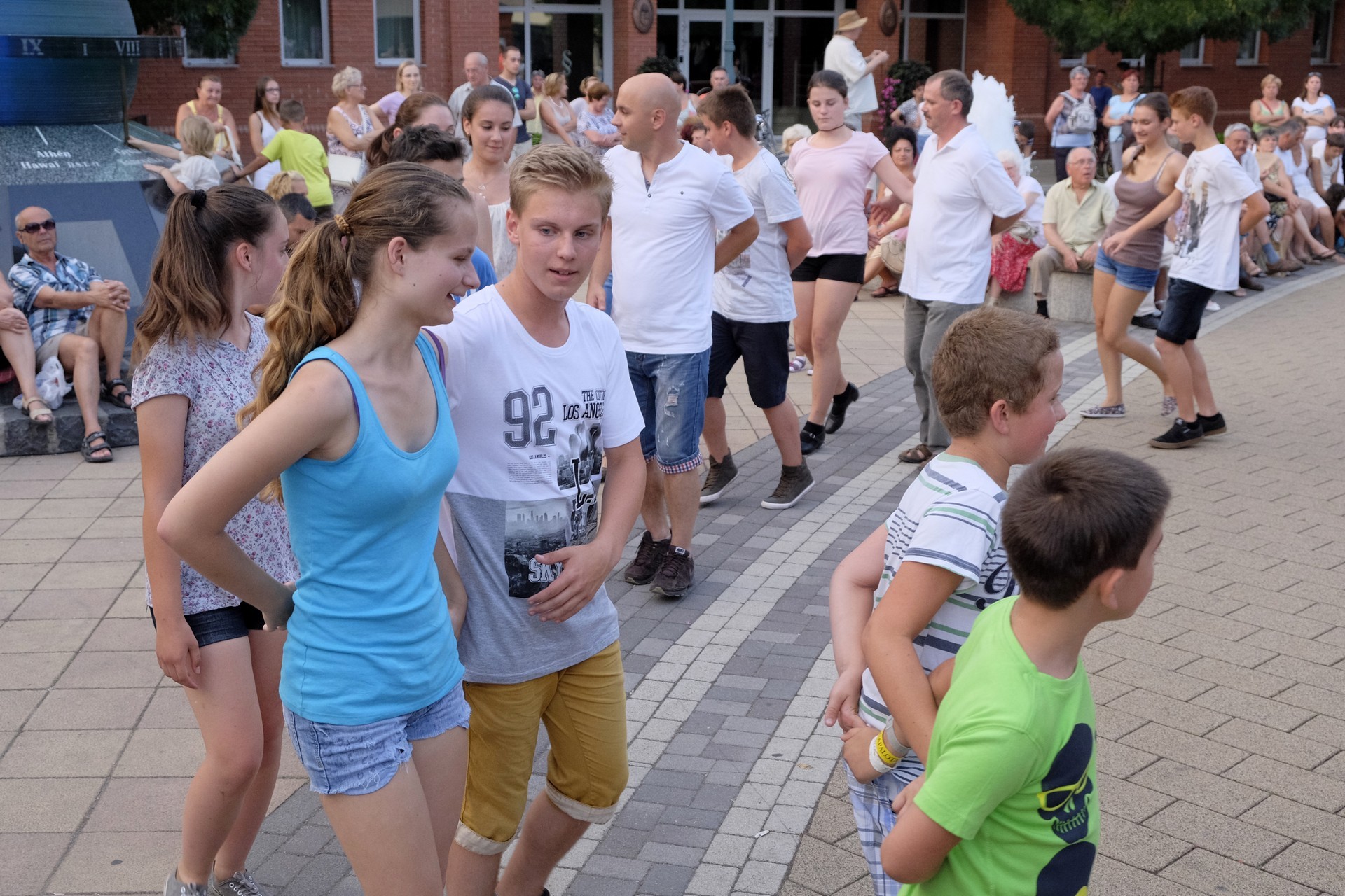 Aznap rekkenő hőség köszöntött ránk, s a lemenő Nap még késő délután is izzasztó erejét fitogtatta előttünk. A fülledt meleg ellenére szépszámú tömeg perdült táncra a téren. A Világórát is körbetáncoló sokaság keménymagját a gyulai Körös Néptáncegyüttes táncosai adták, akik néhány nézelődőt is táncra csábítottak. A csángó magyar táncház Patyi Zoltán művészeti vezető irányításával zajlott, míg a talpalávalóról a később fellépő Mentés Másként Trió gondoskodott.