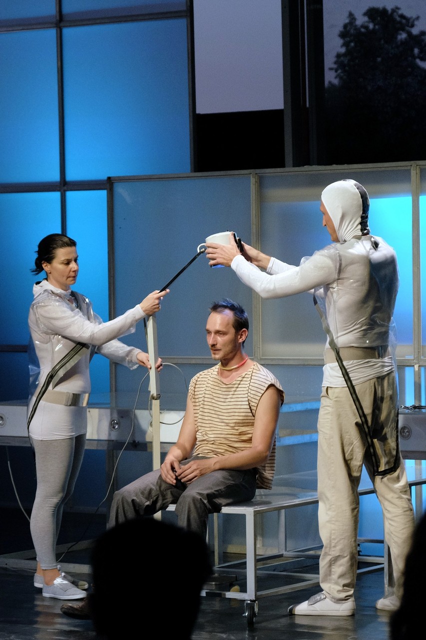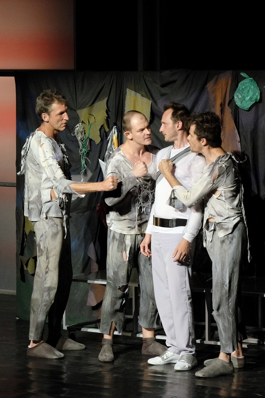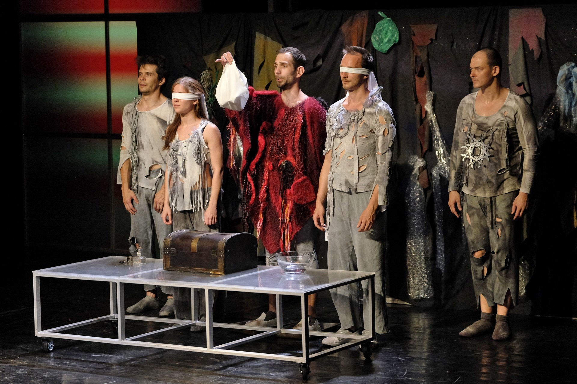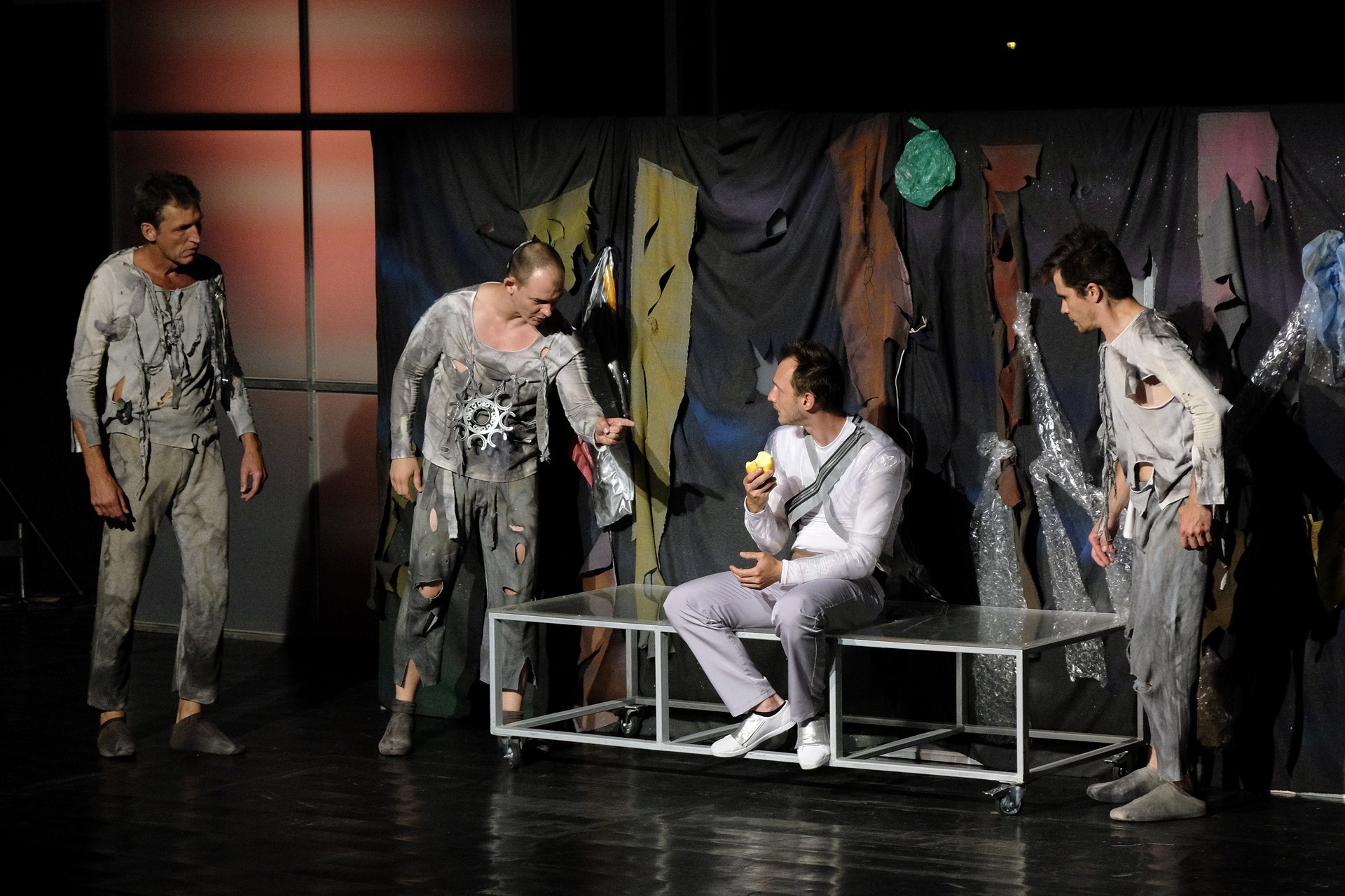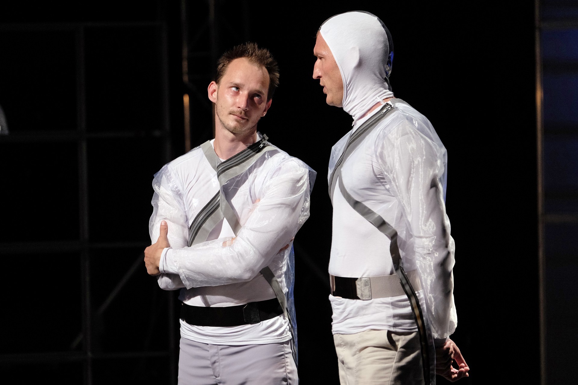 A Jászberényi Gábor formálta Gulliver hol félénk, hol felbátorodó értetlenséggel ismerkedik a hinek világával, de szörnyű tökéletességük mögött egyre kevésbé lel tartalmat, mindent sivárnak és egyformának érez. Zatamon, Molnár Csaba alakításában elnéző fölényességgel igyekszik megértetni és elfogadtatni Gulliverrel abszolút optimális életüket: amit te egyformának látsz, az a mi oldalunkon ugyanolyan jó. Ugyanolyan jó, még akkor is, ha az egyformásítás elpusztítja a művészetet, a játékot vagy a szerelemet, amely mindenkor csak a másmilyenségből táplálkozhat. Azt a szerelmet is, amit Gulliver érez Zolema iránt.