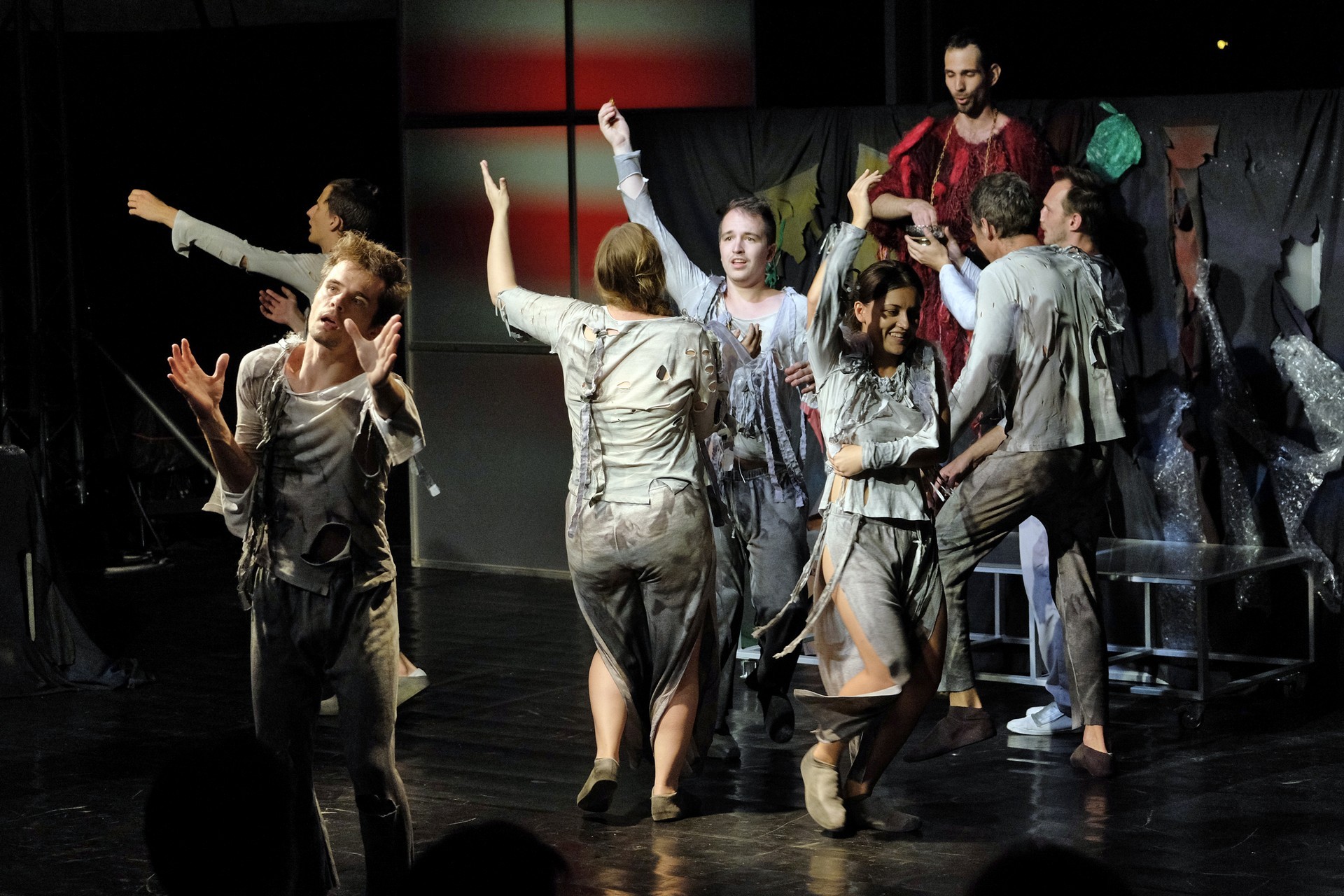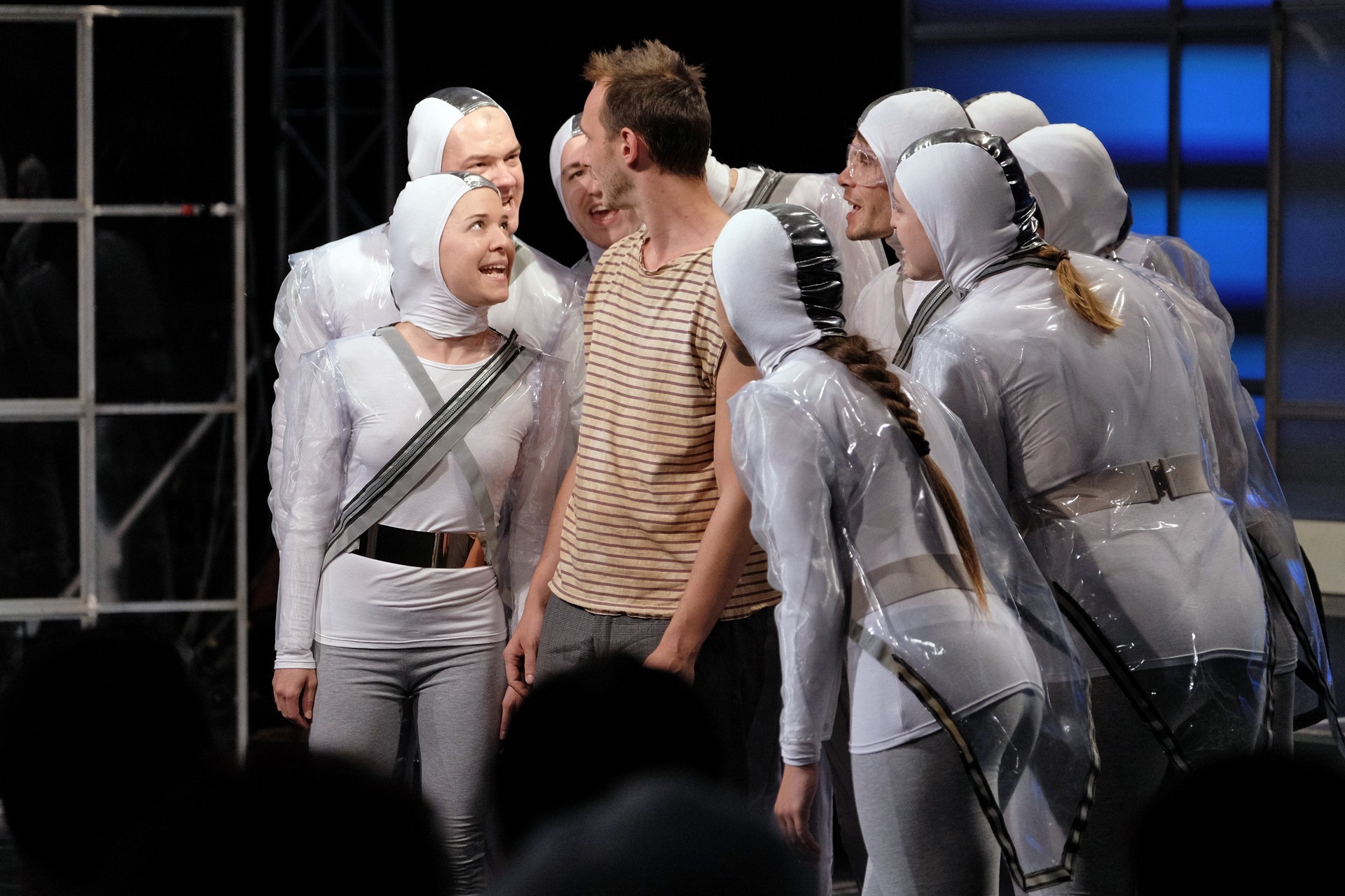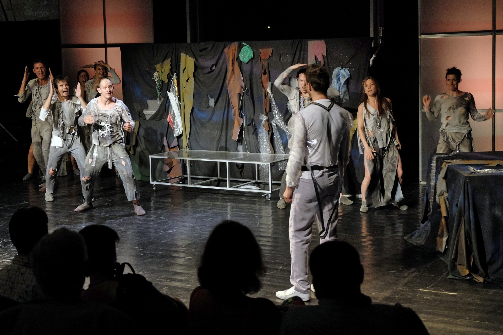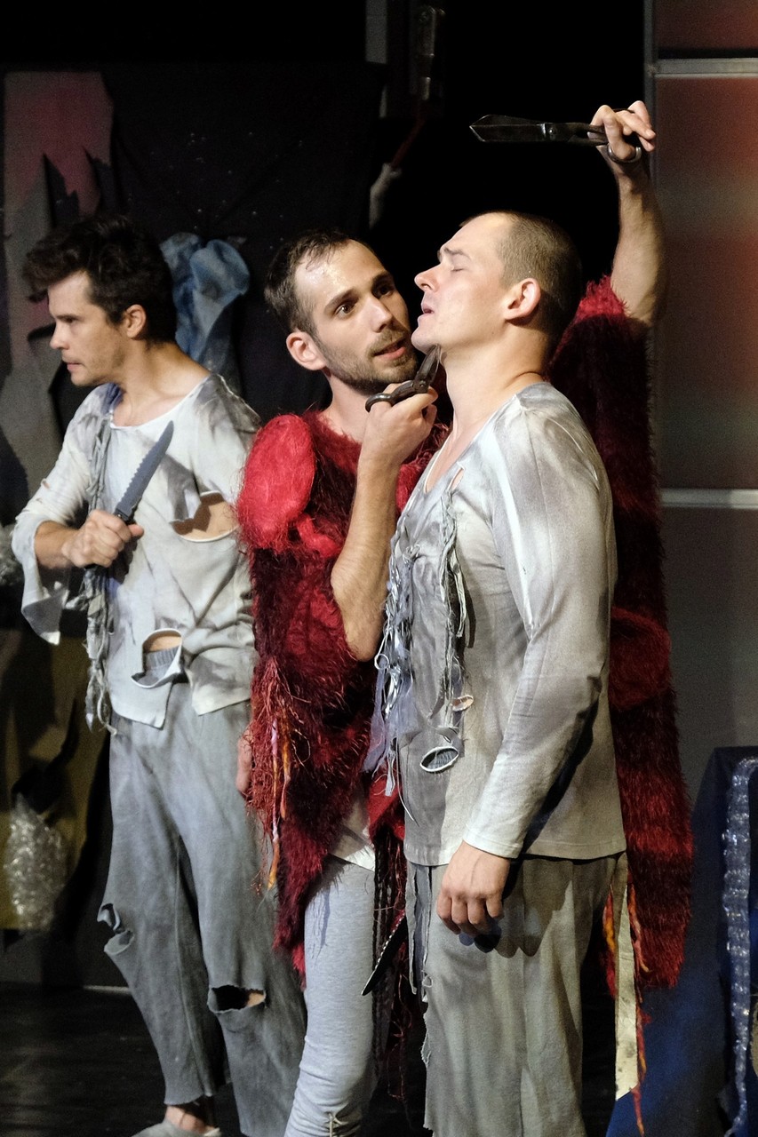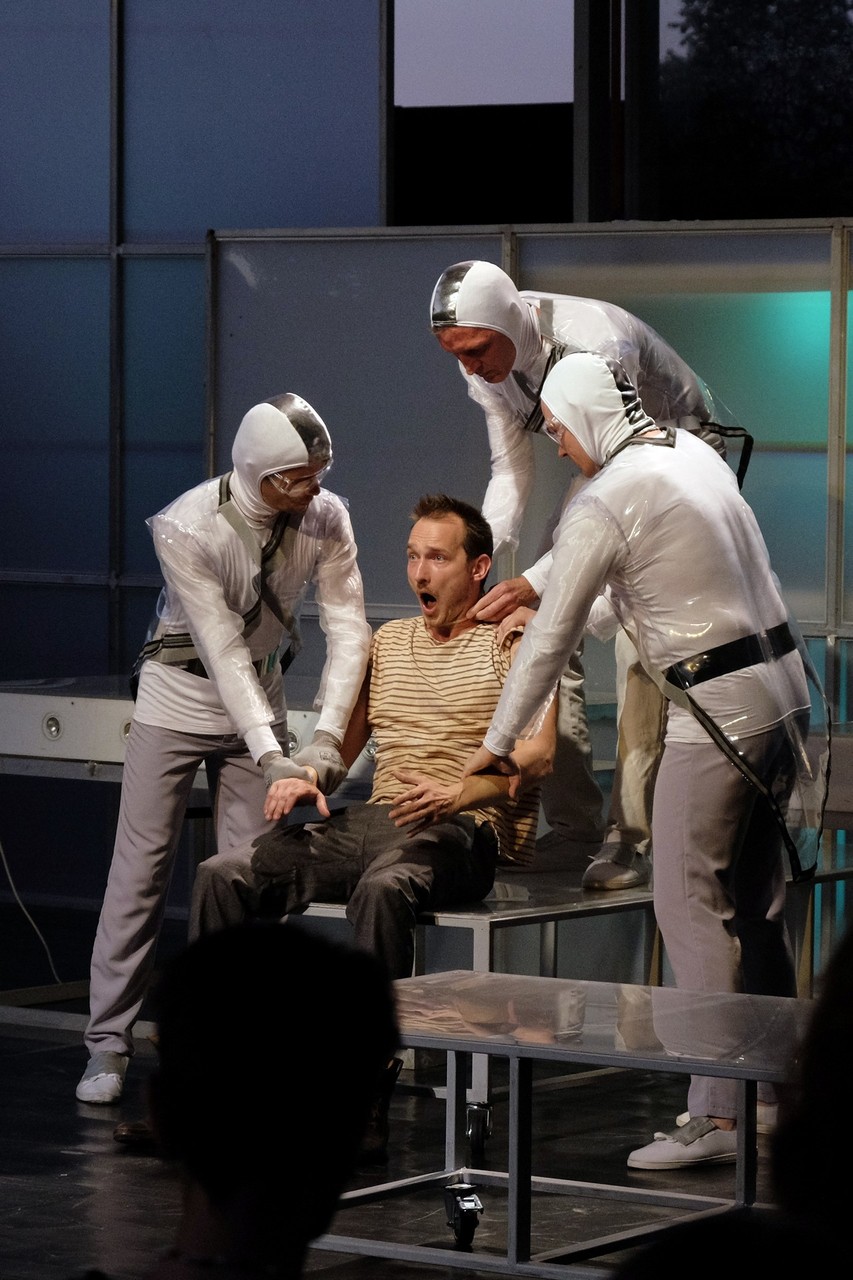 A Jászberényi Gábor formálta Gulliver hol félénk, hol felbátorodó értetlenséggel ismerkedik a hinek világával, de szörnyű tökéletességük mögött egyre kevésbé lel tartalmat, mindent sivárnak és egyformának érez. Zatamon, Molnár Csaba alakításában elnéző fölényességgel igyekszik megértetni és elfogadtatni Gulliverrel abszolút optimális életüket: amit te egyformának látsz, az a mi oldalunkon ugyanolyan jó. Ugyanolyan jó, még akkor is, ha az egyformásítás elpusztítja a művészetet, a játékot vagy a szerelemet, amely mindenkor csak a másmilyenségből táplálkozhat. Azt a szerelmet is, amit Gulliver érez Zolema iránt.