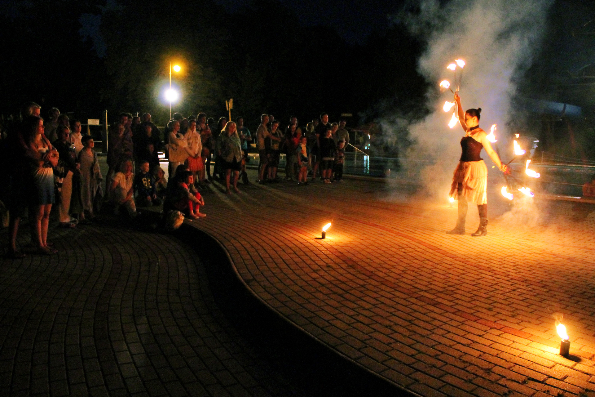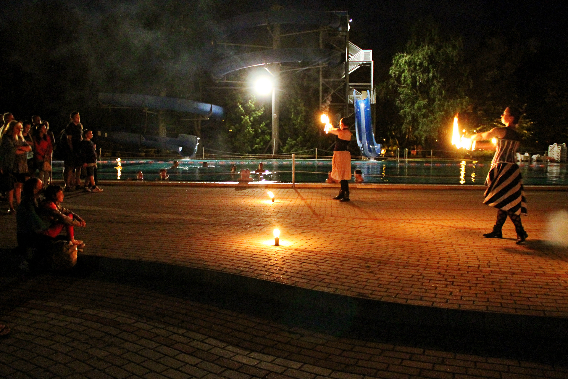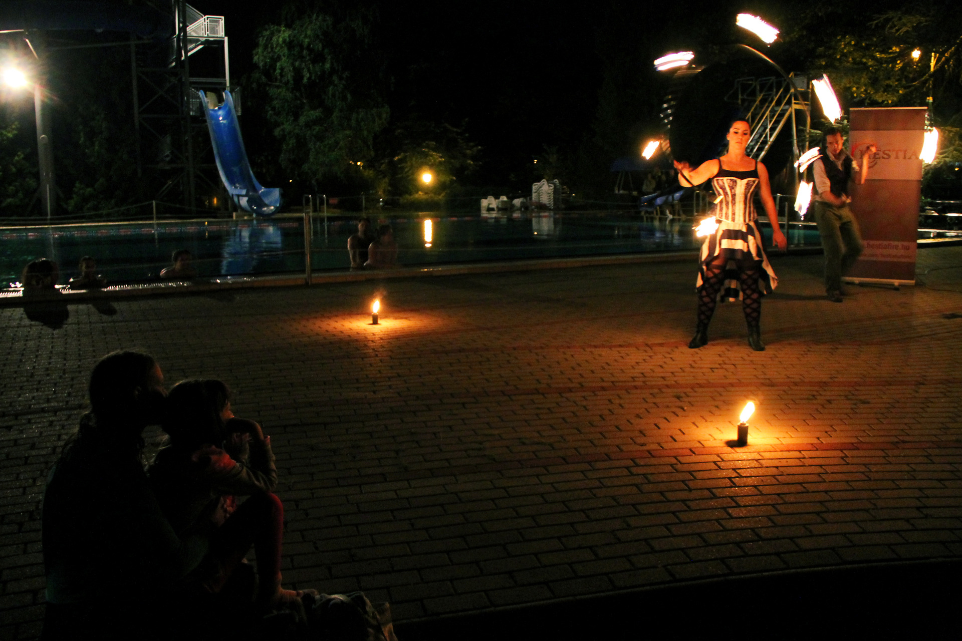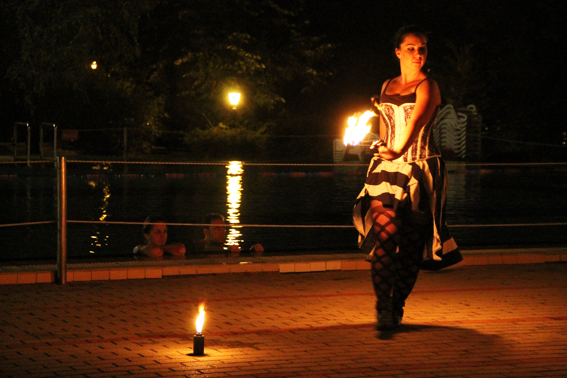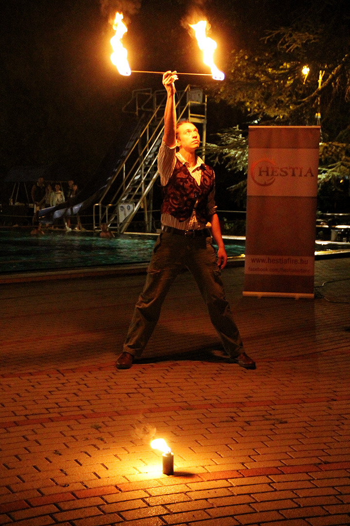Ennek ellenére persze szép számmal akadtak vállalkozó szellemű látogatók is, akik fittyet hányva a hűvös időre, a trópusi vízpartok miliőjét idéző bár helyett inkább a fürdőzést választották. A strandolók java a melegebb gyógyvízben mártózott meg, míg a többiek a másik két medencében lubickoltak, s fél óránként a „hullámokat is meglovagolták”. 10 óra fele a szentesi Hestia tűzzsonglőr csapat jóvoltából egy látványos tűz show "melengette a résztvevőket".