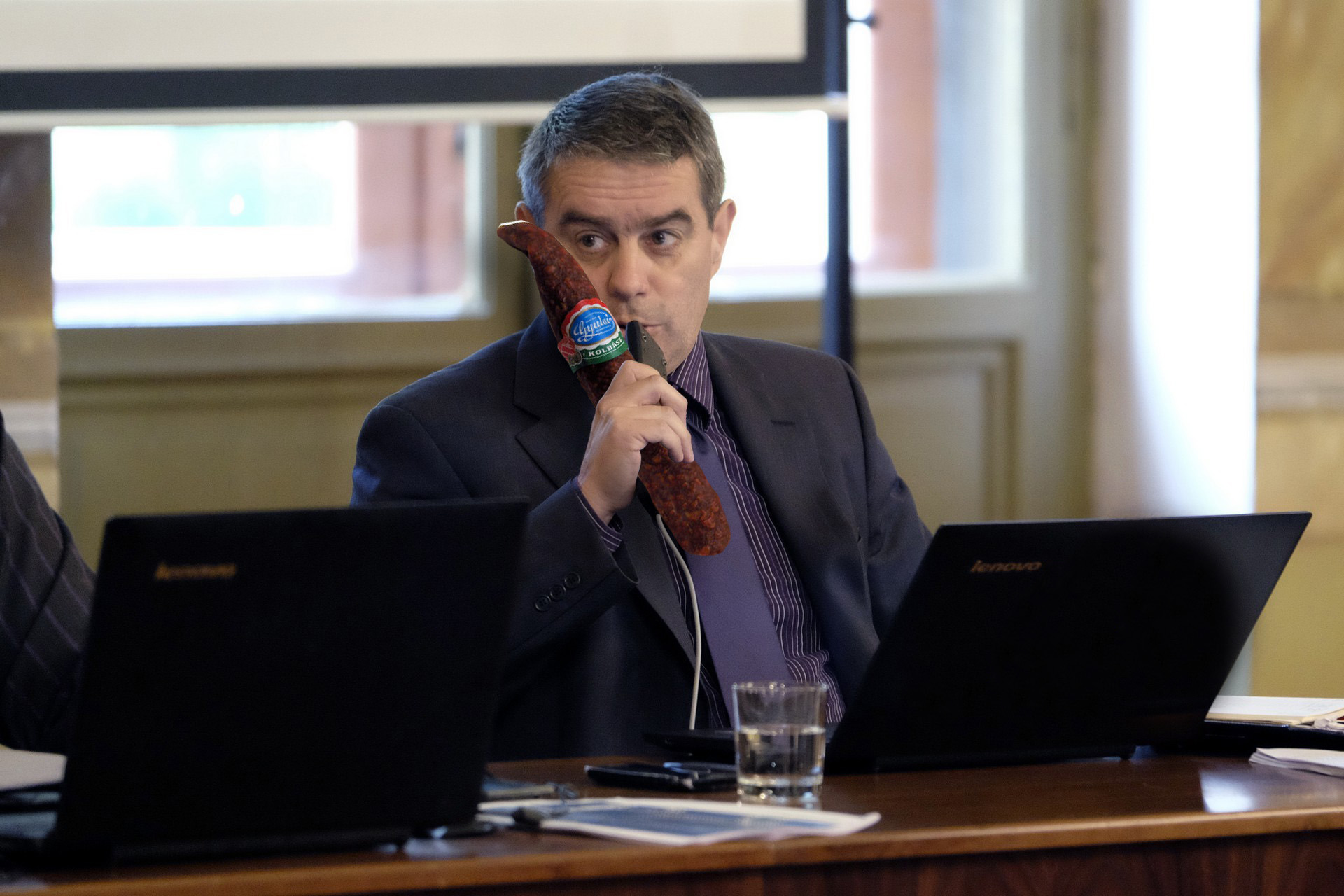 Bod Tamás és a gyulai kolbász találkozása a városházán. Képünk illusztráció