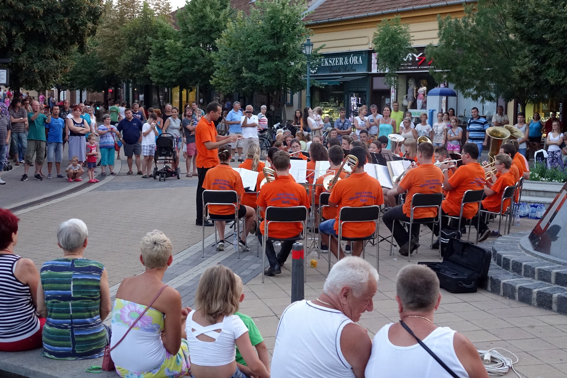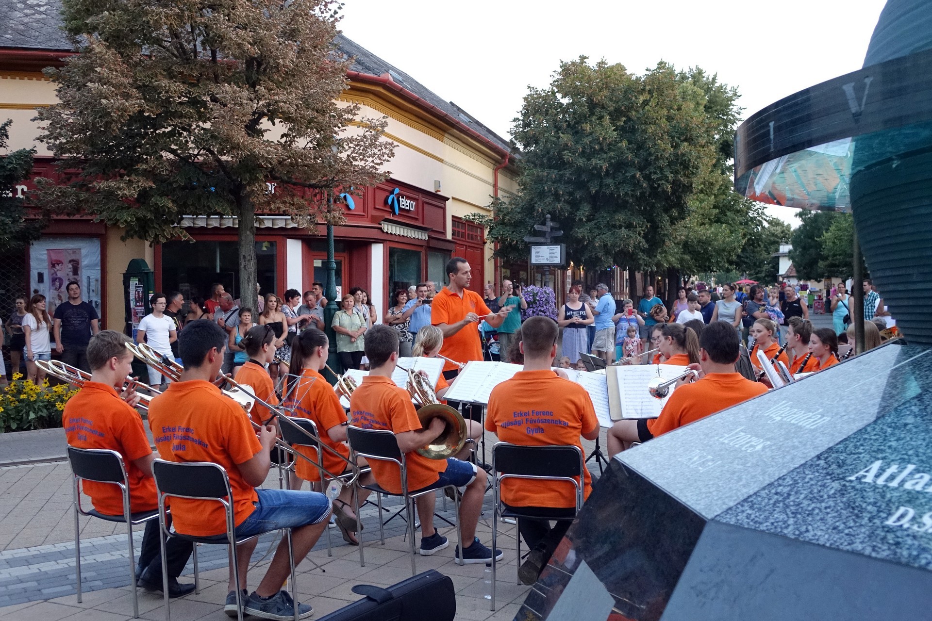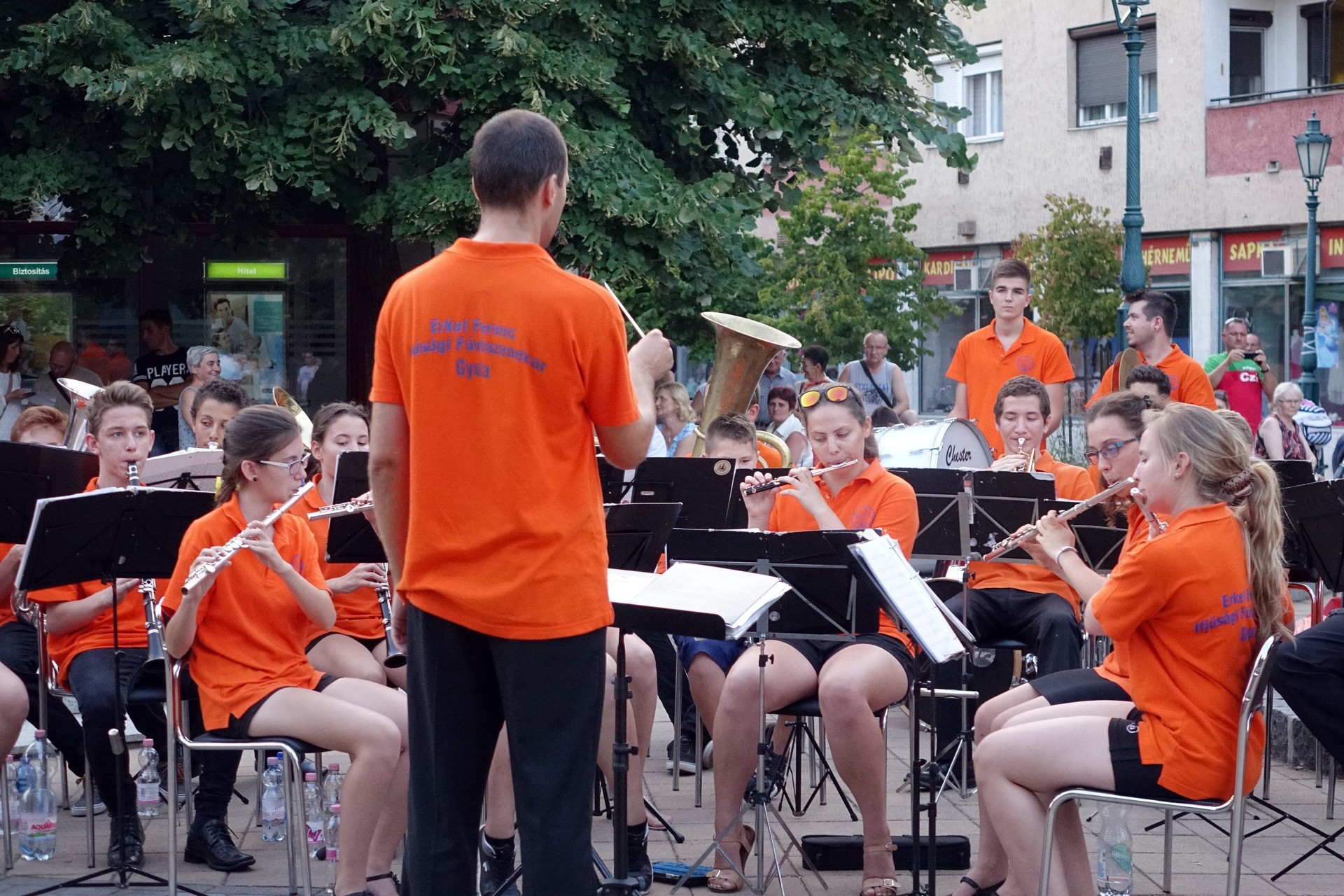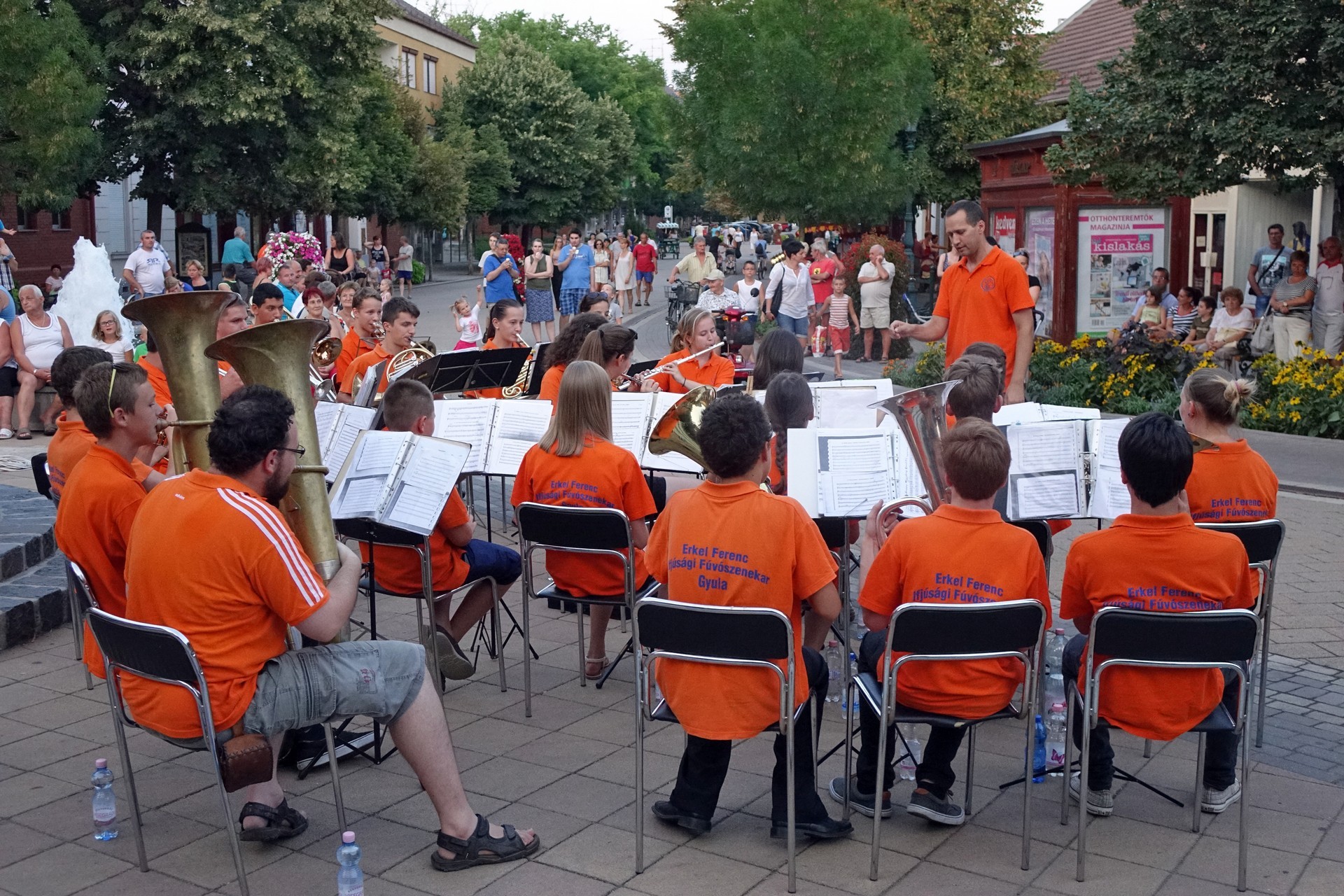 Panaszkodhatunk a nagy kánikulára, a szárazság előnye azonban, hogy nem kell tartani attól, hogy leszakad az ég, és egy nagyzenekar is bátran kiköltözhet a sétáló utcára, hogy szórakoztassa a nagyérdeműt. Ahogy a botcsinálta fizikusok is mondják az idő-tömeg-tér viszonyáról: Ha jó az idő, lemegy a tömeg a térre. Az Erkel Ferenc Ifjúsági Fúvószenekar tömegvonzása pedig hatott.
