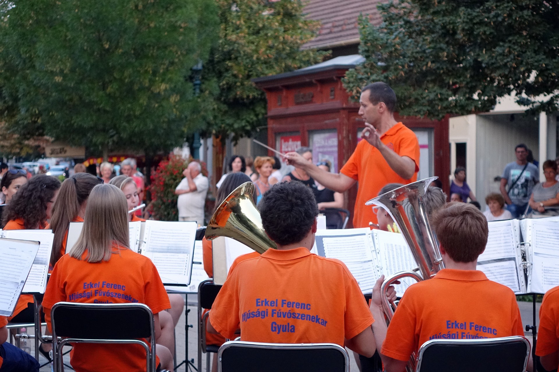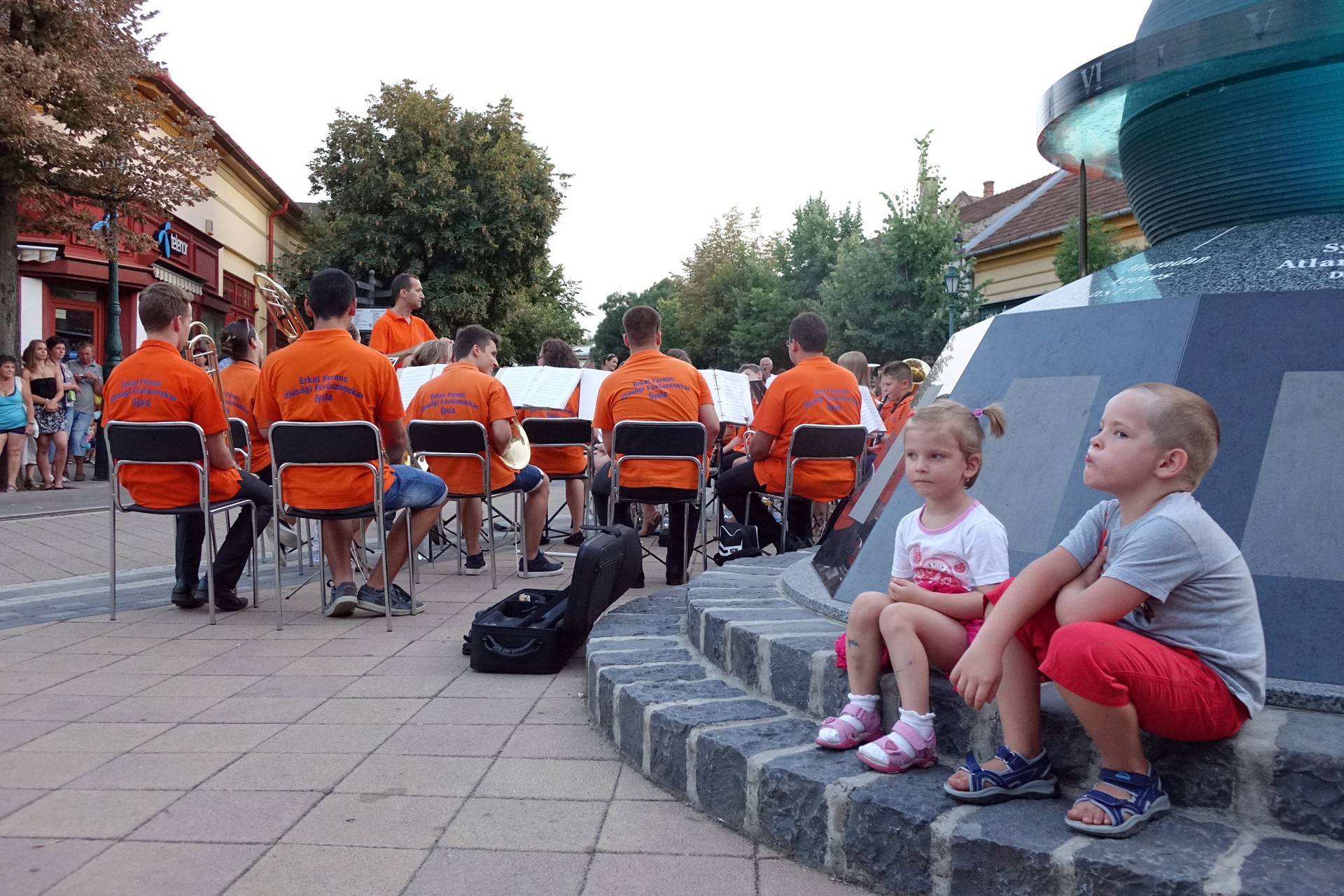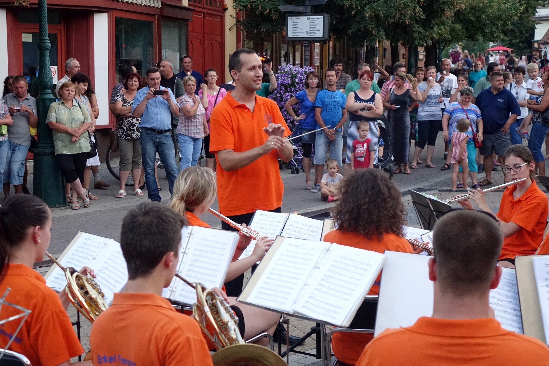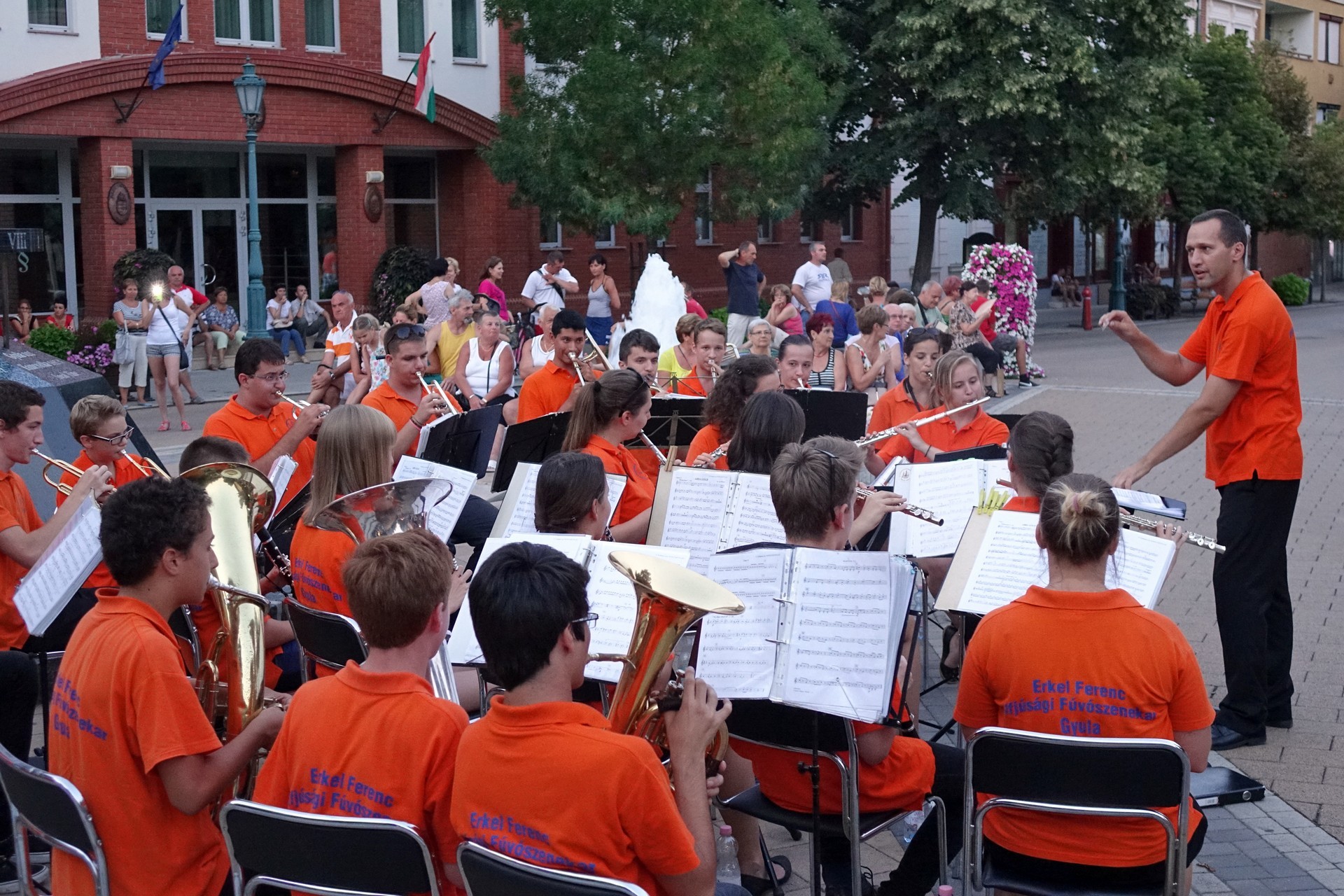 Panaszkodhatunk a nagy kánikulára, a szárazság előnye azonban, hogy nem kell tartani attól, hogy leszakad az ég, és egy nagyzenekar is bátran kiköltözhet a sétáló utcára, hogy szórakoztassa a nagyérdeműt. Ahogy a botcsinálta fizikusok is mondják az idő-tömeg-tér viszonyáról: Ha jó az idő, lemegy a tömeg a térre. Az Erkel Ferenc Ifjúsági Fúvószenekar tömegvonzása pedig hatott.